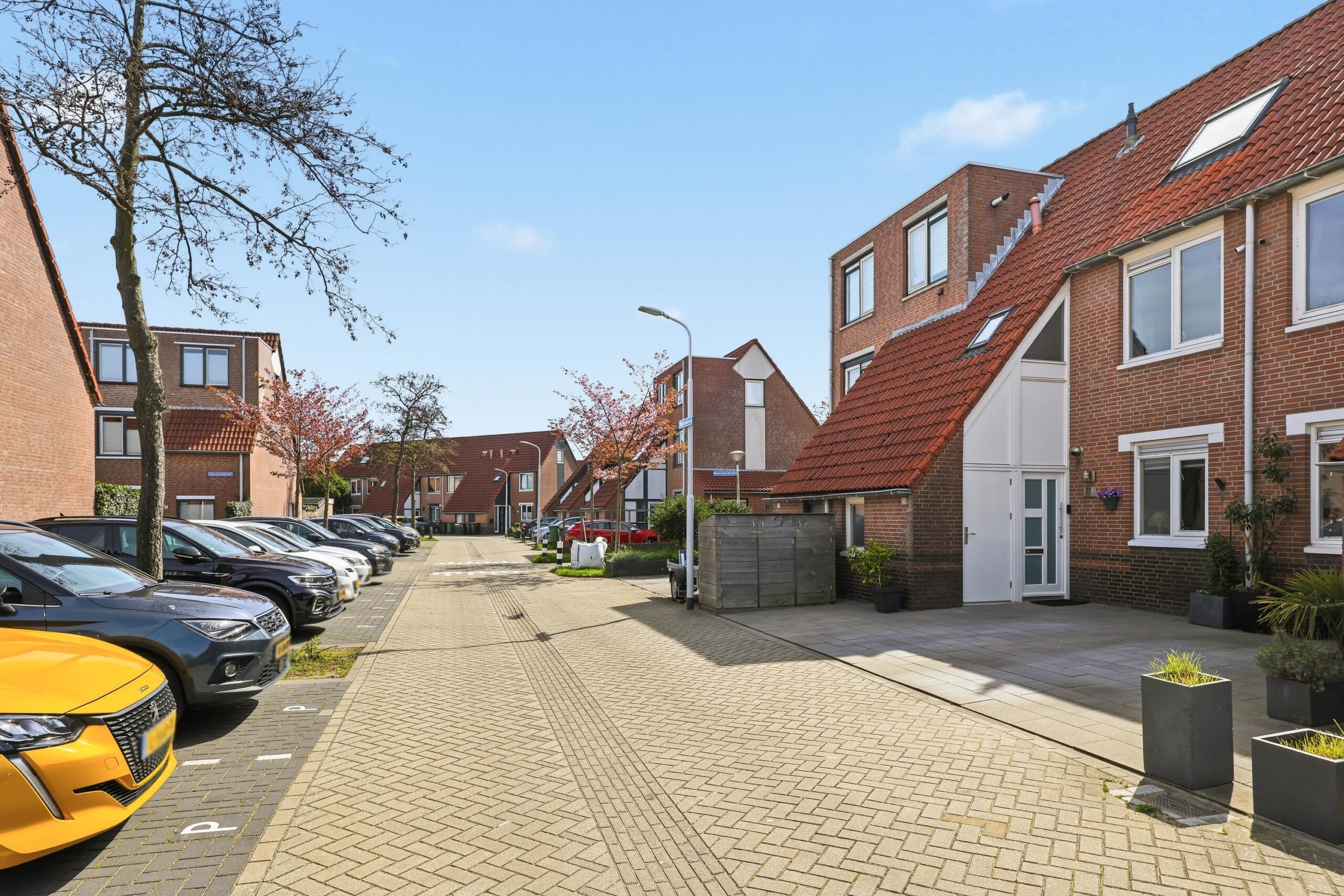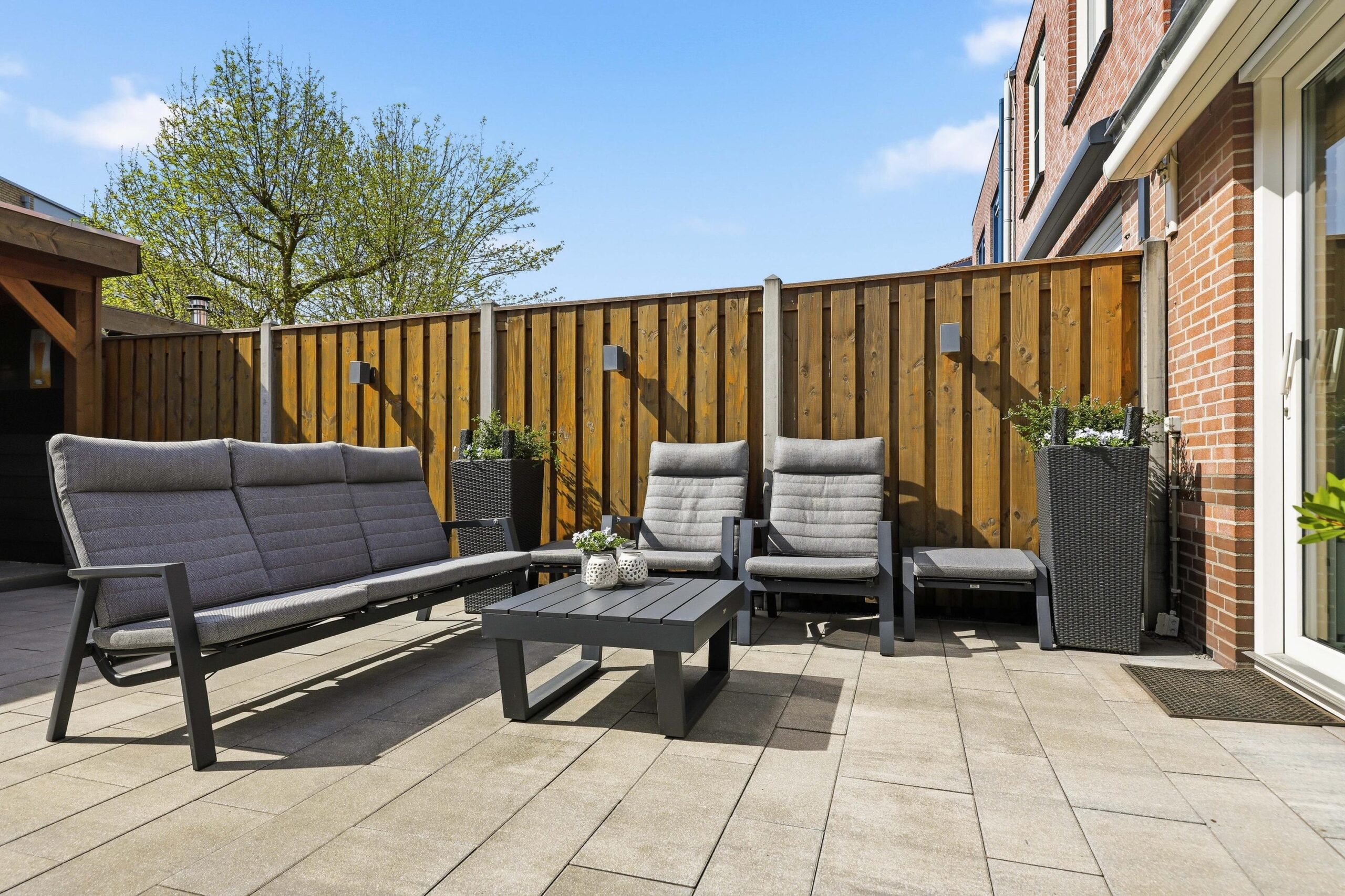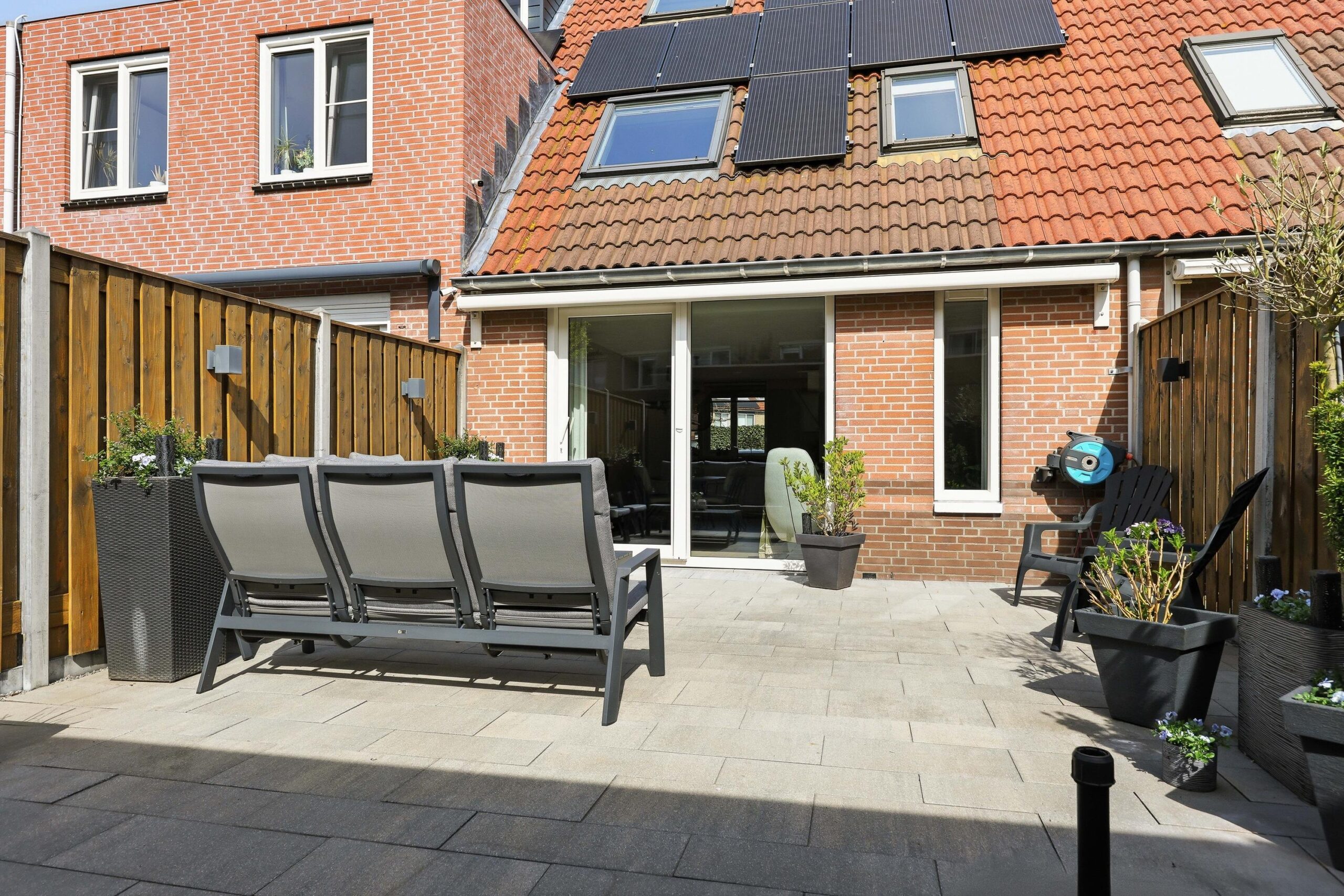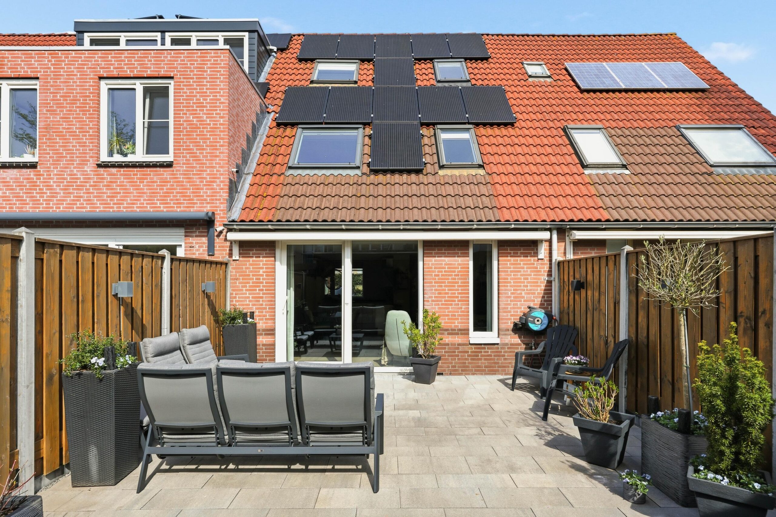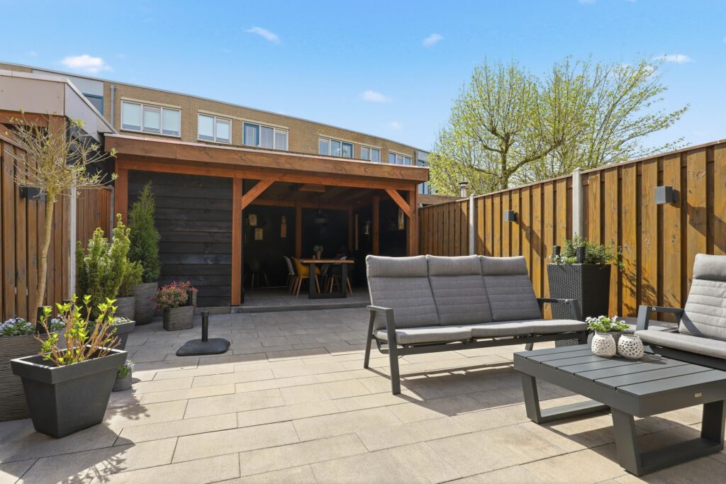 Via de schuifpui stap je de verzorgde achtertuin in. Hier geniet je volop van privacy en rust. De sfeervolle veranda van zwart Douglas hout met heater maakt dit een heerlijke plek om vrijwel het hele jaar door buiten te zitten. De achtertuin beschikt ook over een zonnescherm met een uitval van 3 meter over de gehele breedte van de woning. Verder beschikt de tuin over een berging en een praktische afsluitbare achterom. Aan de voorzijde parkeer je comfortabel op eigen terrein.