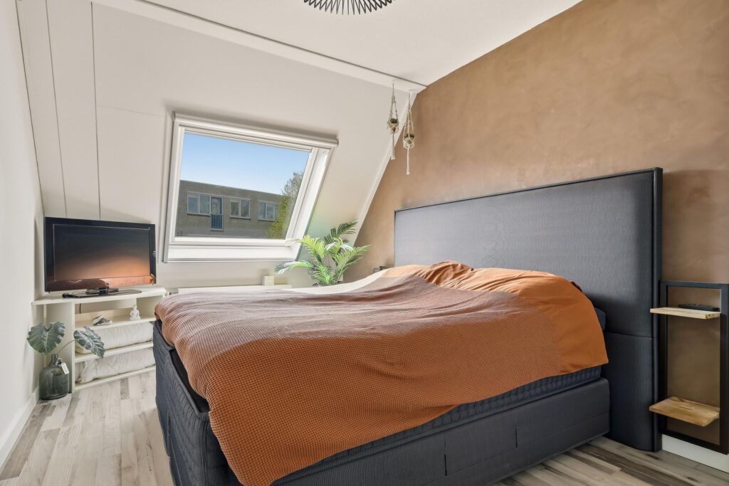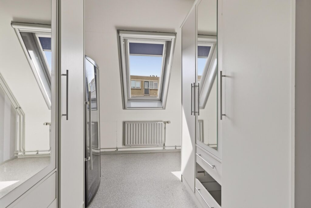 De tweede verdieping is bereikbaar via een vaste trap en biedt nog eens extra ruimte. Op de voorzolder vind je de aansluitingen voor wasmachine en droger, de cv-opstelling (Intergas, 2020) en extra bergruimte. Daarnaast is hier de vierde slaapkamer gerealiseerd, voorzien van dakraam aan de voor- en achterkant. Een ideale verdieping als slaapkamer, thuiswerkplek of hobbyruimte.