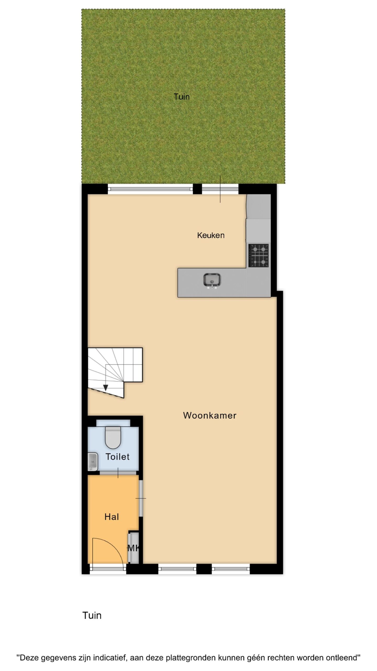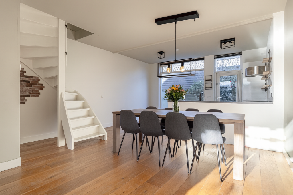 De benedenverdieping bestaat uit een ruime woonkamer en open keuken met een afgesloten hal en apart toilet bij de voordeur. In de mooie keuken zijn in 2024 een nieuwe vaatwasser en oven geplaatst. Vanuit de woonkeuken stap je zo in de beschutte tuin van ruim 20 m². Hierin kan je, door de ligging op het zuidwesten, heerlijk genieten van de zon.