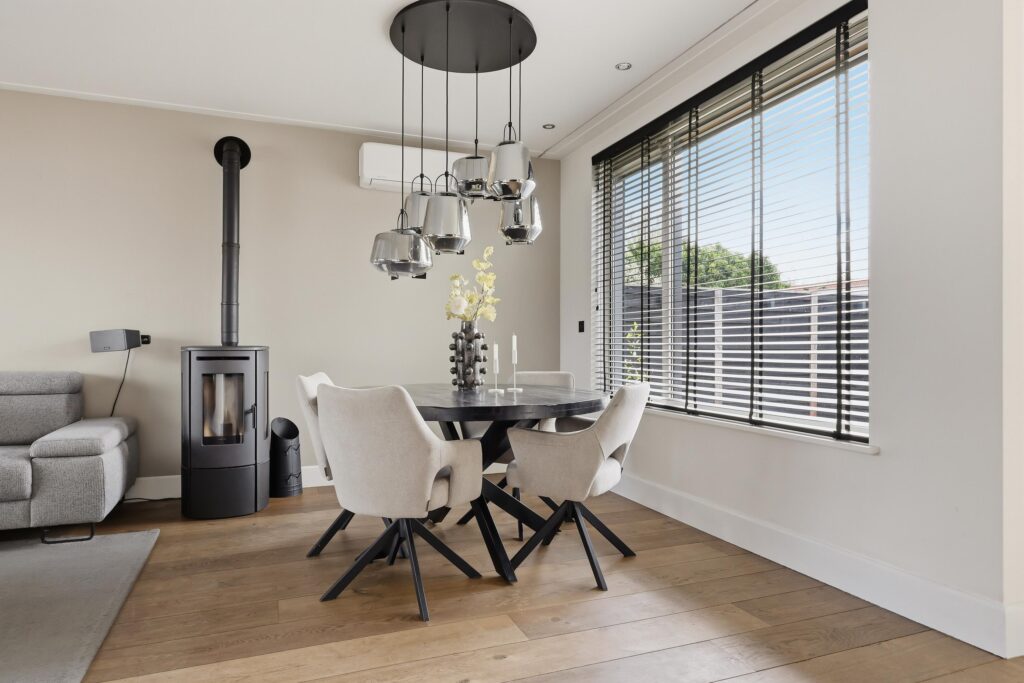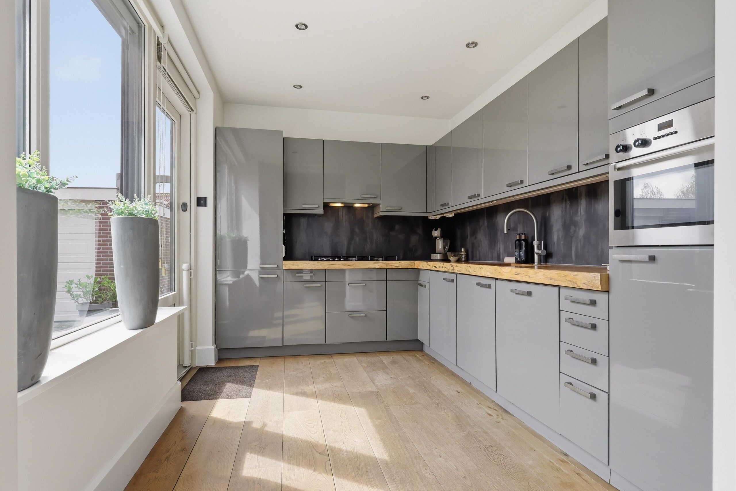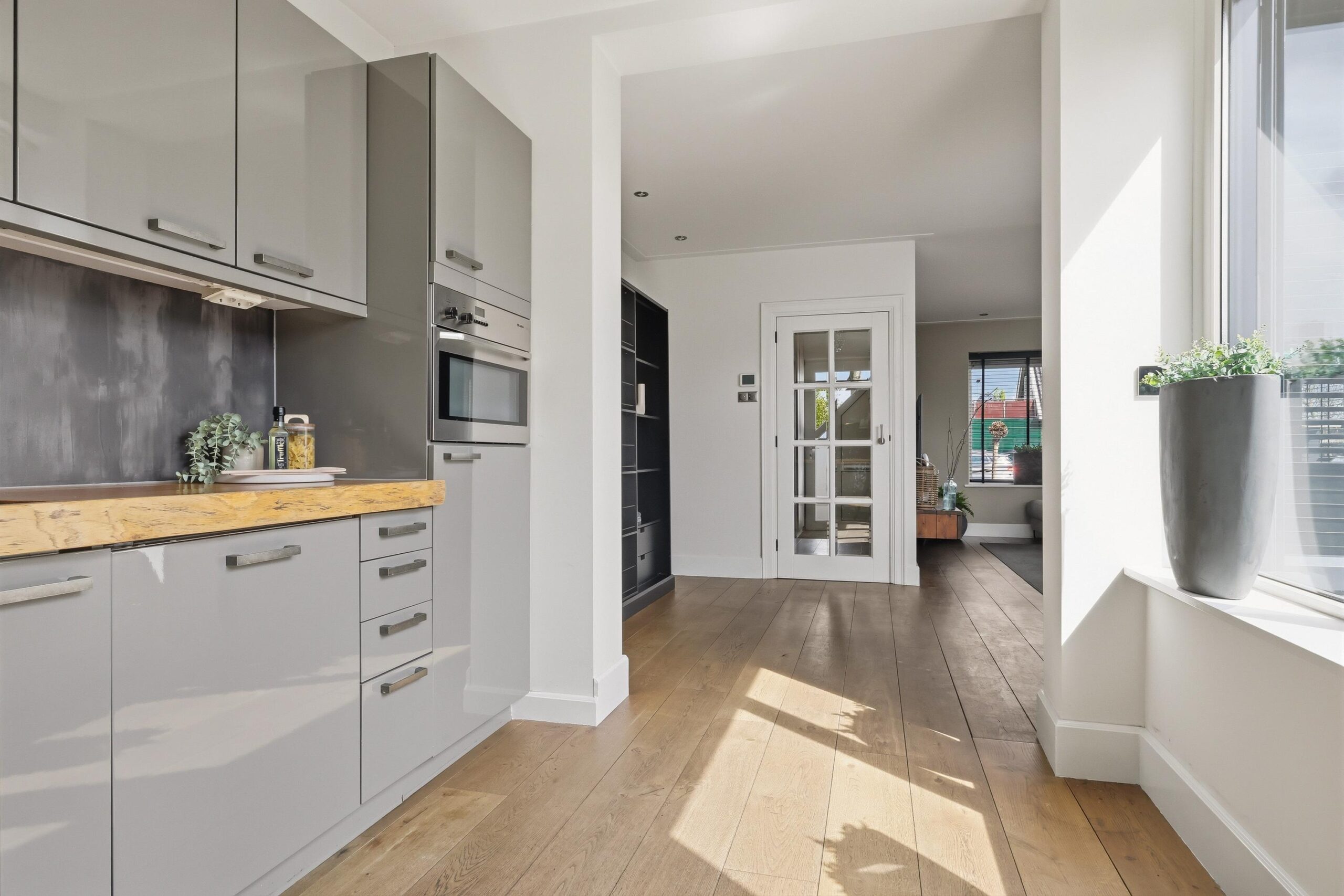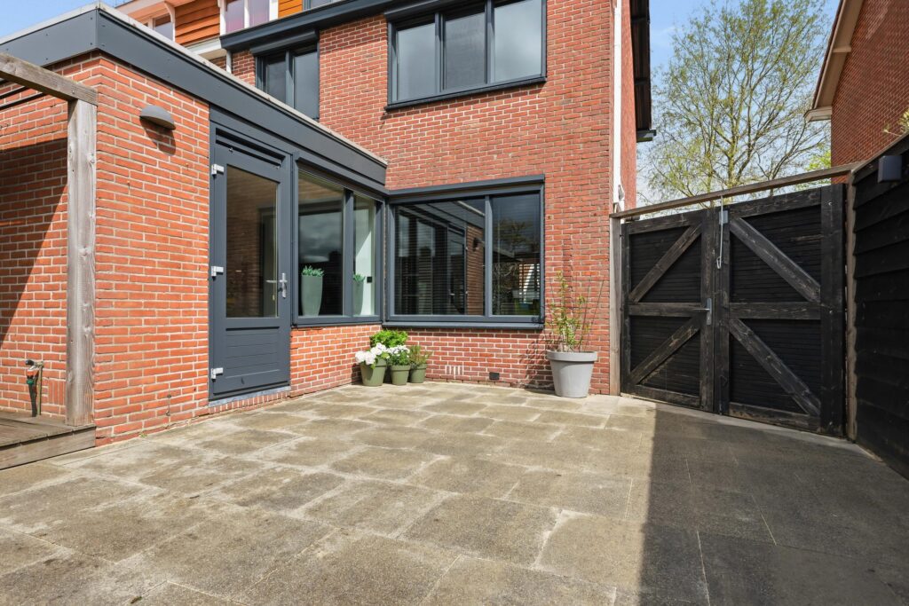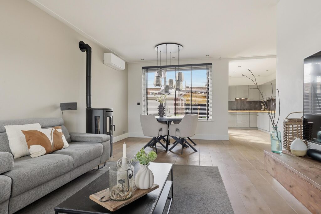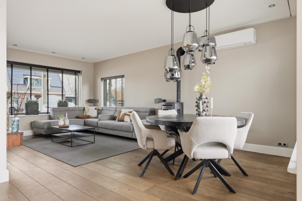 Via de voortuin bereik je de entree van de woning, waar direct de verzorgde afwerking en het praktische karakter opvallen. De hal biedt toegang tot de woonkamer, die dankzij de keukenuitbouw heerlijk ruim is en een prettige lichtinval heeft. De combinatie van vloerverwarming, een sfeervolle pelletkachel en airconditioning zorgt hier het hele jaar door voor een aangenaam binnenklimaat. Aan de achterzijde bevindt zich de open keuken, voorzien van diverse inbouwapparatuur en een Quooker-kraan, met zicht op de tuin. Vanuit de woonkamer loop je zo de diepe achtertuin in, waar je kunt genieten van rust en privacy.
