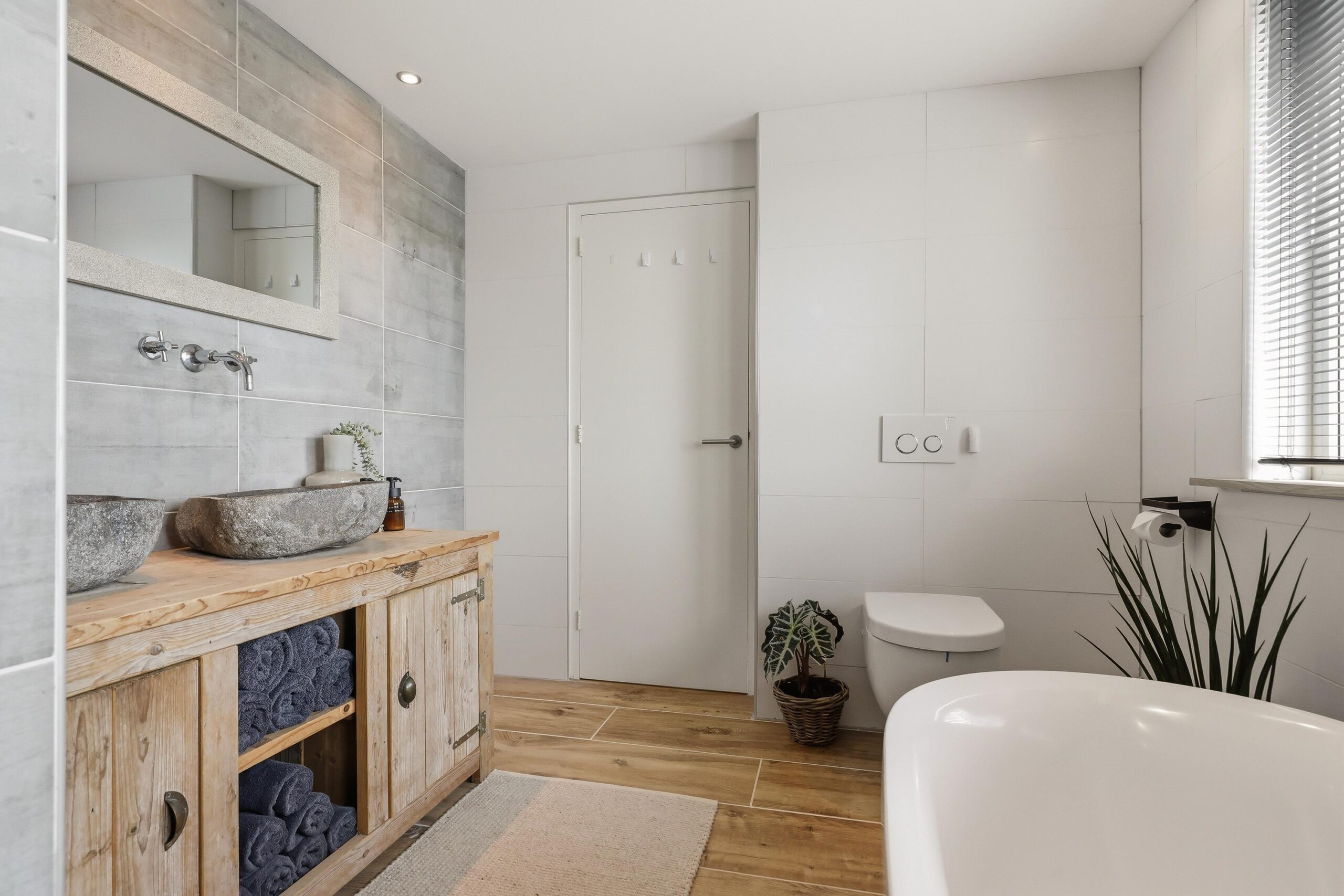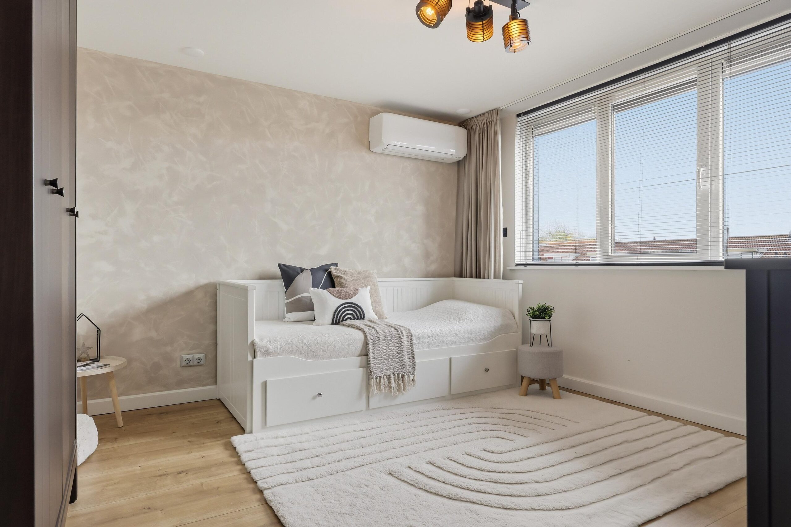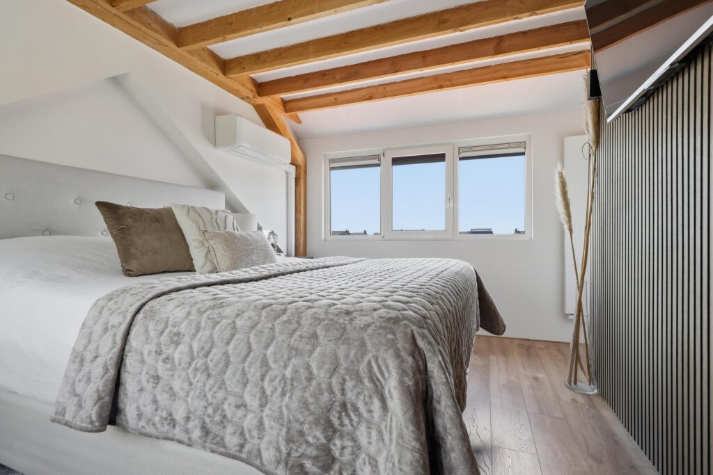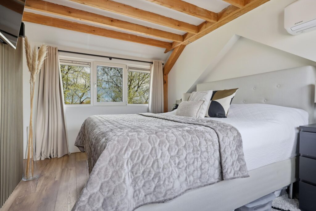 Op de verdieping bevinden zich meerdere slaapkamers, allen voorzien van airconditioning, wat zorgt voor optimaal comfort tijdens warme dagen. De badkamer is modern en stijlvol uitgevoerd en beschikt over vloerverwarming, wat het geheel extra aangenaam maakt. De tweede verdieping, vergroot middels een dakopbouw in 2018, is via een vaste trap bereikbaar en ingericht als een royale hoofdslaapkamer. Deze slaapkamer kan eenvoudig worden gesplitst in twee verschillende slaapkamers.