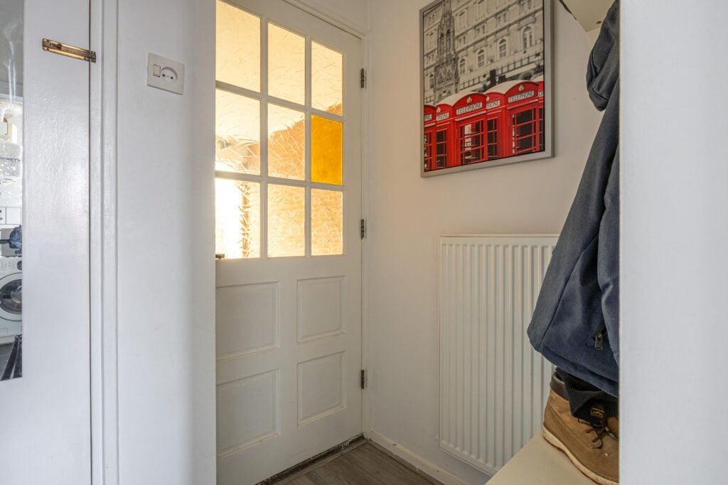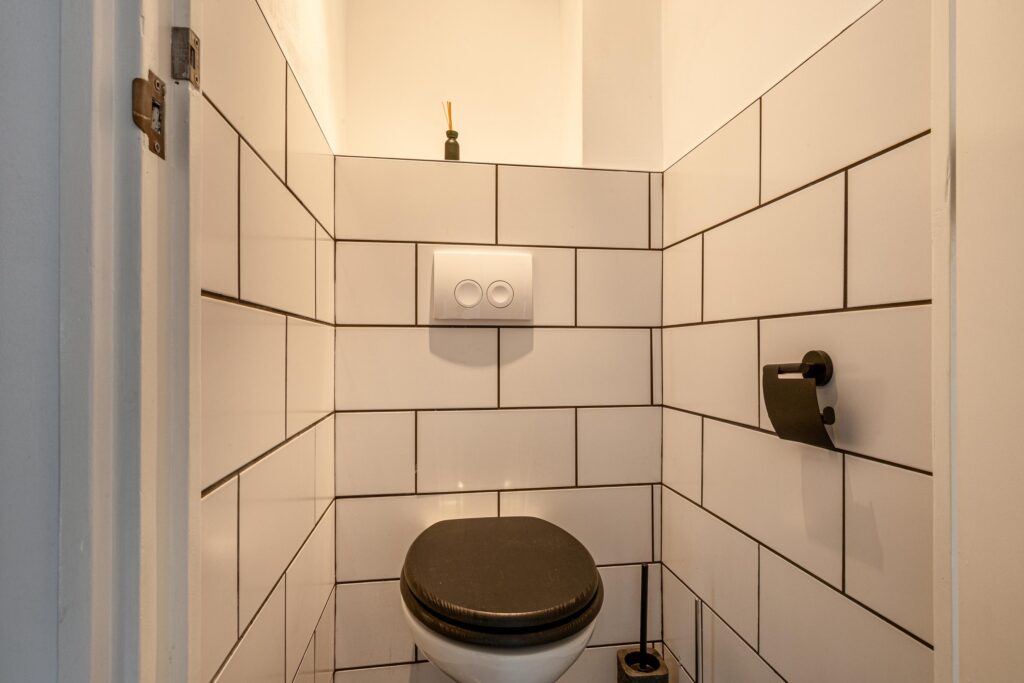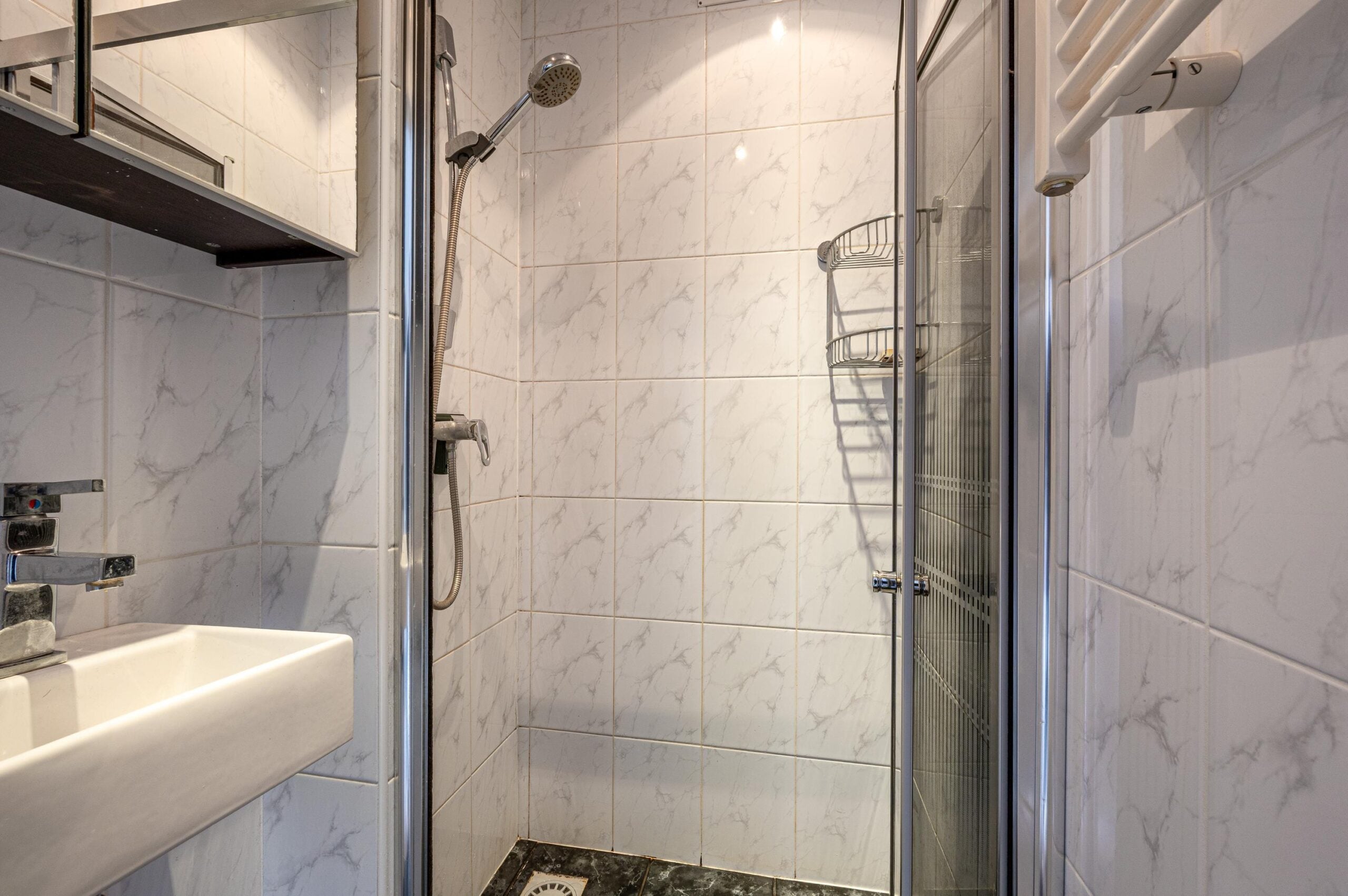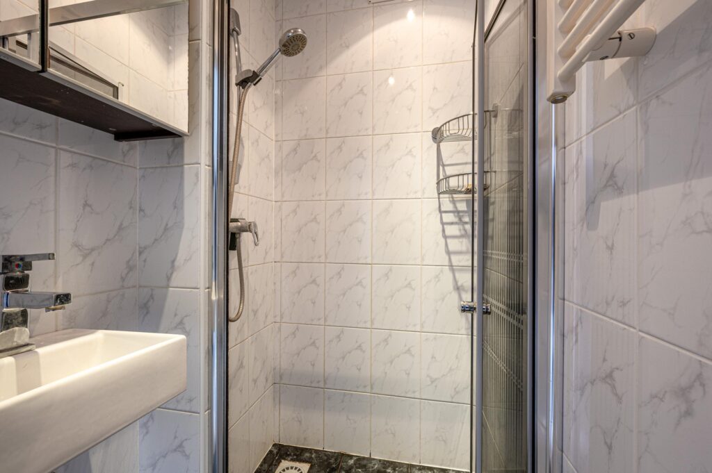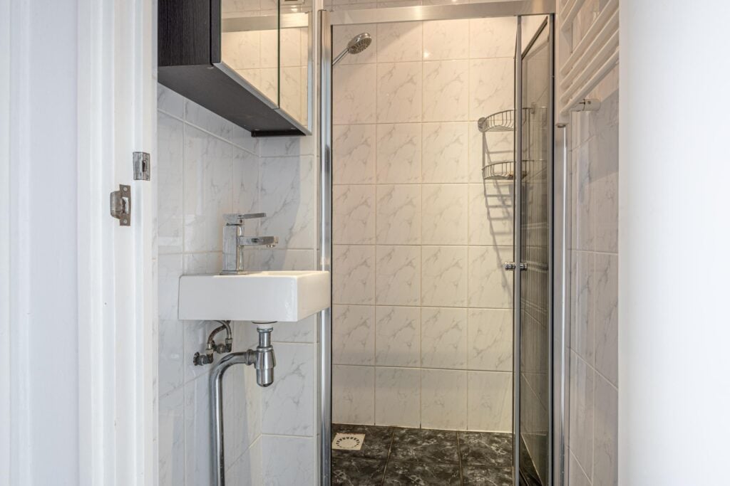 De badkamer is voorzien van een douchecabine, fonteintje, designradiator en strak tegelwerk.