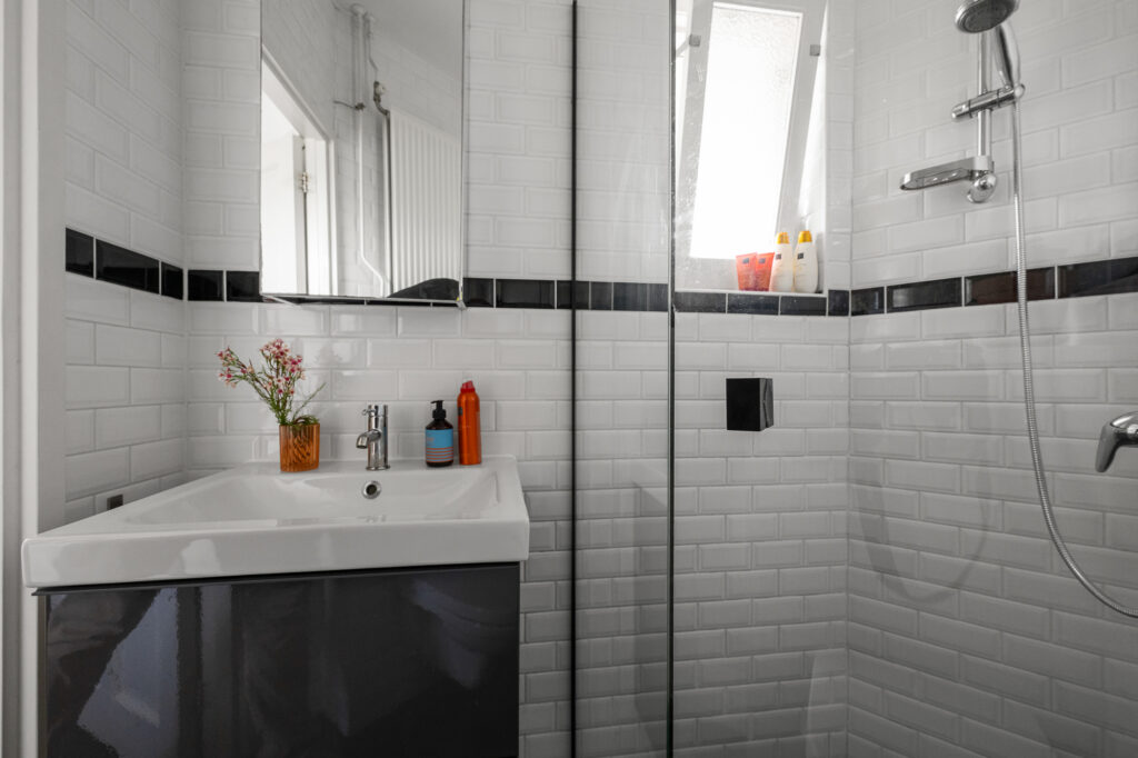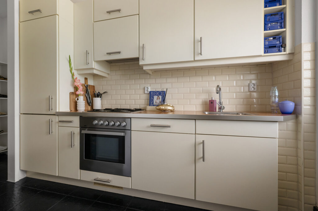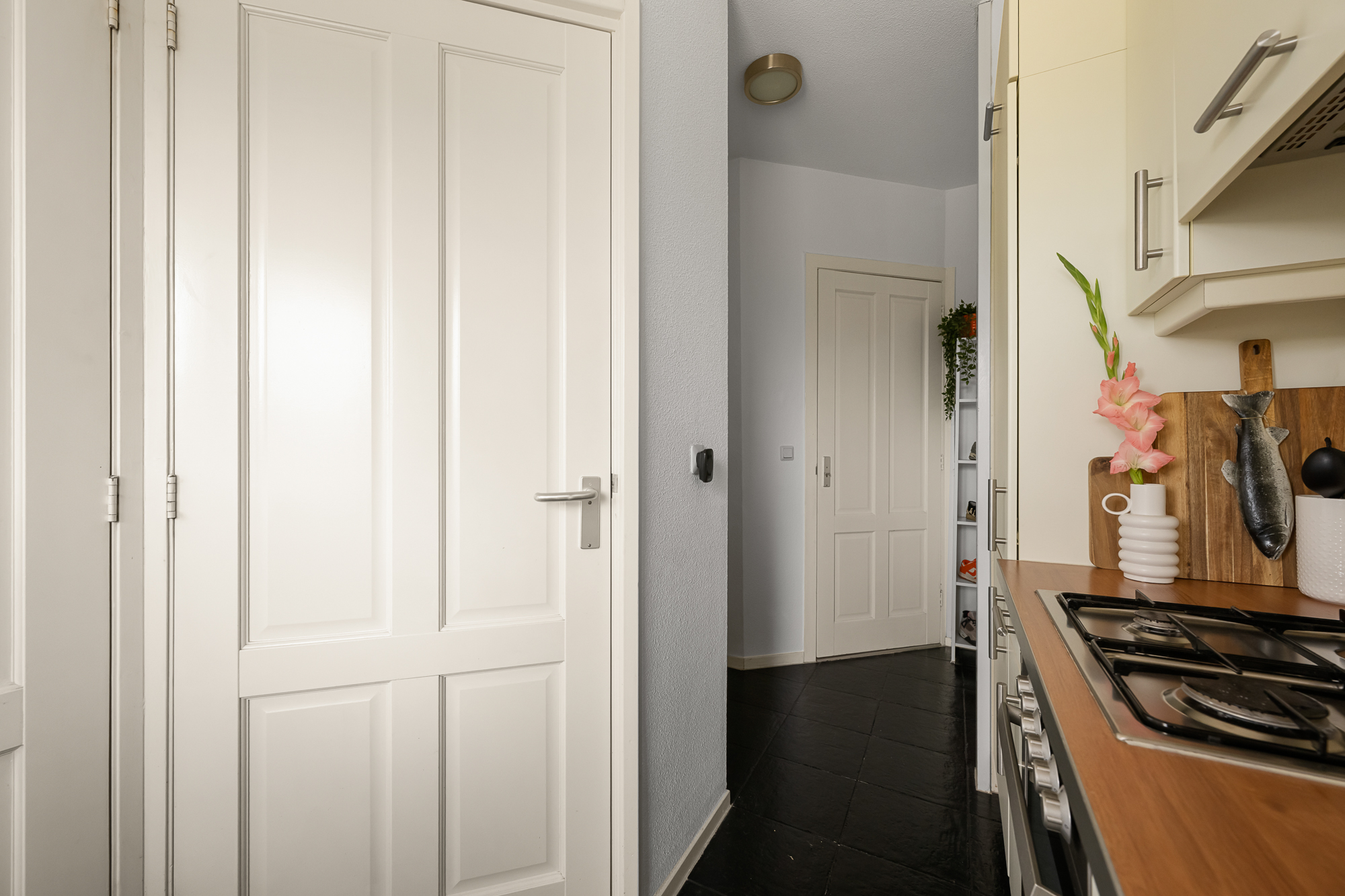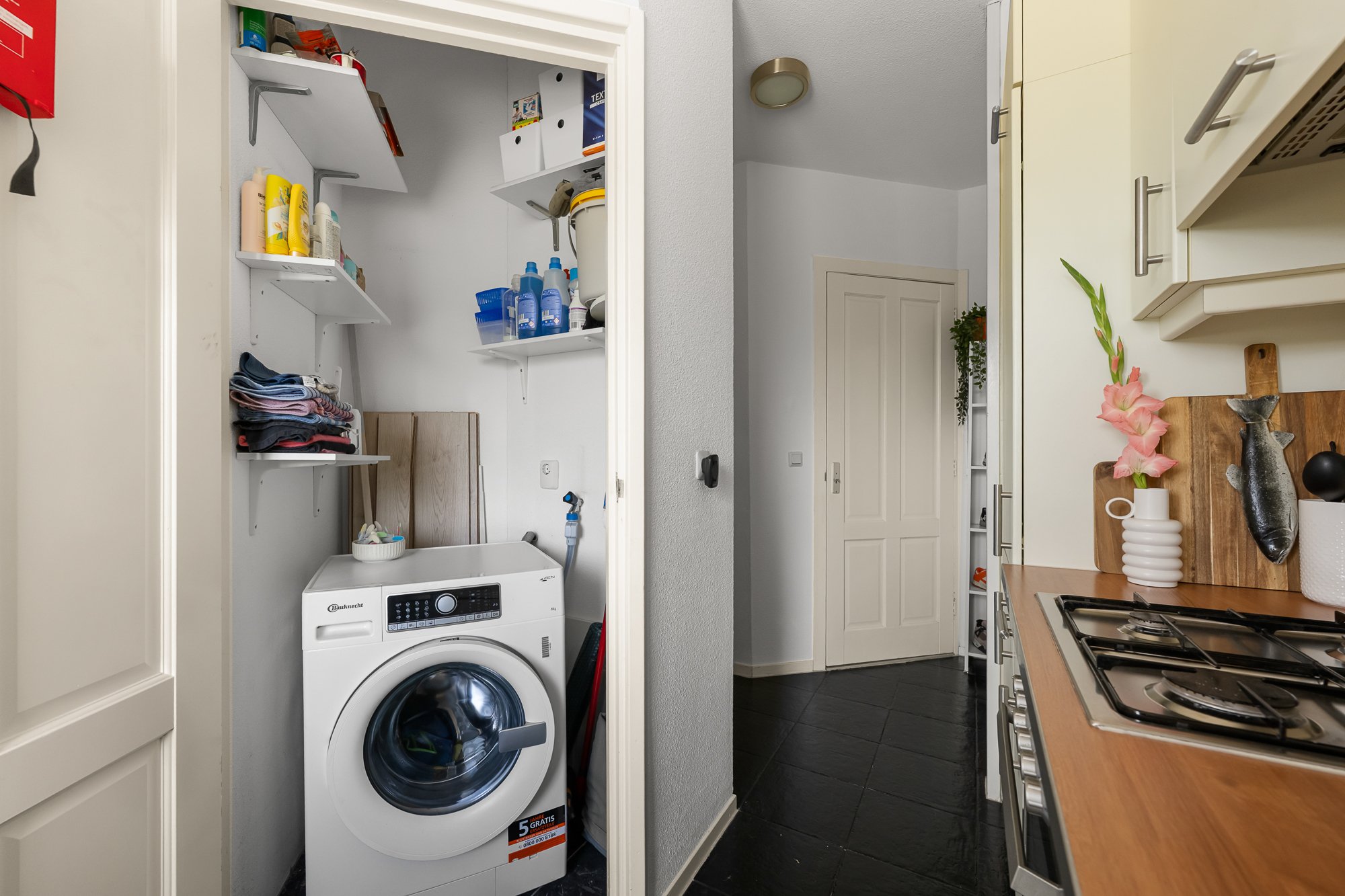 De keuken sluit goed aan op de woonkamer en is voorzien van diverse inbouwapparatuur, waardoor koken hier een plezier wordt. Direct naast de keuken vind je een praktische bergruimte met aansluiting voor de wasmachine en droger – slim weggewerkt en altijd netjes uit het zicht. De badkamer is compleet en van alle gemakken voorzien: een moderne inloopdouche, toilet en wastafel maken de ruimte helemaal af.