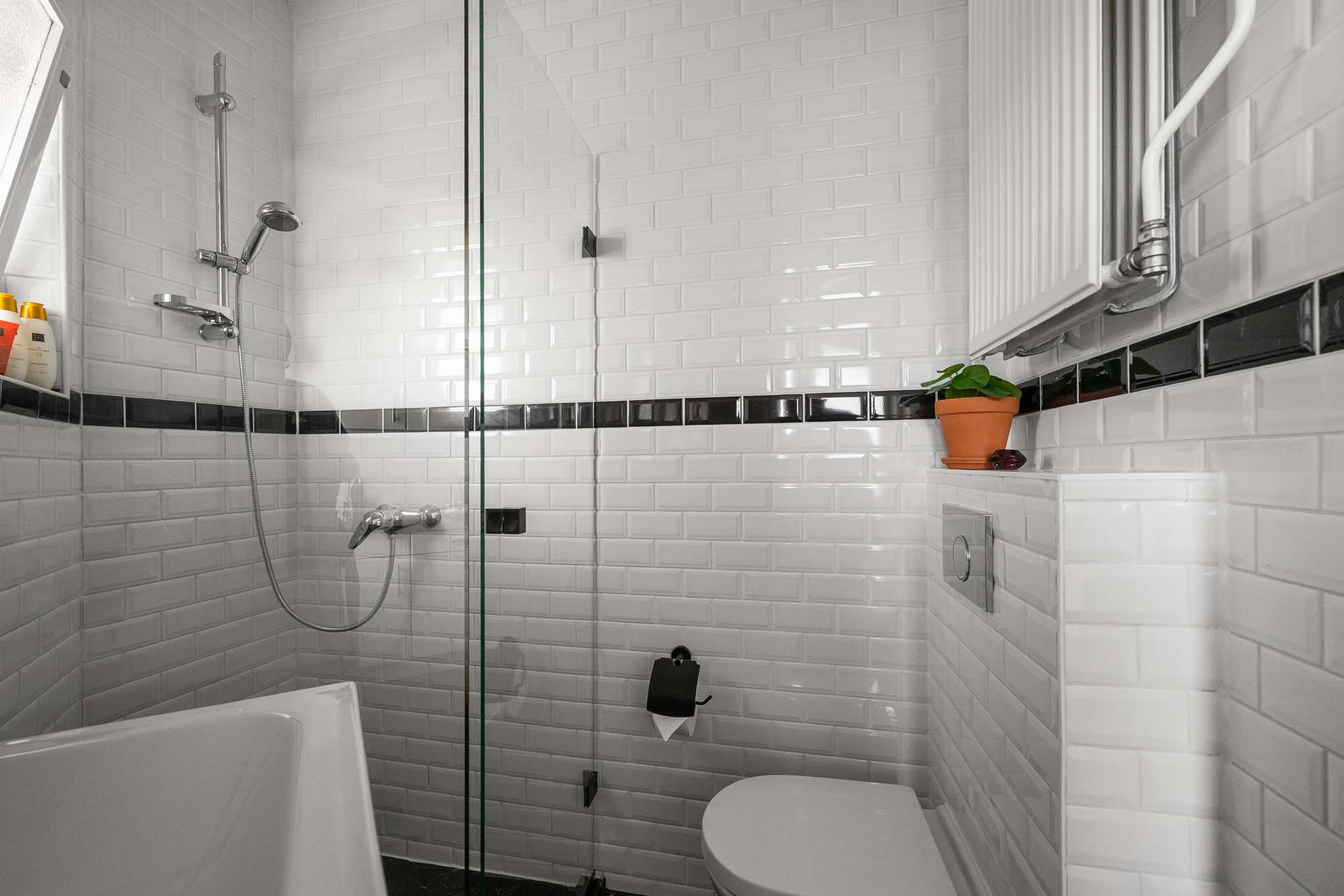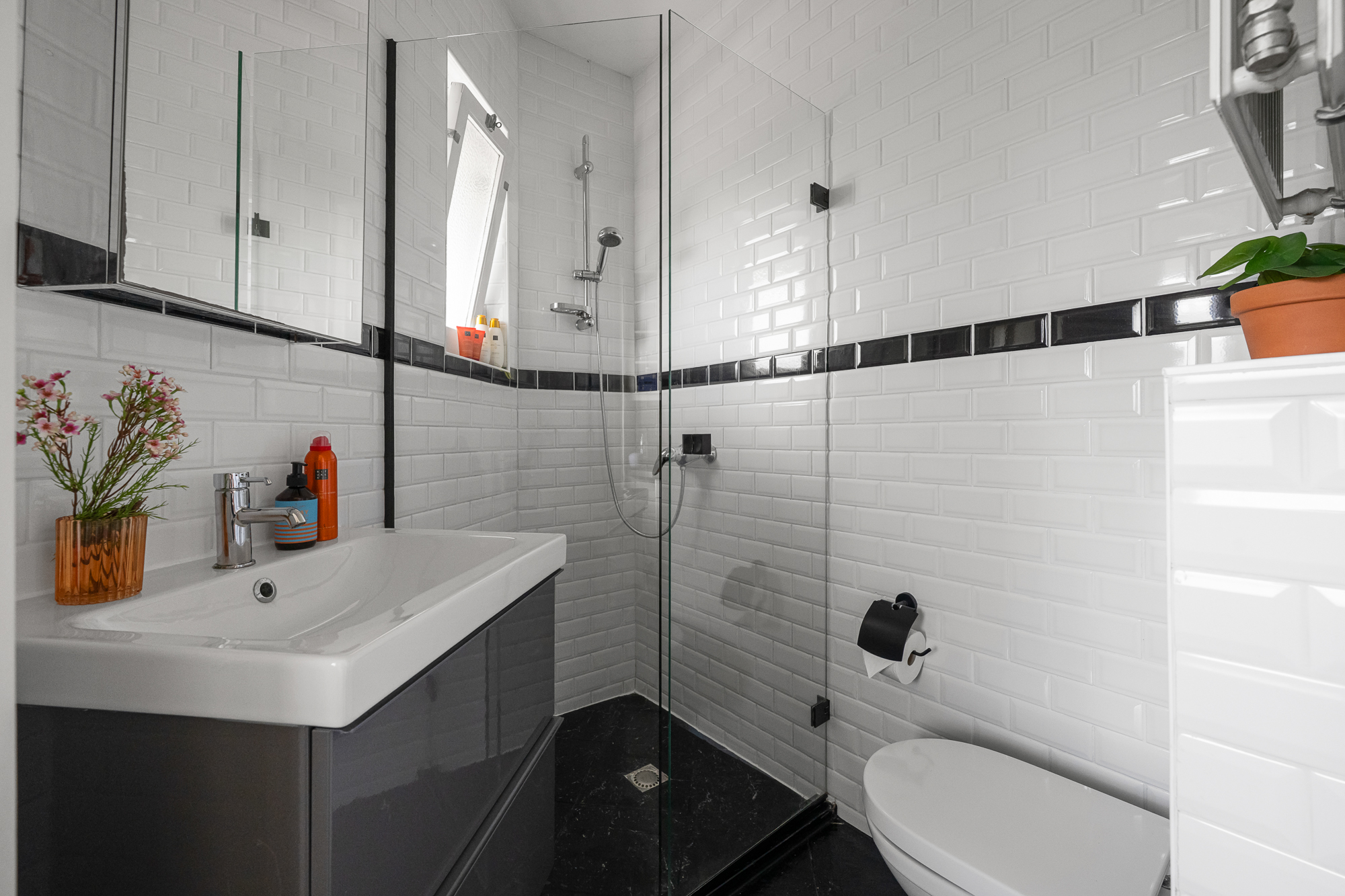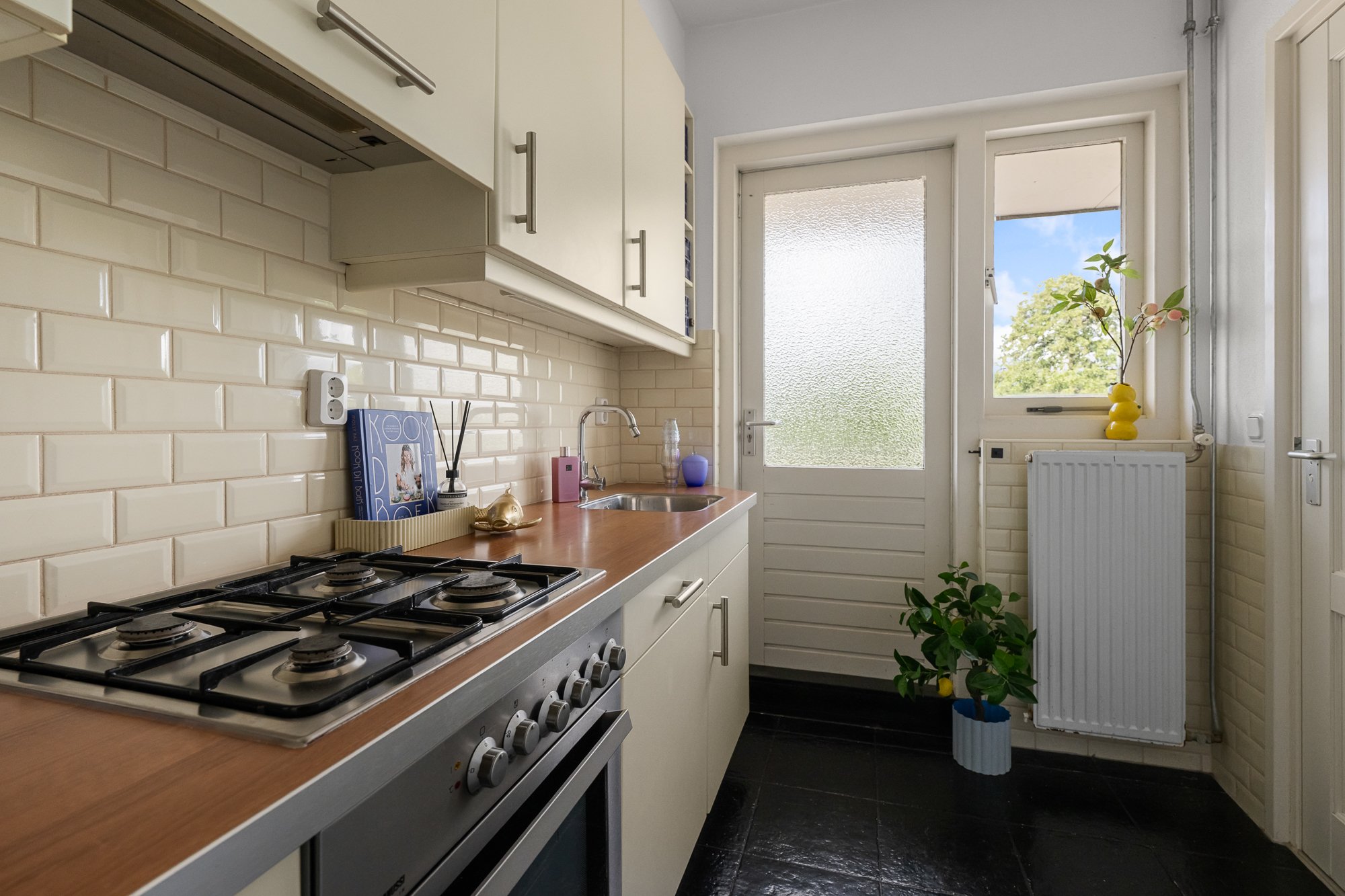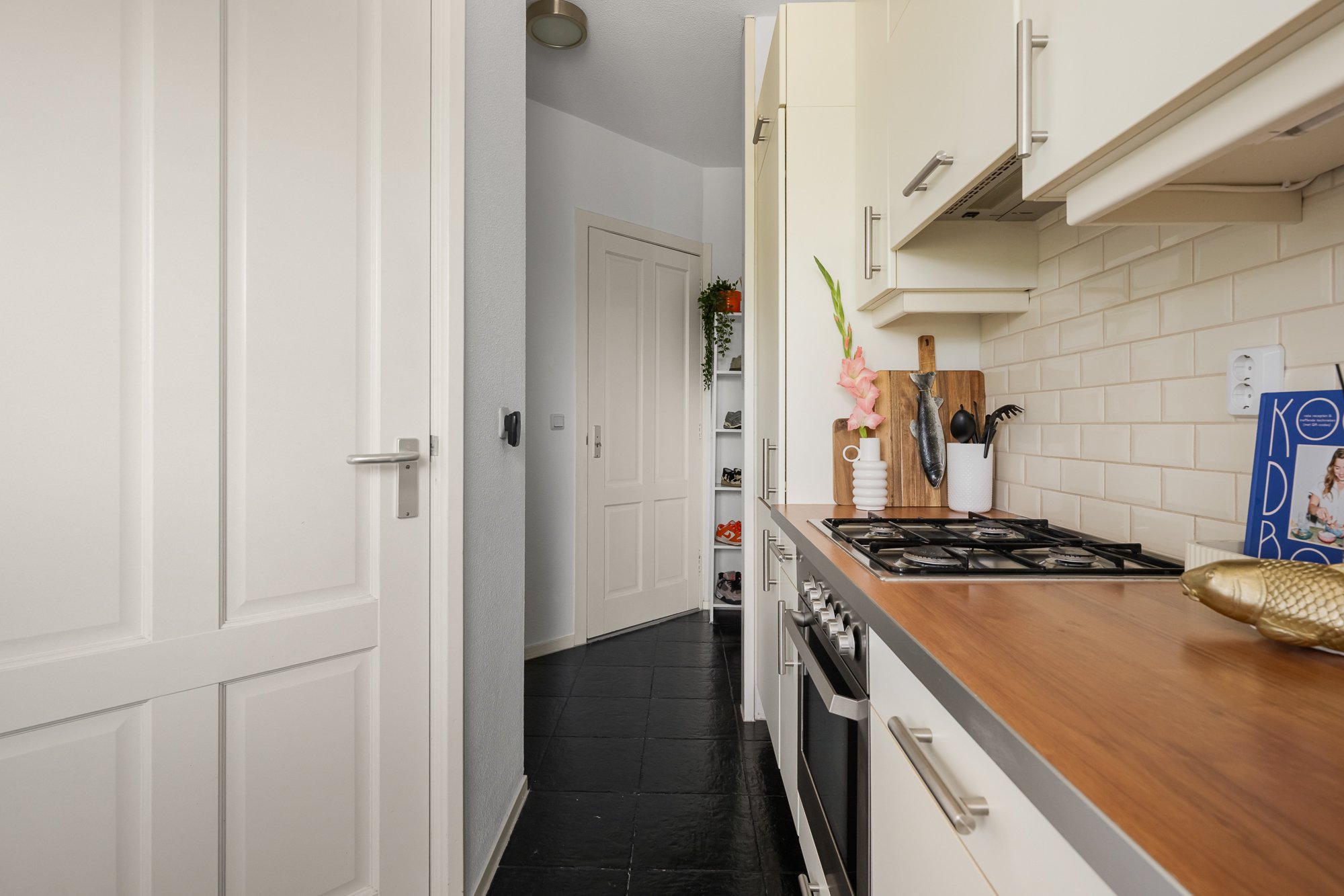 De keuken sluit goed aan op de woonkamer en is voorzien van diverse inbouwapparatuur, waardoor koken hier een plezier wordt. Direct naast de keuken vind je een praktische bergruimte met aansluiting voor de wasmachine en droger – slim weggewerkt en altijd netjes uit het zicht. De badkamer is compleet en van alle gemakken voorzien: een moderne inloopdouche, toilet en wastafel maken de ruimte helemaal af.