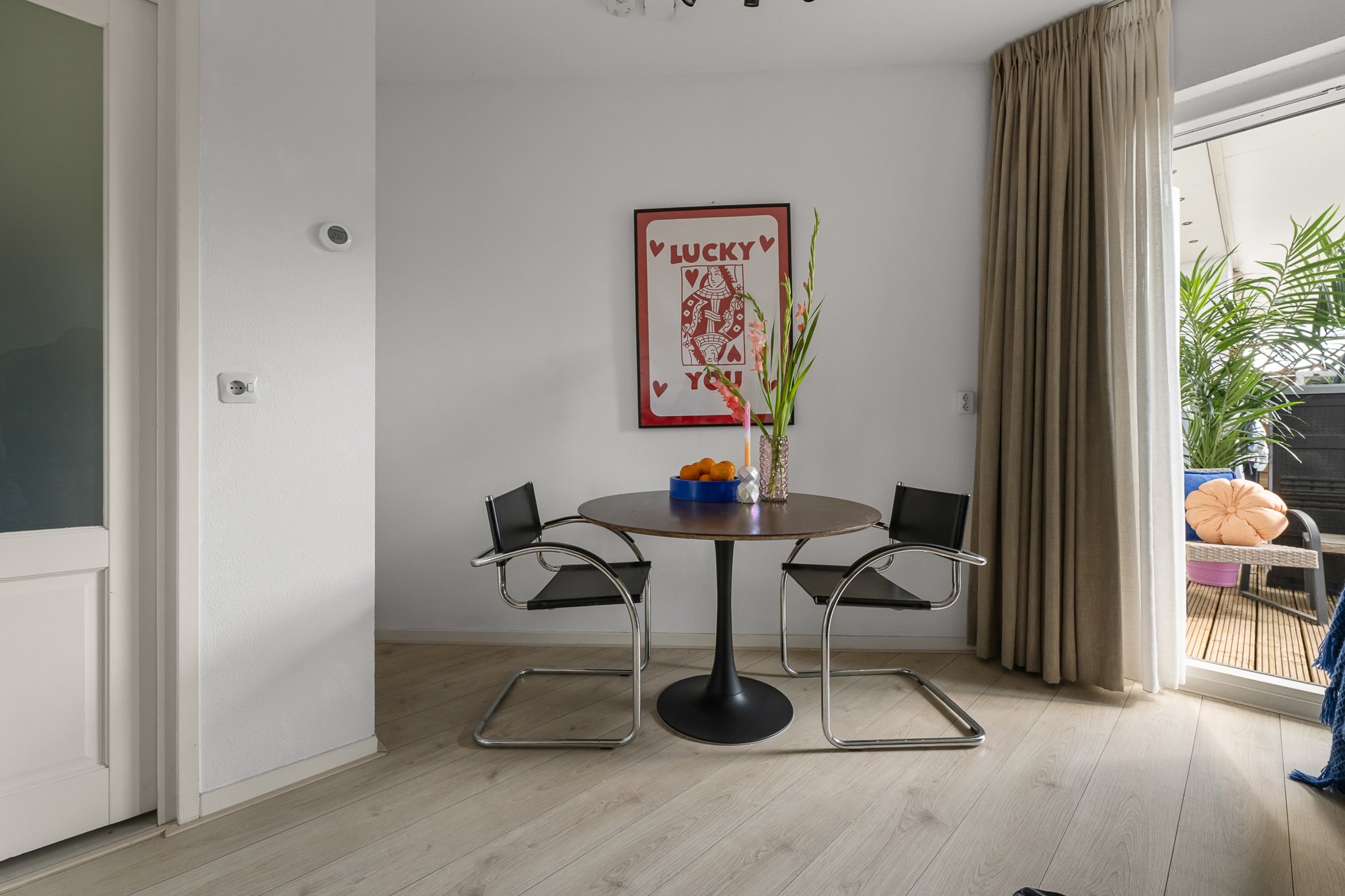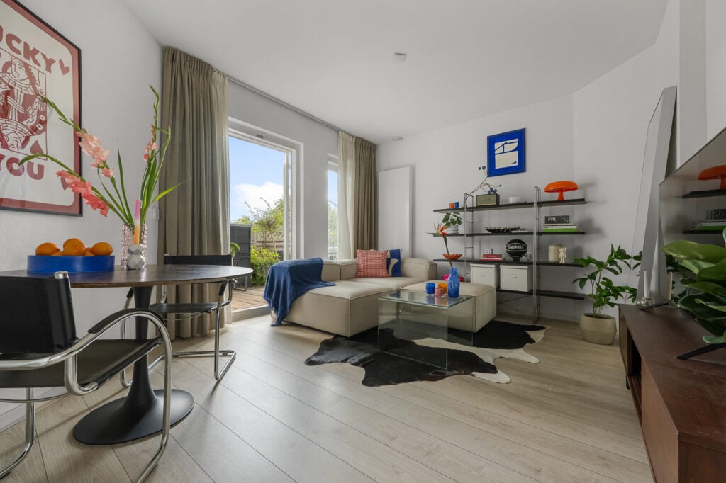 Binnen stap je de lichte woonkamer in, waar grote ramen zorgen voor een prettige hoeveelheid daglicht. Er is voldoende plek voor een comfortabele zithoek én een eettafel, zodat je gezellig kunt tafelen met vrienden of ontspannen op de bank na een drukke dag.