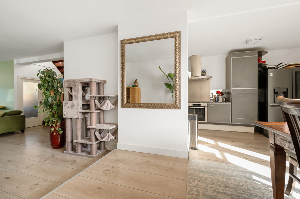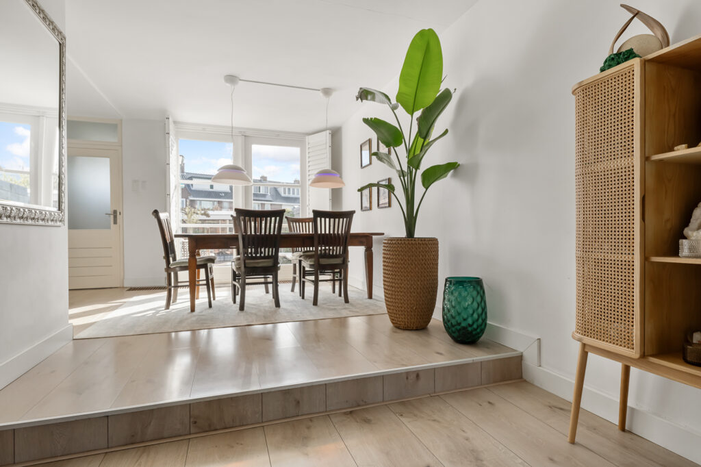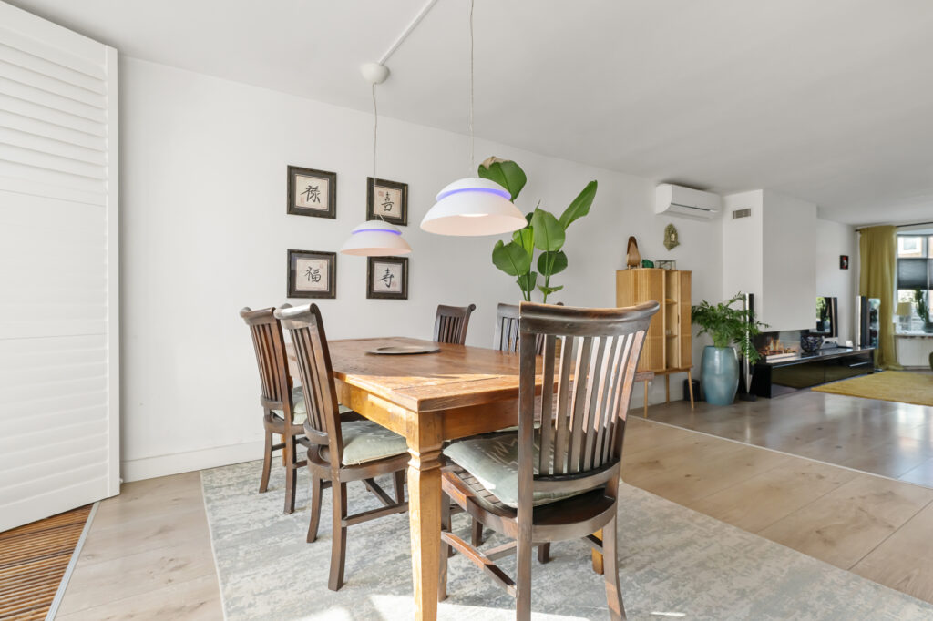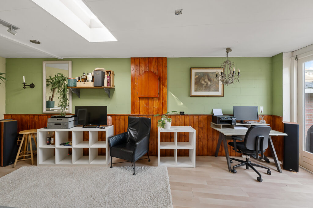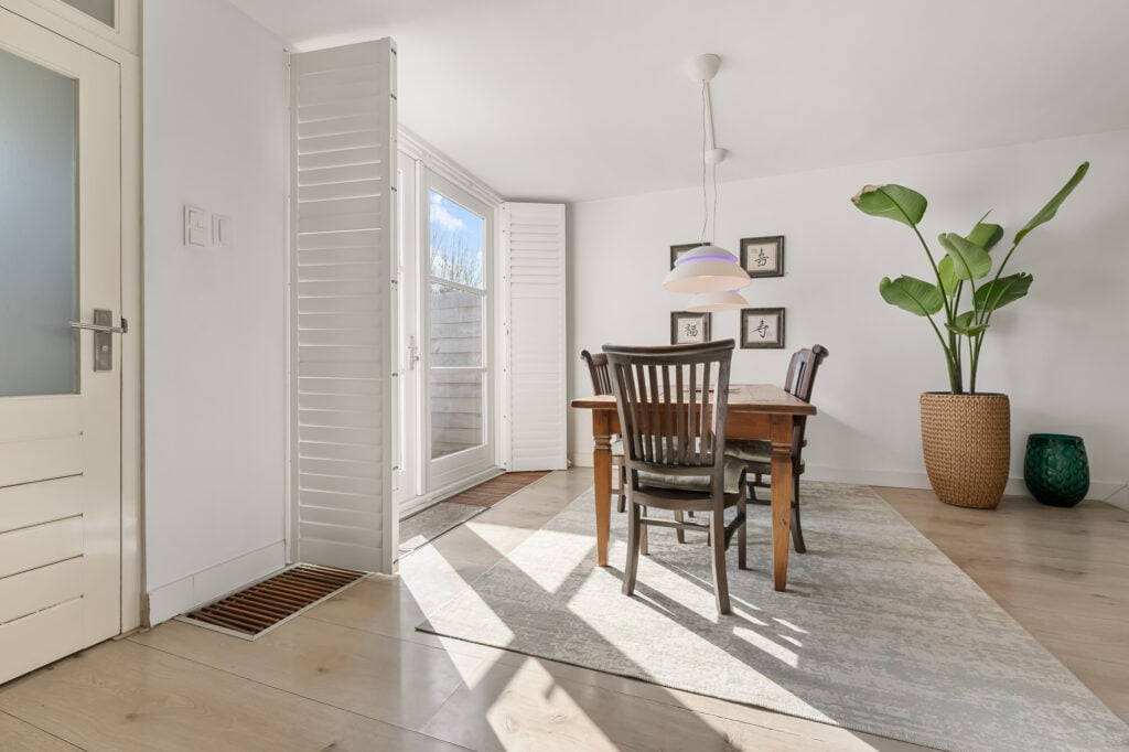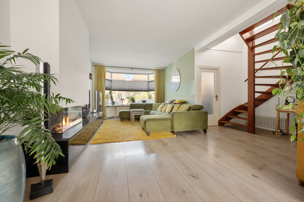 Bij aankomst valt direct het karakter van de woning op, met een verzorgde uitstraling en een prettige sfeer. Via de entree komt u in de woonkamer, waar de trap centraal in de ruimte is geplaatst. De woonkamer is uitgebouwd en daardoor heerlijk ruim, met een erker aan de voorzijde die zorgt voor veel lichtinval. De gashaard geeft extra sfeer, terwijl de airconditioning bijdraagt aan een aangenaam binnenklimaat. Dankzij de 16 zonnepanelen zijn de energielasten bovendien gunstig en kan de airconditioning efficiënt worden gebruikt om zowel te koelen als te verwarmen. Aan de achterzijde bieden openslaande deuren direct toegang tot de tuin, waardoor binnen en buiten mooi in elkaar overlopen.