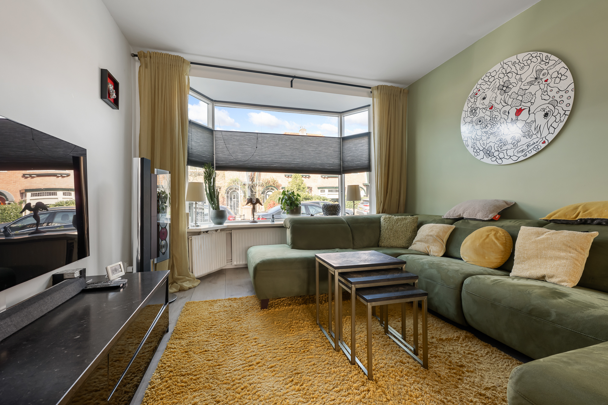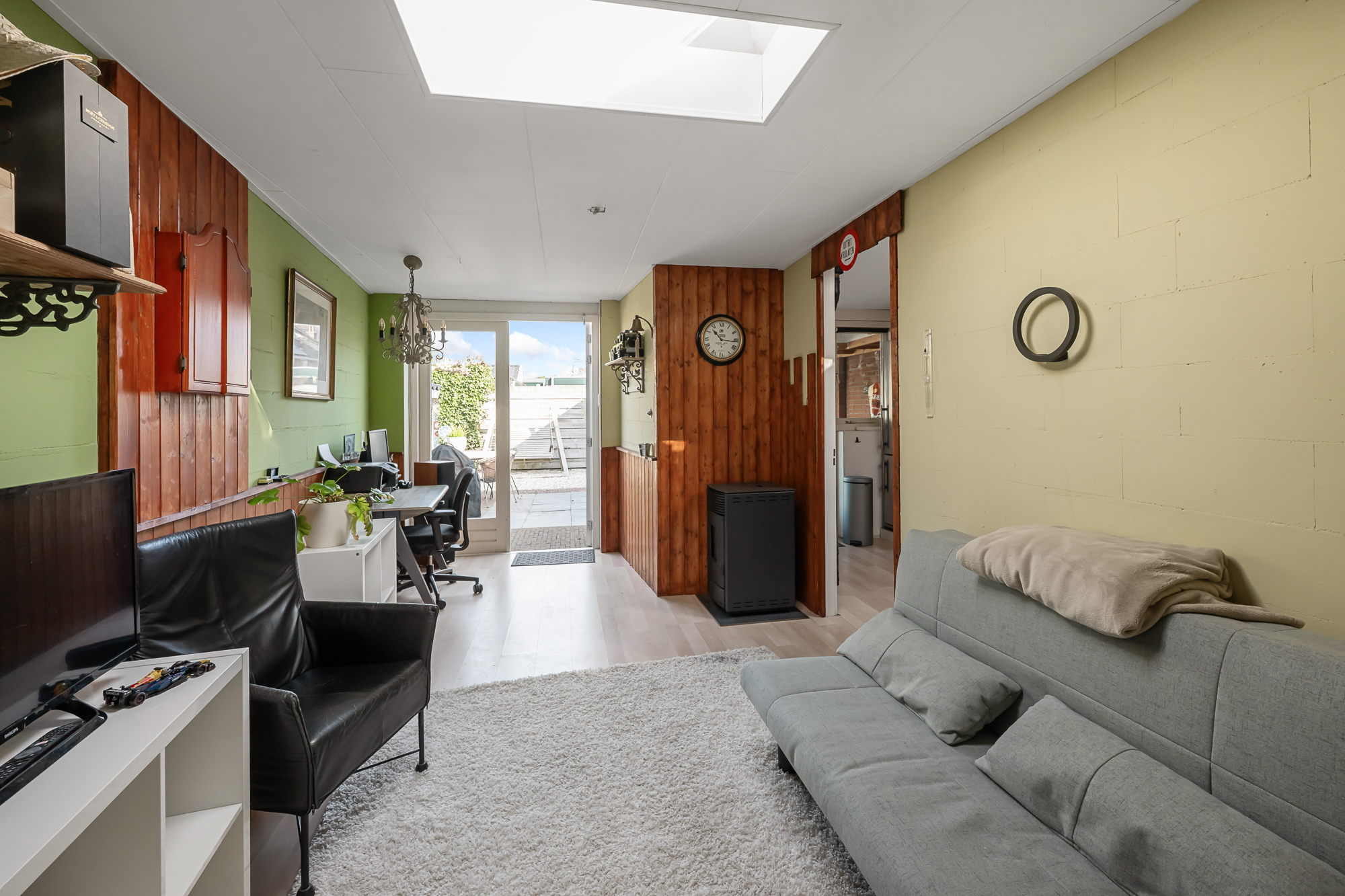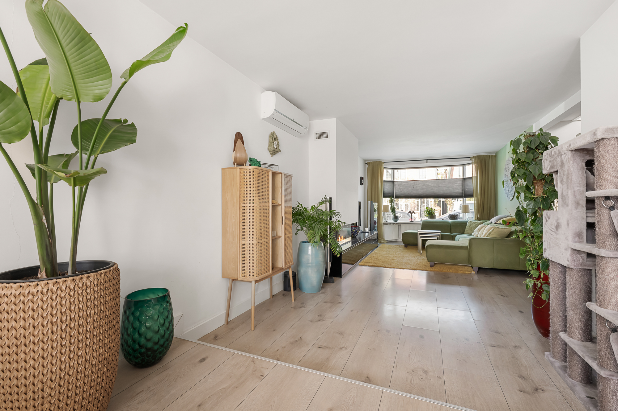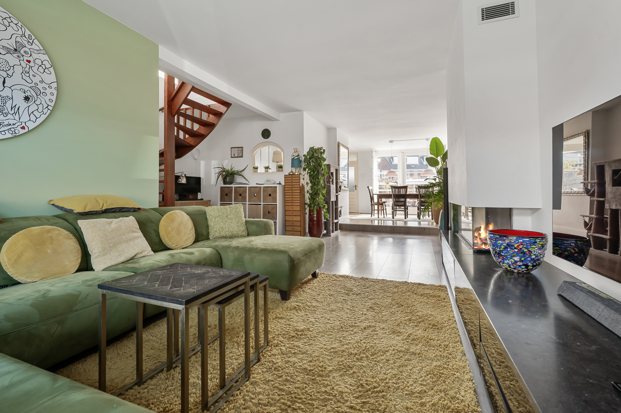Bij aankomst valt direct het karakter van de woning op, met een verzorgde uitstraling en een prettige sfeer. Via de entree komt u in de woonkamer, waar de trap centraal in de ruimte is geplaatst. De woonkamer is uitgebouwd en daardoor heerlijk ruim, met een erker aan de voorzijde die zorgt voor veel lichtinval. De gashaard geeft extra sfeer, terwijl de airconditioning bijdraagt aan een aangenaam binnenklimaat. Dankzij de 16 zonnepanelen zijn de energielasten bovendien gunstig en kan de airconditioning efficiënt worden gebruikt om zowel te koelen als te verwarmen. Aan de achterzijde bieden openslaande deuren direct toegang tot de tuin, waardoor binnen en buiten mooi in elkaar overlopen.