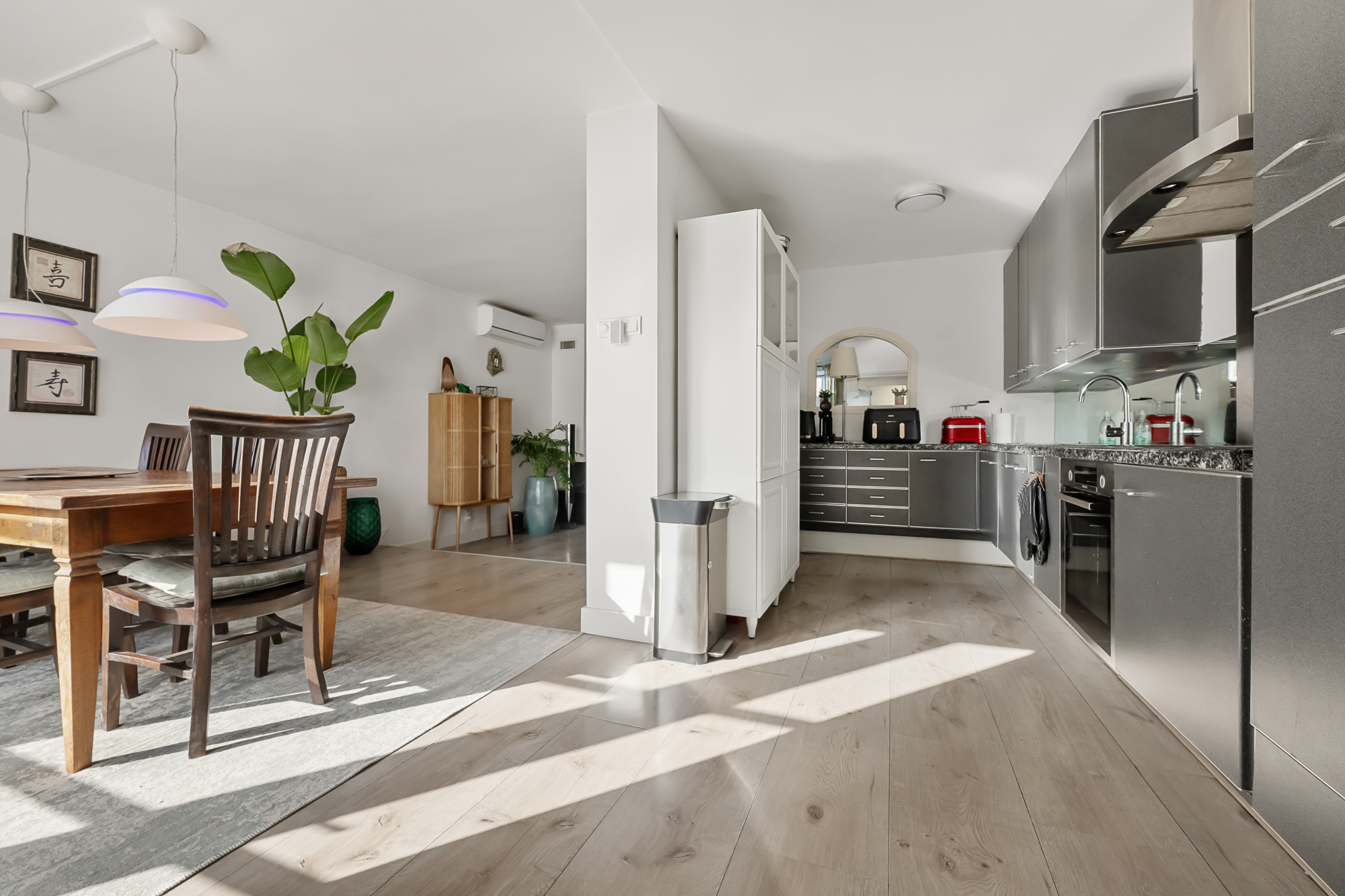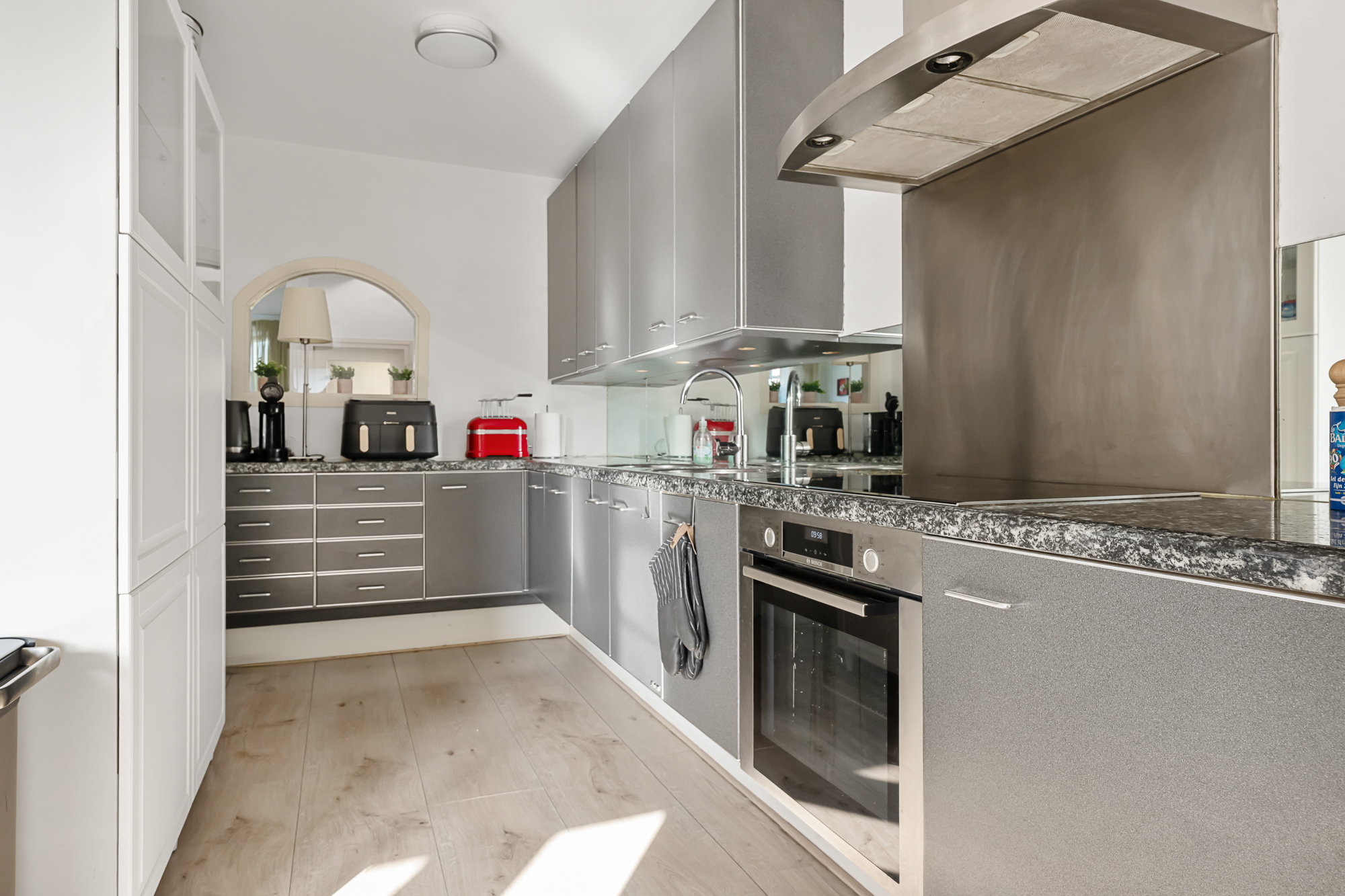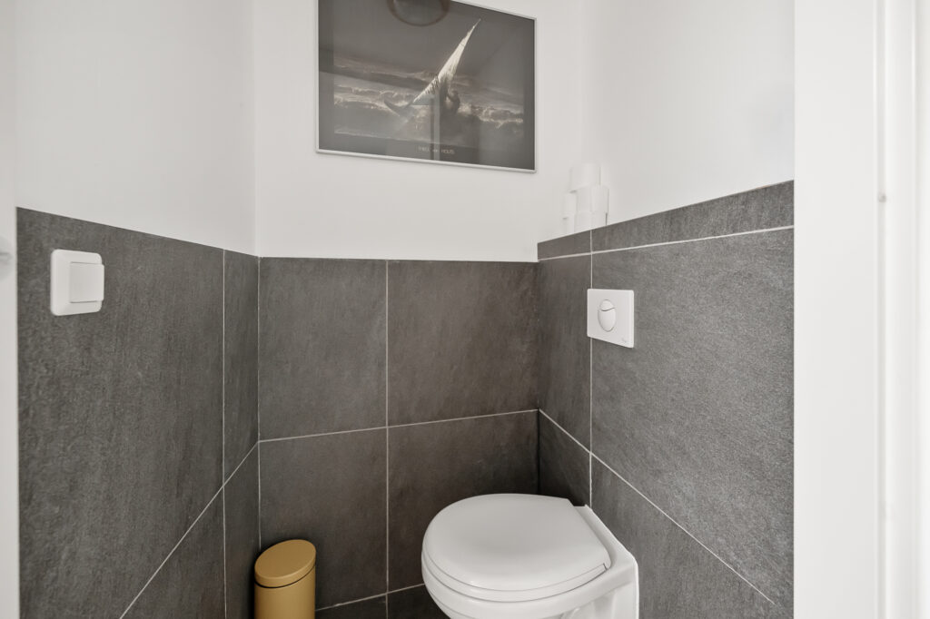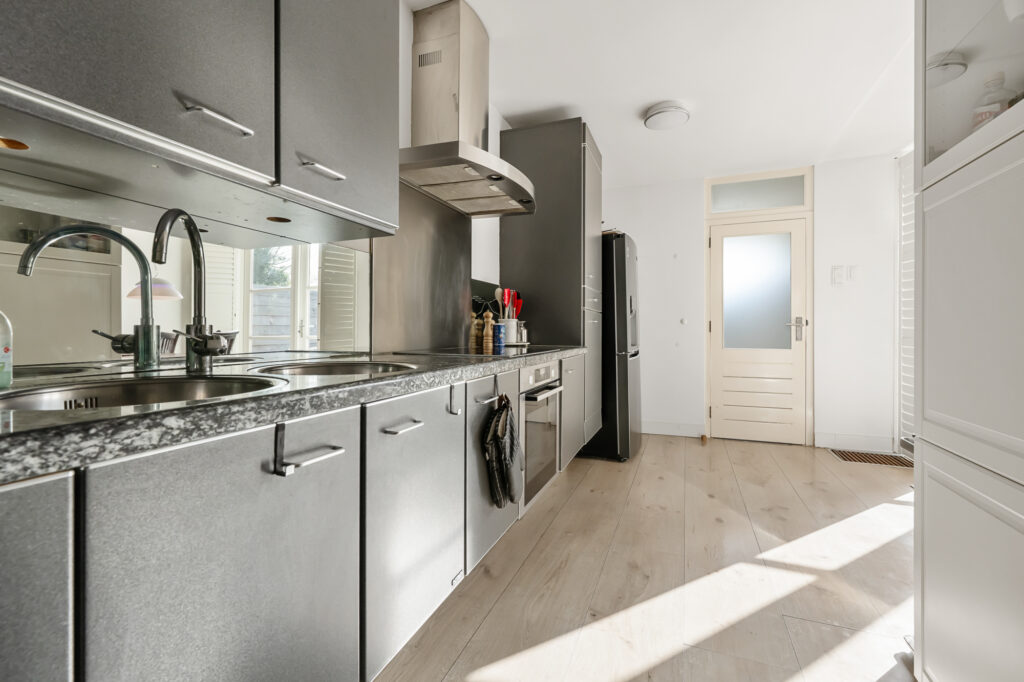 De keuken is praktisch ingericht en voorzien van diverse inbouwapparatuur, waaronder een inductiekookplaat, oven en vaatwasser. Vanuit de keuken zijn het toilet en de CV-opstelling bereikbaar, met een Intergas ketel uit 2020. Op de begane grond bevindt zich tevens de badkamer, die is uitgerust met een wastafel, een bad/douchecombinatie, elektrische vloerverwarming en mechanische ventilatie. Ook is hier een praktische wasmachine- en drogeropstelling aanwezig.