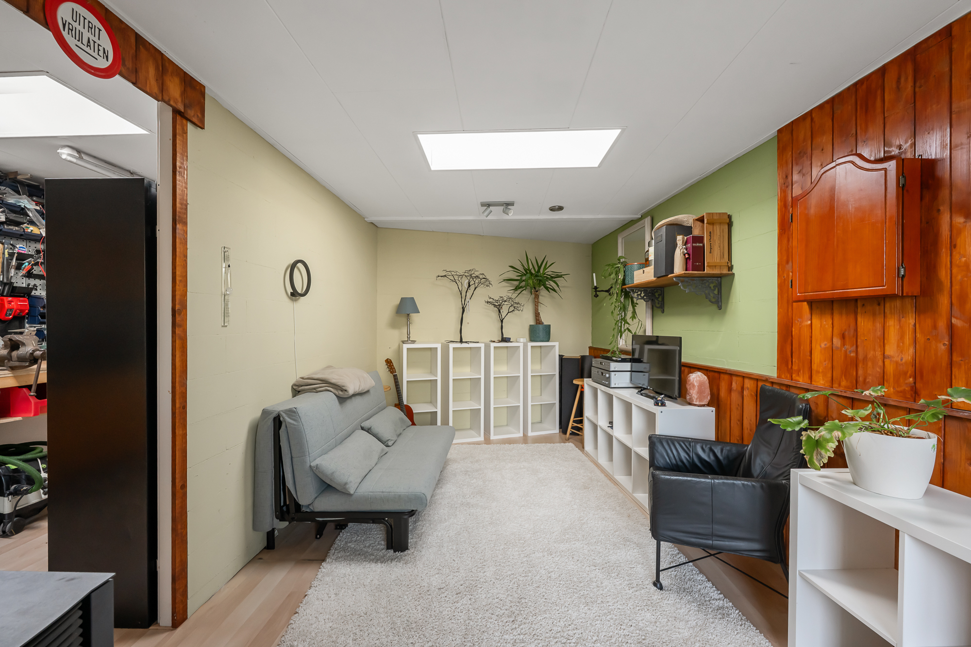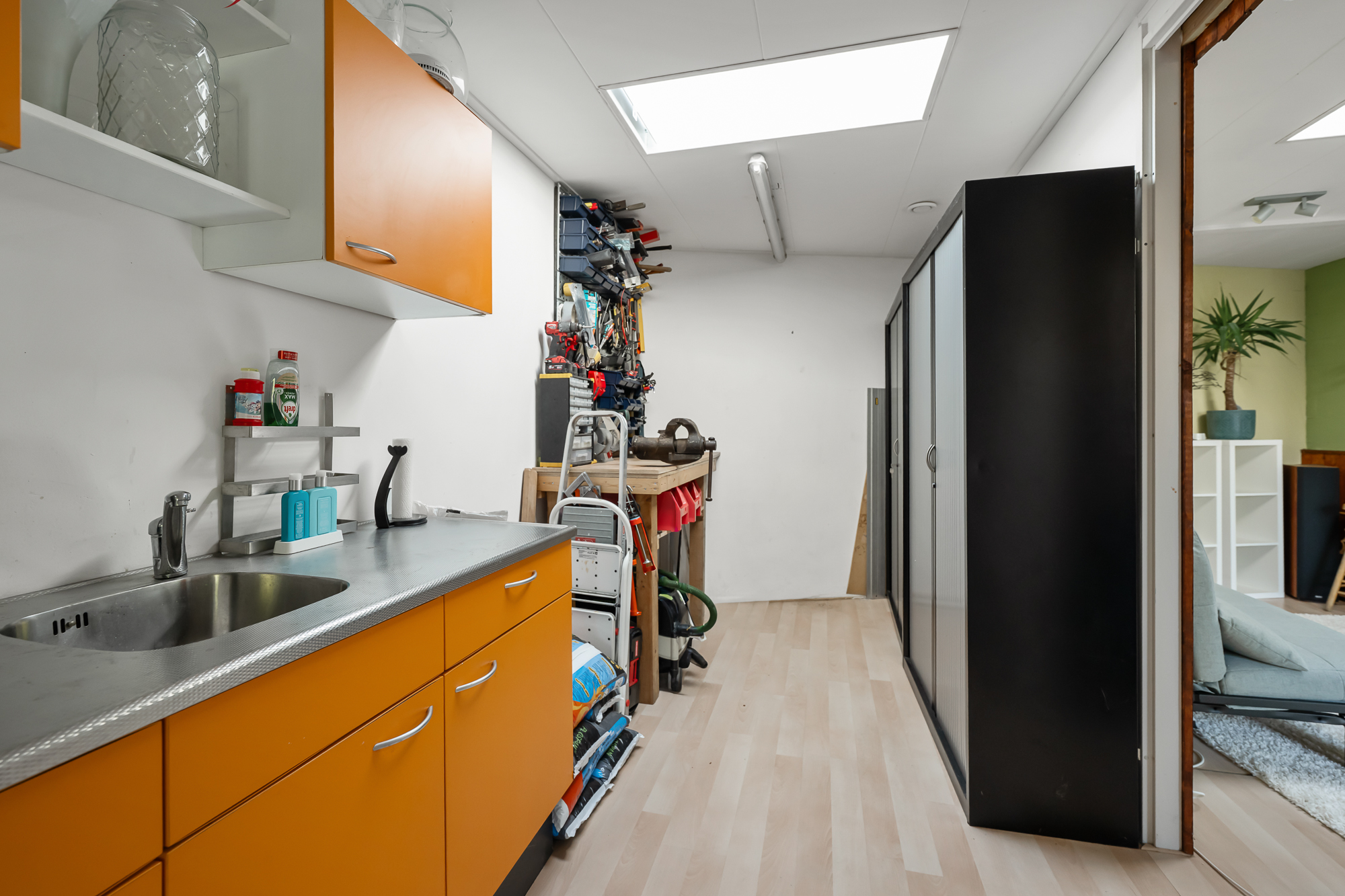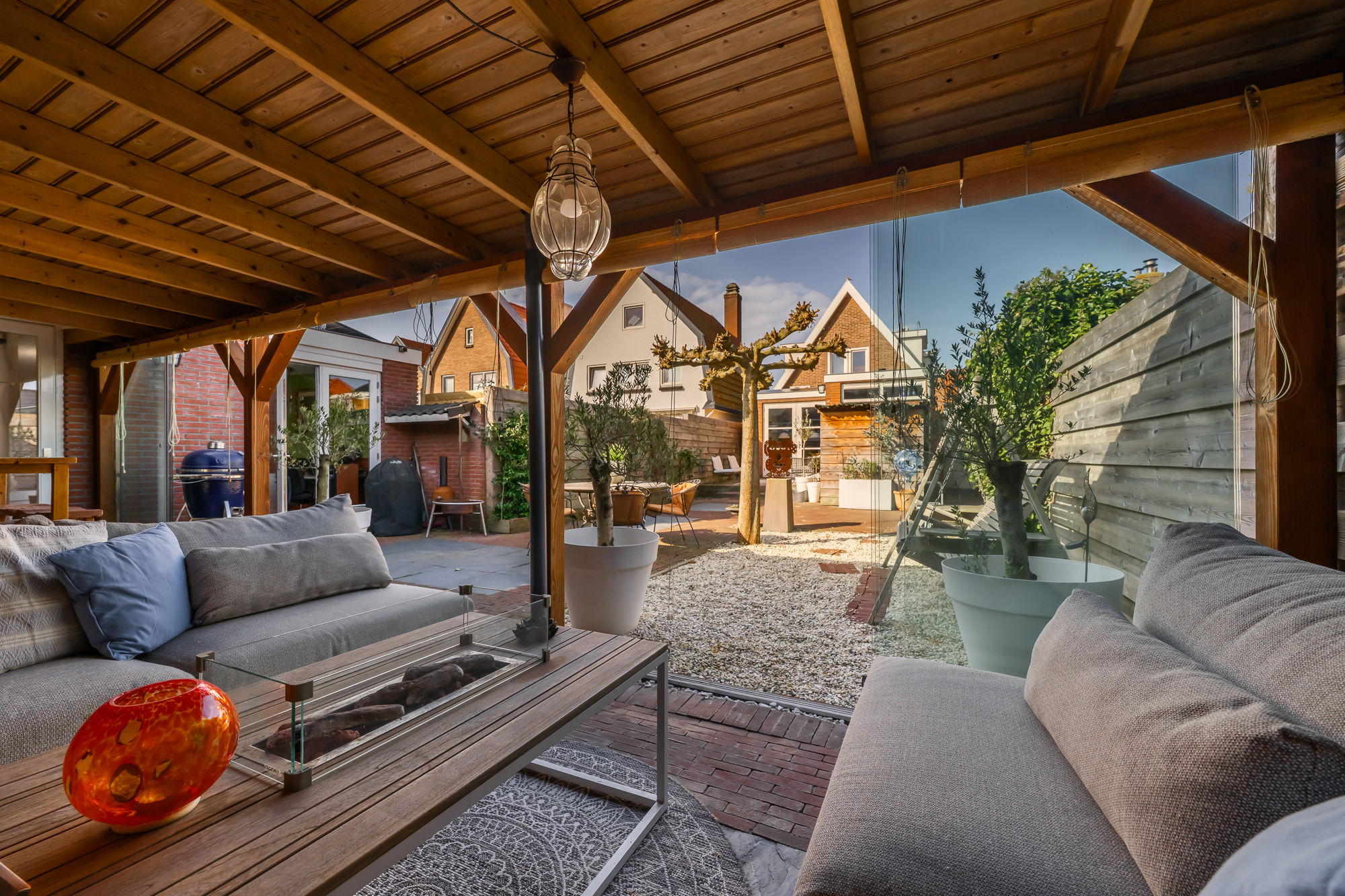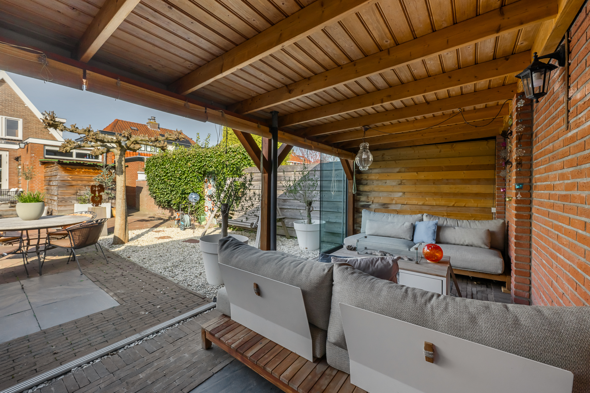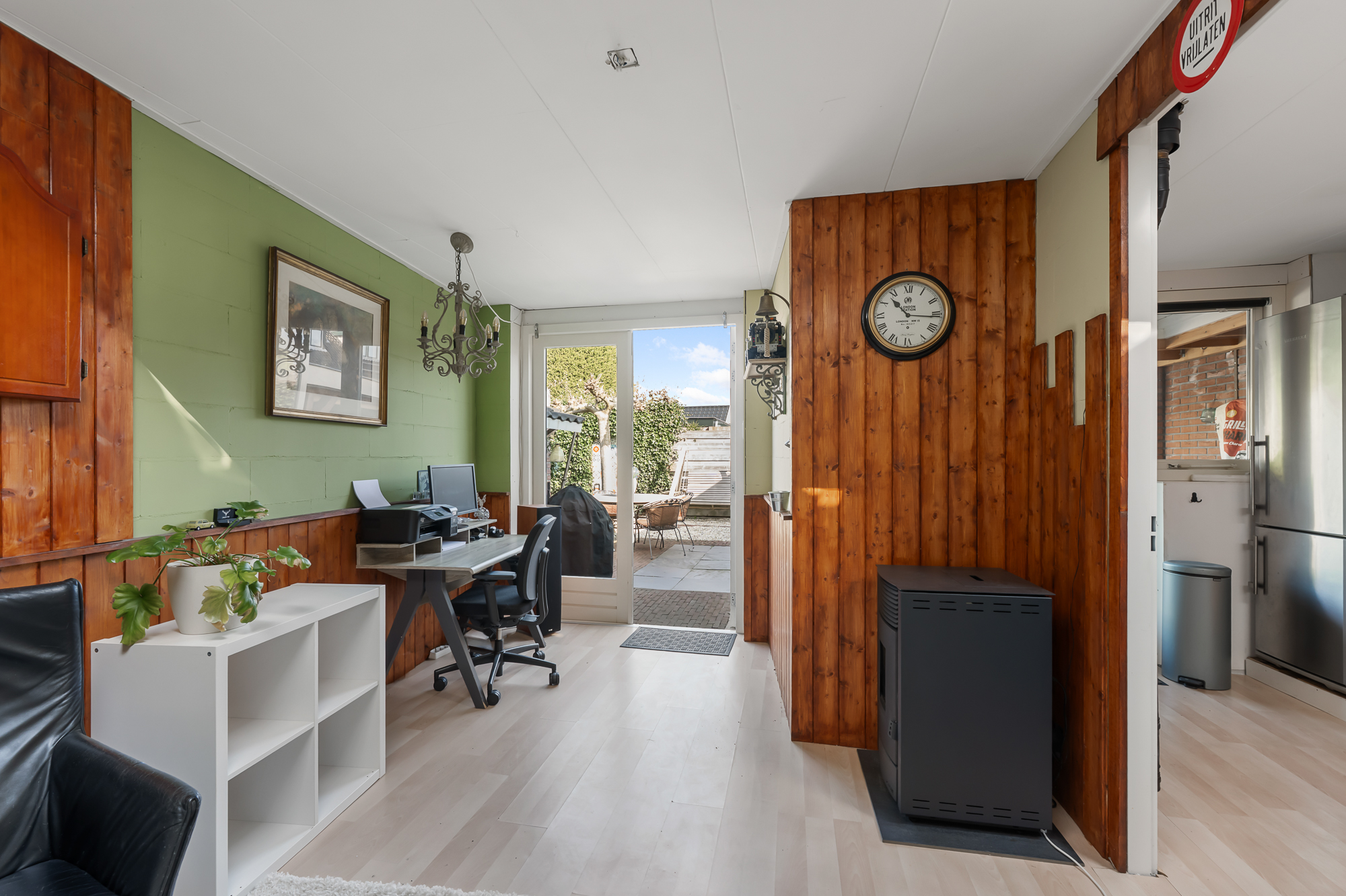 De achtertuin is ruim en biedt veel privacy, waardoor u hier in alle rust kunt genieten. De brede overkapping met beglazing en een schuifwand maakt het mogelijk om het hele jaar door comfortabel buiten te verblijven. Daarnaast is er een royale bijruimte aanwezig, ingericht als volwaardige thuiswerkplek en voorzien van water, een toilet en verwarming, wat deze ruimte geschikt maakt voor diverse doeleinden.