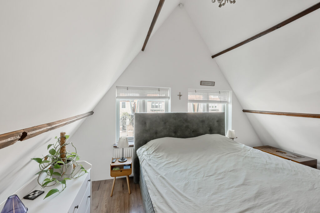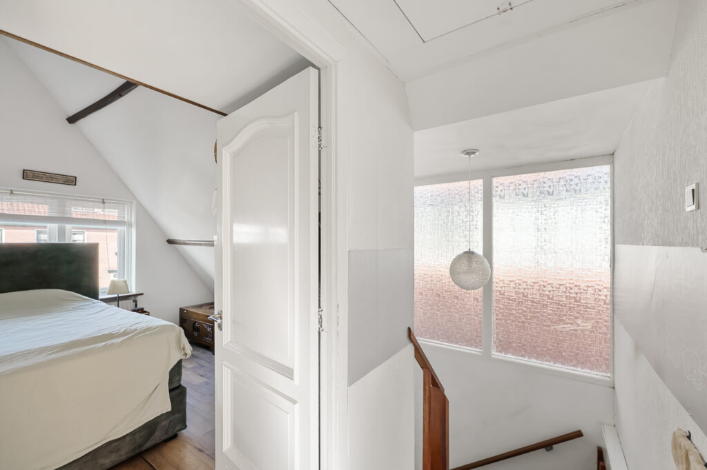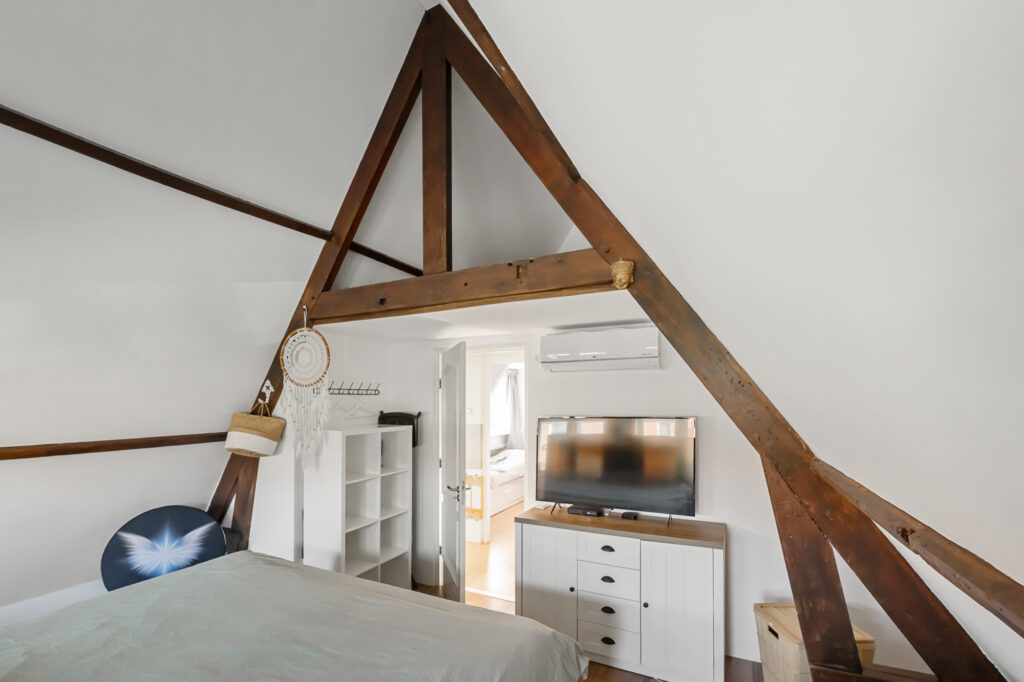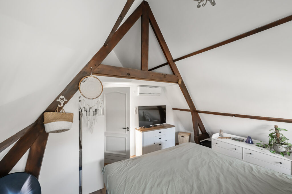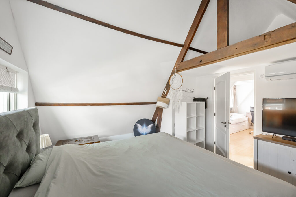 Op de verdieping geeft de overloop toegang tot drie slaapkamers. De hoofdslaapkamer is ruim en licht en is in 2020 volledig gerenoveerd en geïsoleerd. Met zijn karakteristieke houten balken heeft deze kamer een warme en sfeervolle uitstraling, terwijl het geïsoleerde dak met circa 10 cm glaswol zorgt voor extra comfort. De aanwezige airconditioning maakt het mogelijk om de ruimte zowel te koelen als elektrisch te verwarmen. Vanuit de hoofdslaapkamer is bovendien een vliering bereikbaar, ideaal voor extra bergruimte.