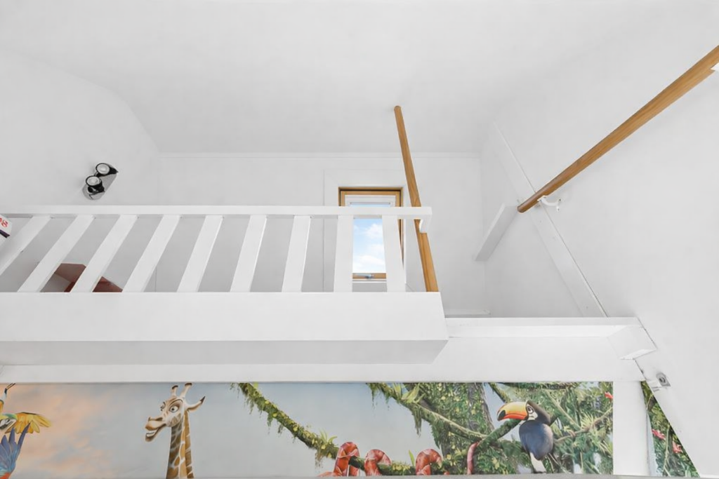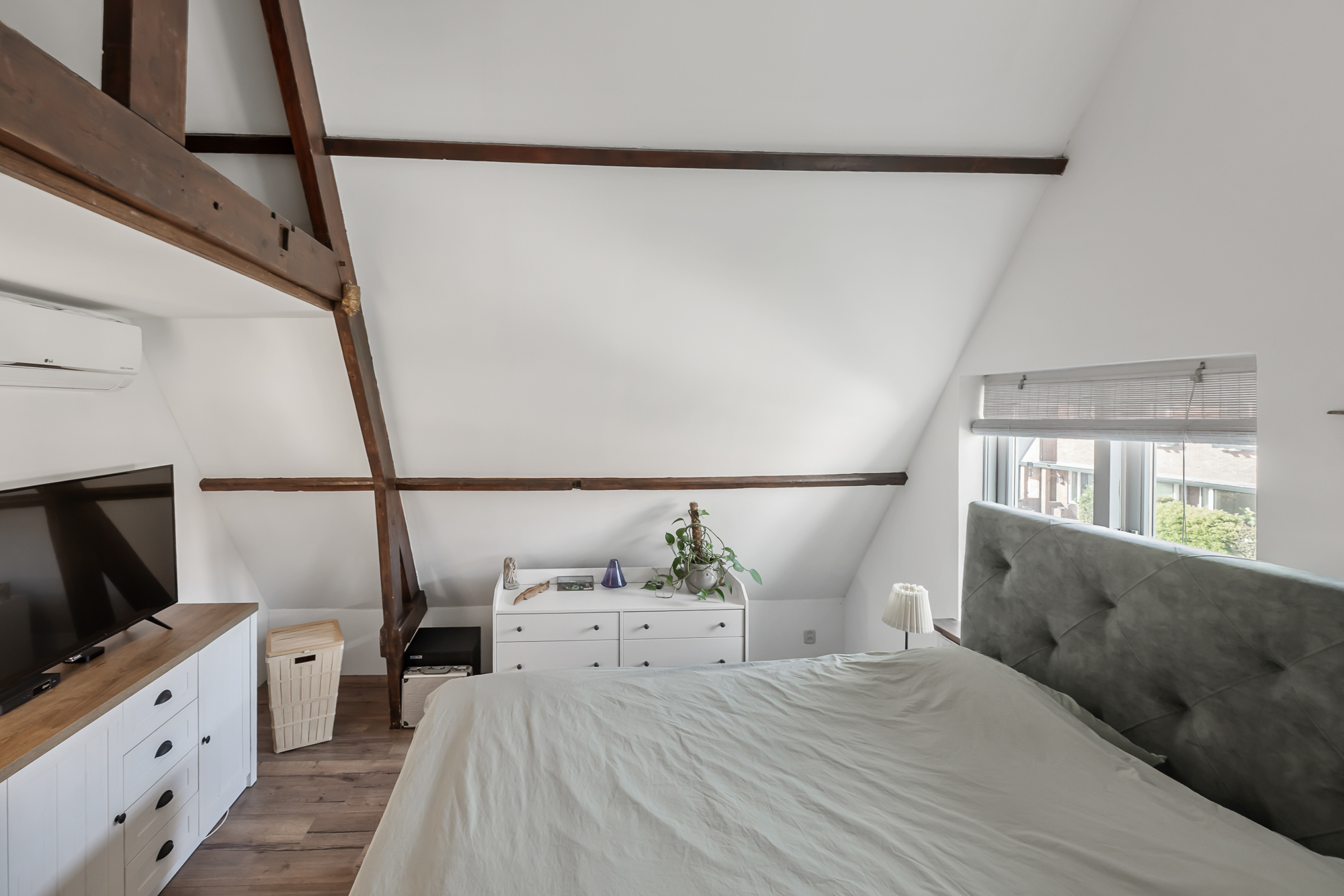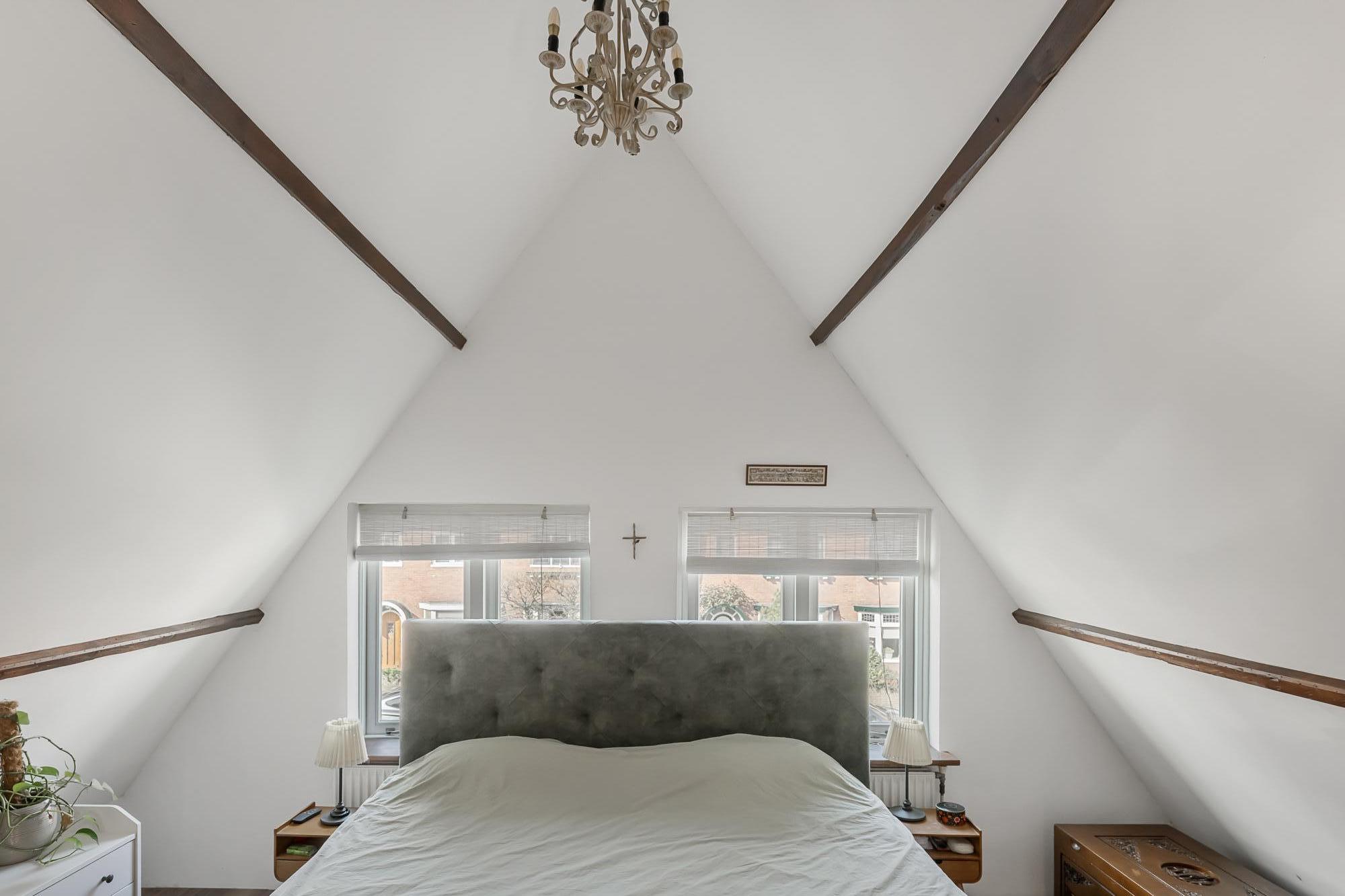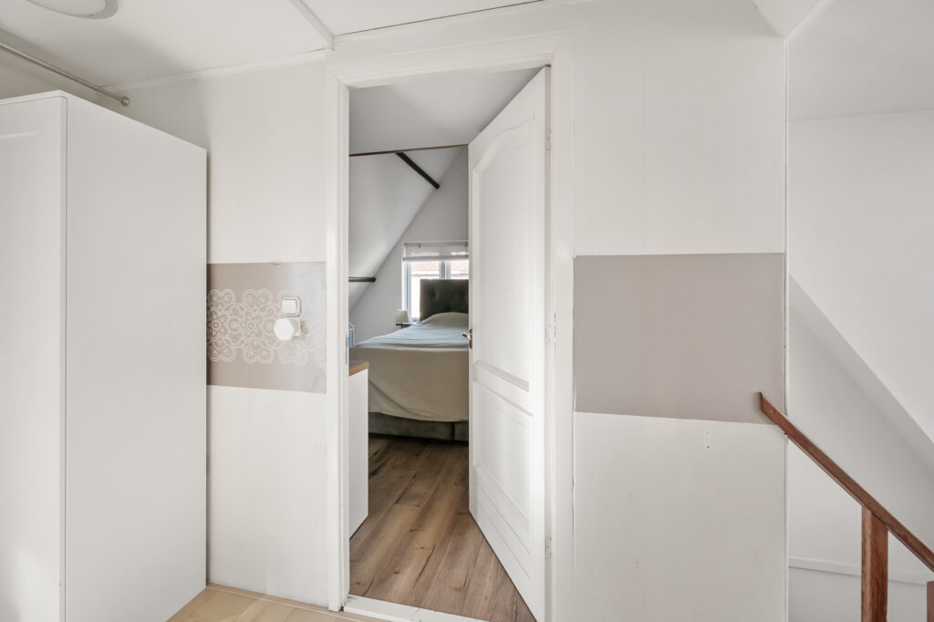 Op de verdieping geeft de overloop toegang tot drie slaapkamers. De hoofdslaapkamer is ruim en licht en is in 2020 volledig gerenoveerd en geïsoleerd. Met zijn karakteristieke houten balken heeft deze kamer een warme en sfeervolle uitstraling, terwijl het geïsoleerde dak met circa 10 cm glaswol zorgt voor extra comfort. De aanwezige airconditioning maakt het mogelijk om de ruimte zowel te koelen als elektrisch te verwarmen. Vanuit de hoofdslaapkamer is bovendien een vliering bereikbaar, ideaal voor extra bergruimte.