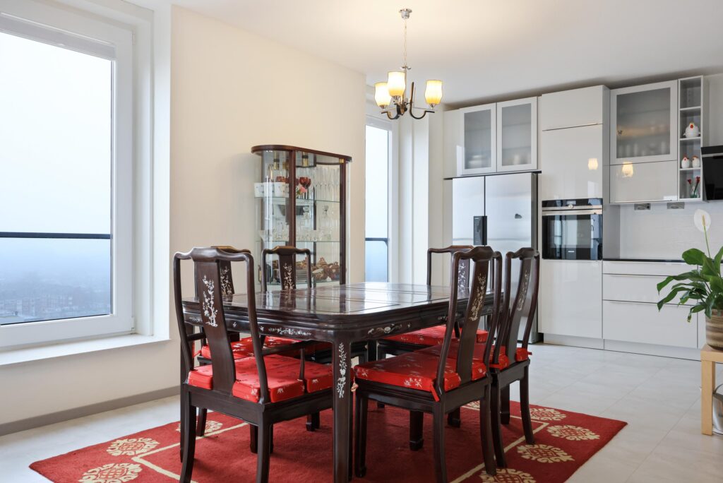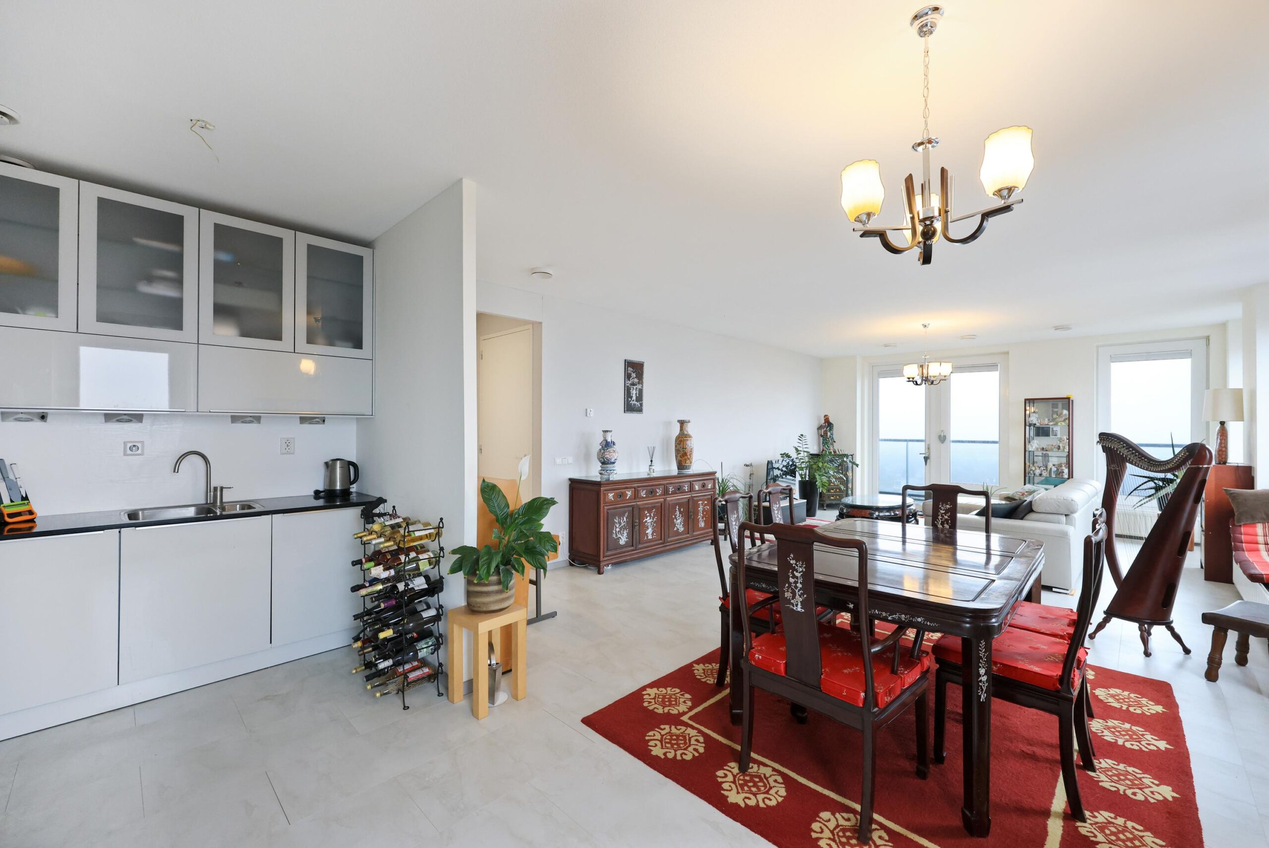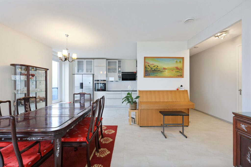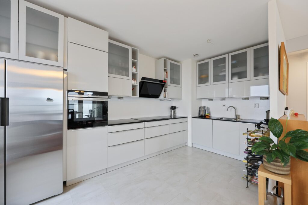 Aansluitend bevindt zich de moderne keuken, uitgevoerd met diverse inbouwapparatuur waaronder een kookplaat, afzuigkap, oven, koelkast, vriezer en vaatwasser. De keuken biedt veel werk- en kastruimte en sluit perfect aan bij het comfortabele karakter van de woning.