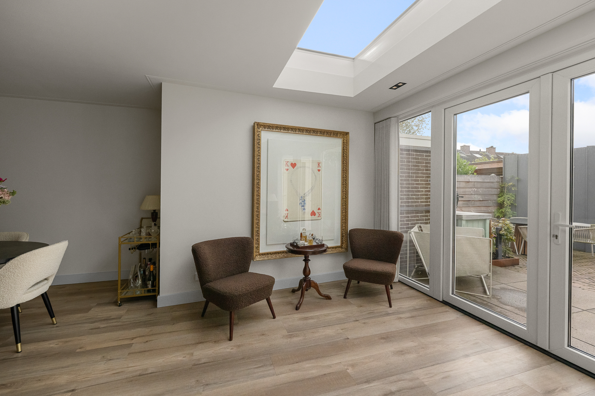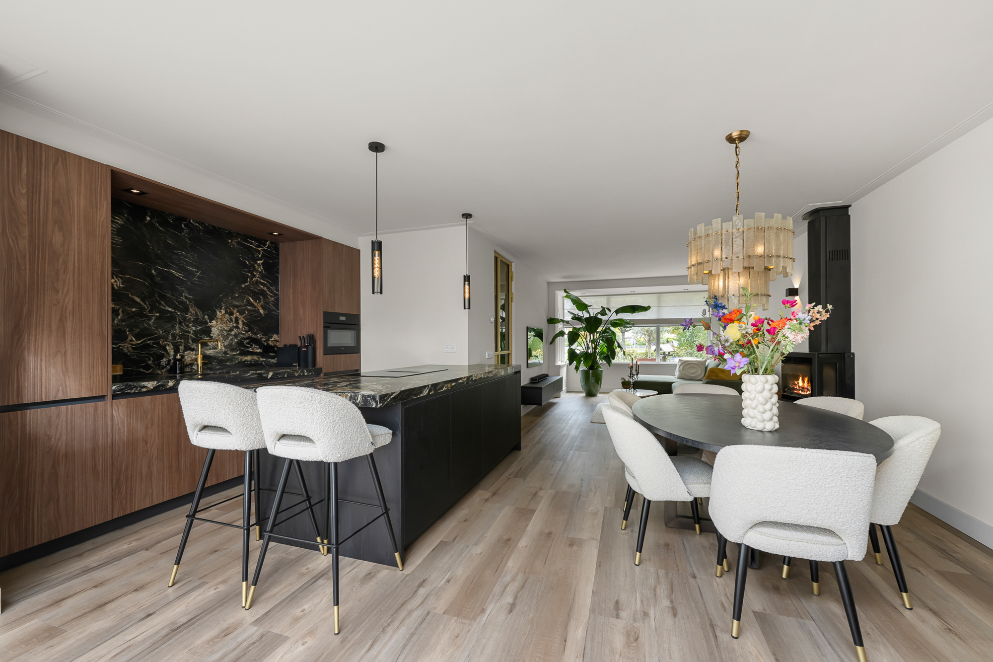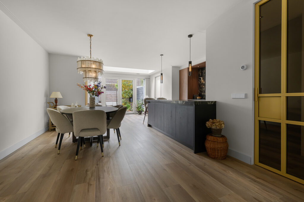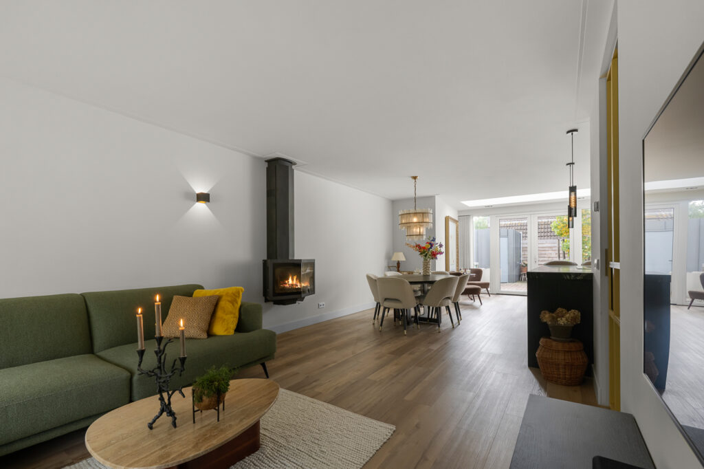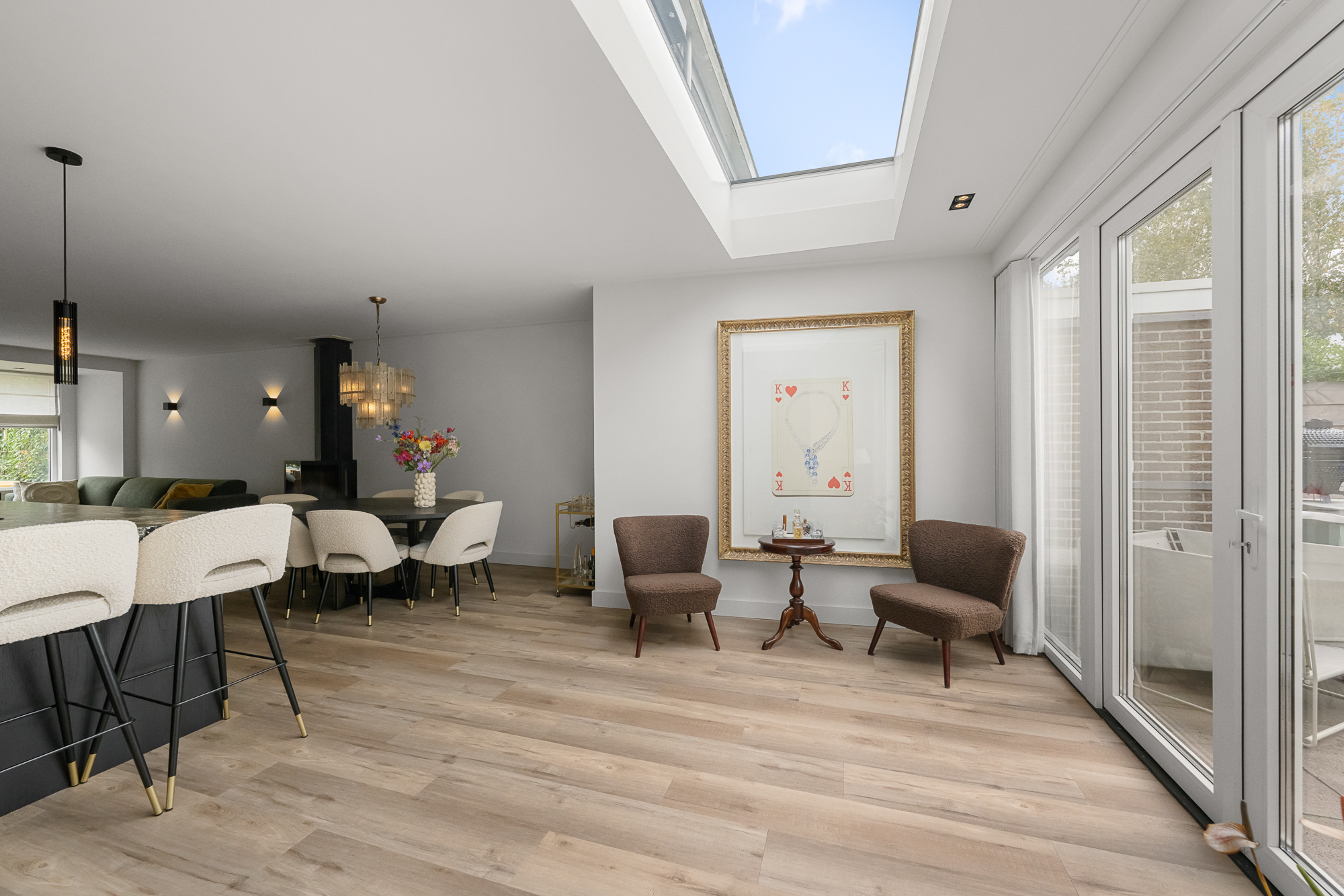 Zodra je de woning binnenstapt, valt het oog gelijk op de sfeervolle afwerking. Een warme pvc-vloer met vloerverwarming, het strakke stucwerk, de sfeervolle design houtkachel van Wanders en de uitermate luxe keuken met schiereiland zorgen voor een warme en hedendaagse uitstraling. Aan zowel de voor- als de achterzijde is de woning uitgebouwd. De achteruitbouw beschikt over een grote lichtkoepel en openslaande deuren die zorgen voor een zee aan licht en een vloeiende verbinding met de tuin.
