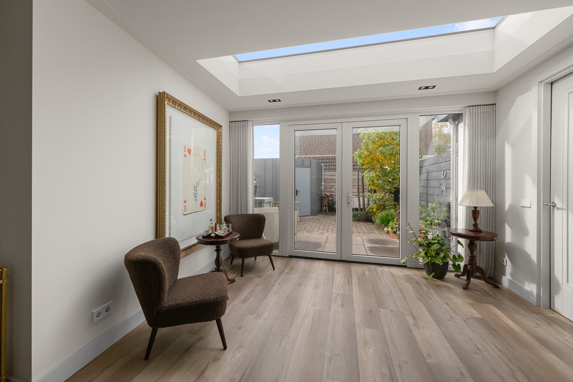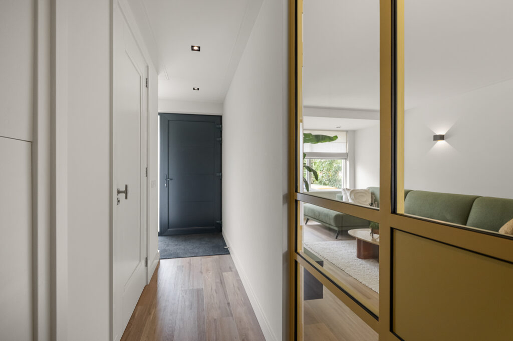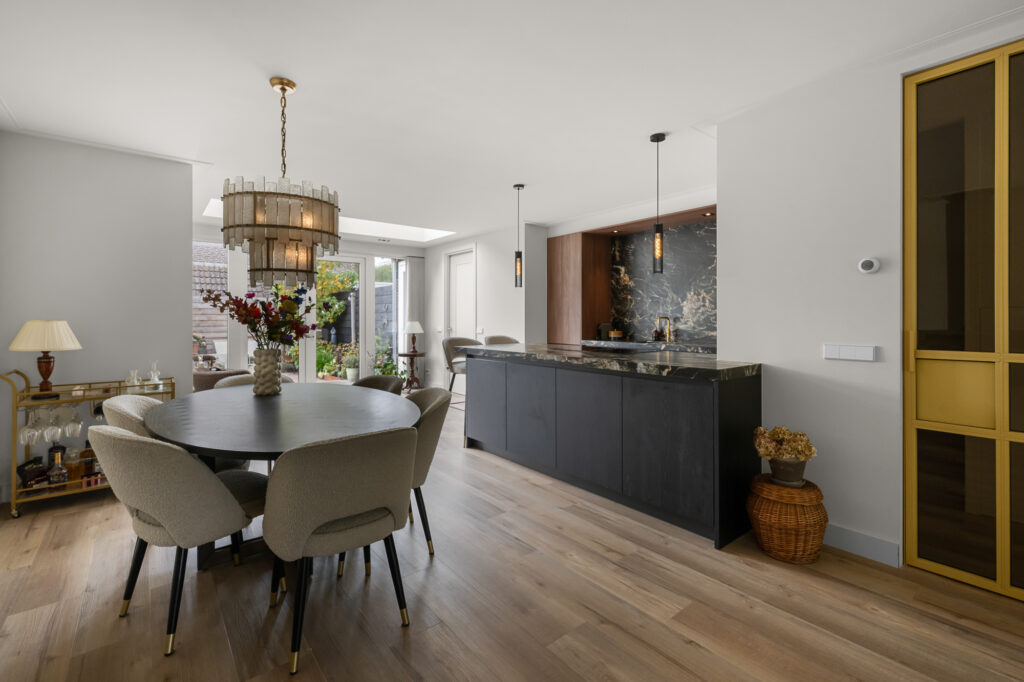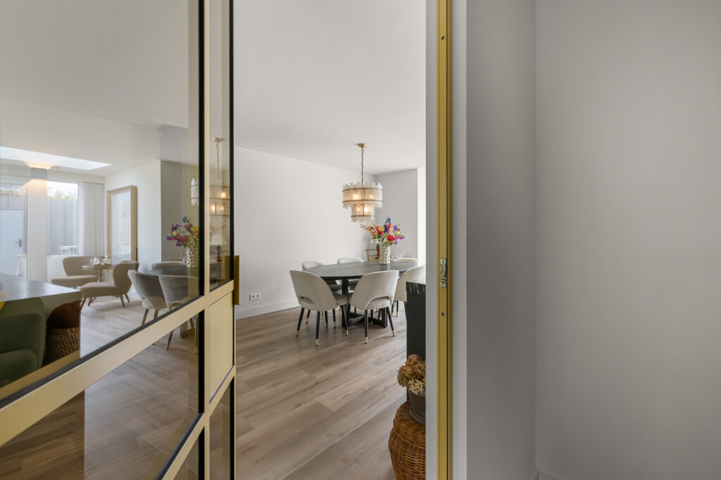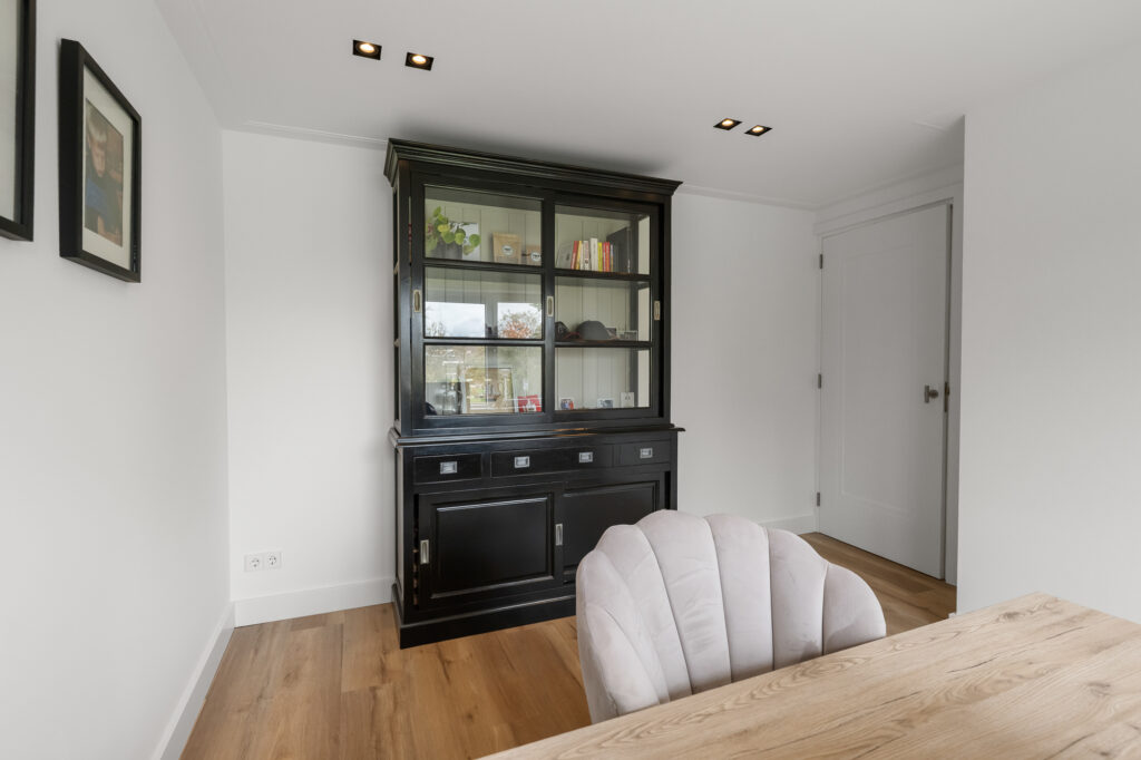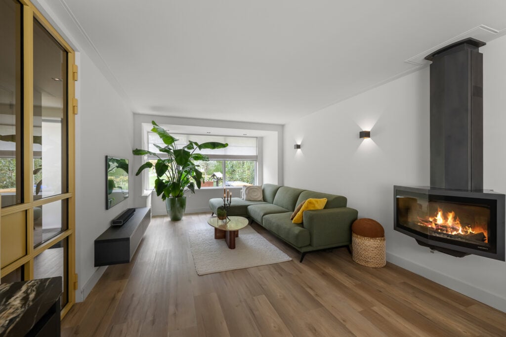 Zodra je de woning binnenstapt, valt het oog gelijk op de sfeervolle afwerking. Een warme pvc-vloer met vloerverwarming, het strakke stucwerk, de sfeervolle design houtkachel van Wanders en de uitermate luxe keuken met schiereiland zorgen voor een warme en hedendaagse uitstraling. Aan zowel de voor- als de achterzijde is de woning uitgebouwd. De achteruitbouw beschikt over een grote lichtkoepel en openslaande deuren die zorgen voor een zee aan licht en een vloeiende verbinding met de tuin.
