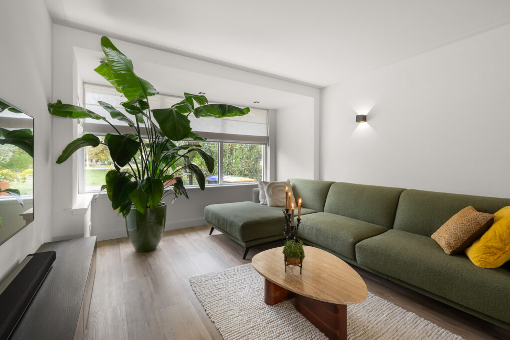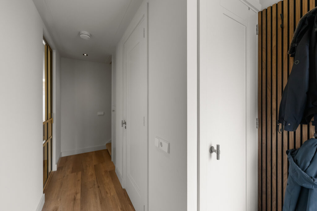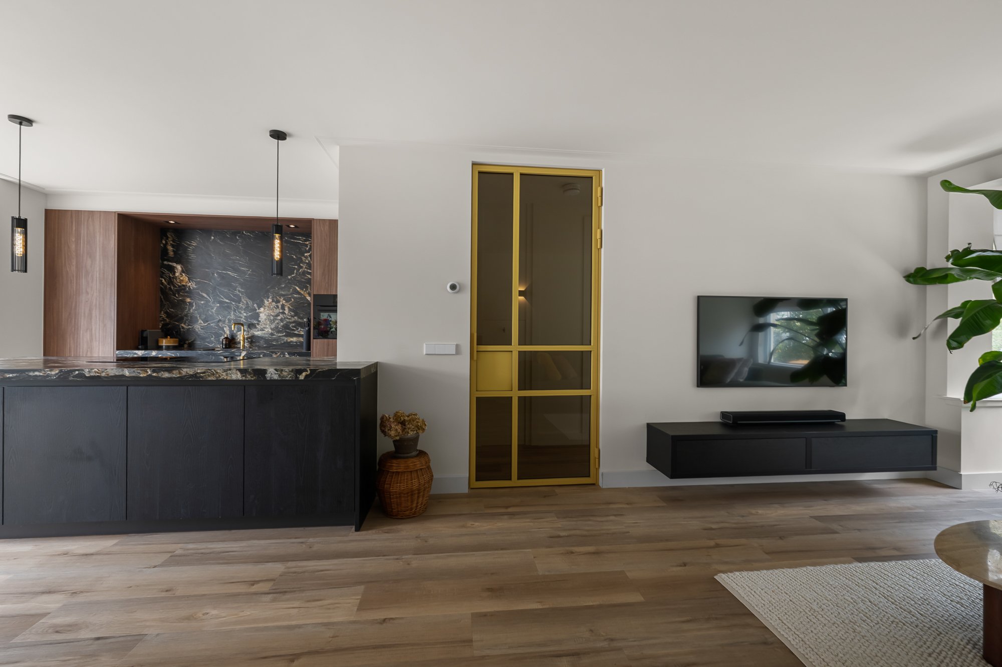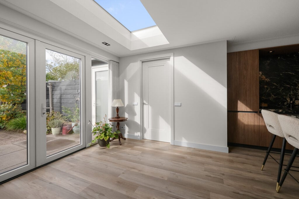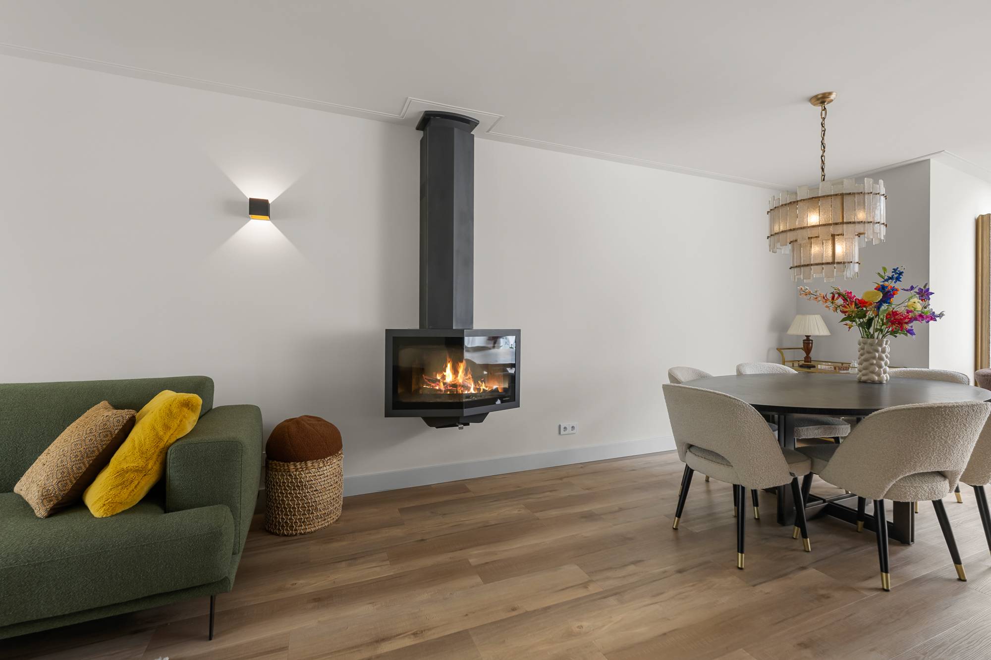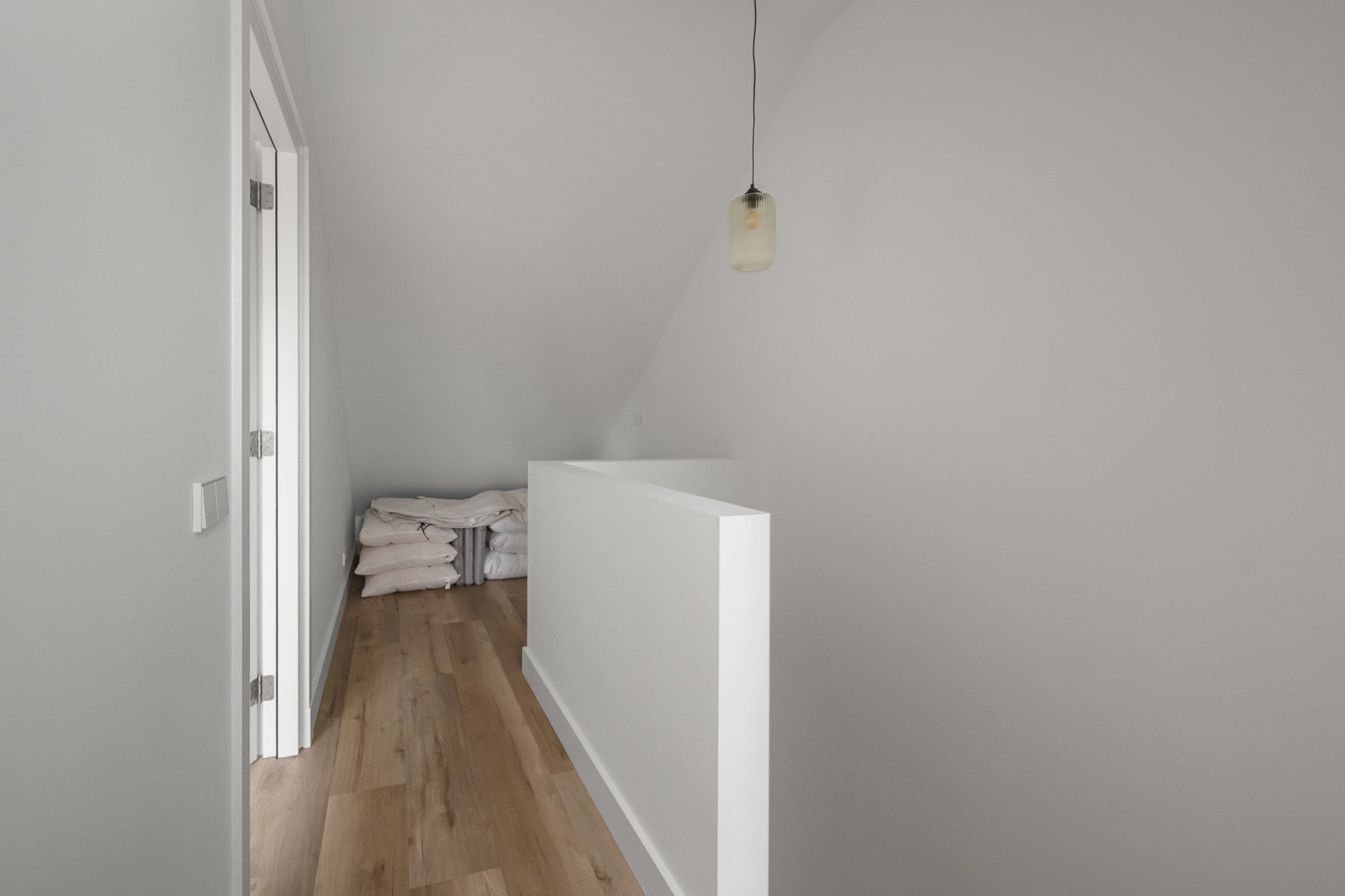 Zodra je de woning binnenstapt, valt het oog gelijk op de sfeervolle afwerking. Een warme pvc-vloer met vloerverwarming, het strakke stucwerk, de sfeervolle design houtkachel van Wanders en de uitermate luxe keuken met schiereiland zorgen voor een warme en hedendaagse uitstraling. Aan zowel de voor- als de achterzijde is de woning uitgebouwd. De achteruitbouw beschikt over een grote lichtkoepel en openslaande deuren die zorgen voor een zee aan licht en een vloeiende verbinding met de tuin.