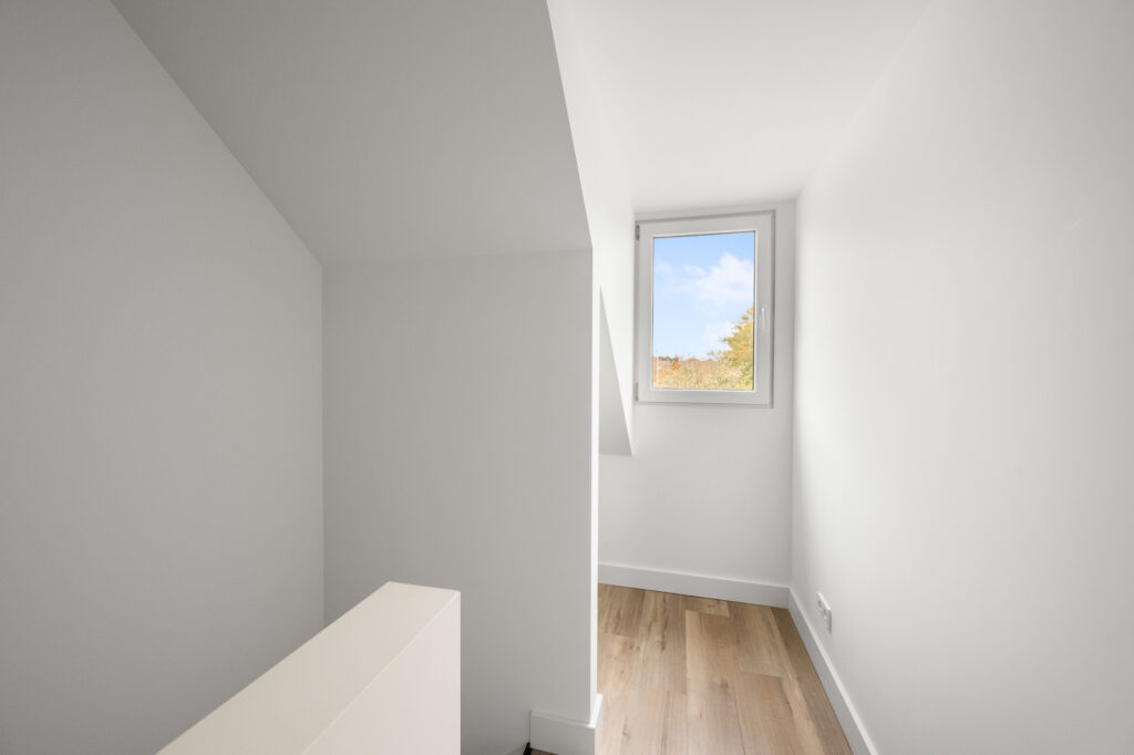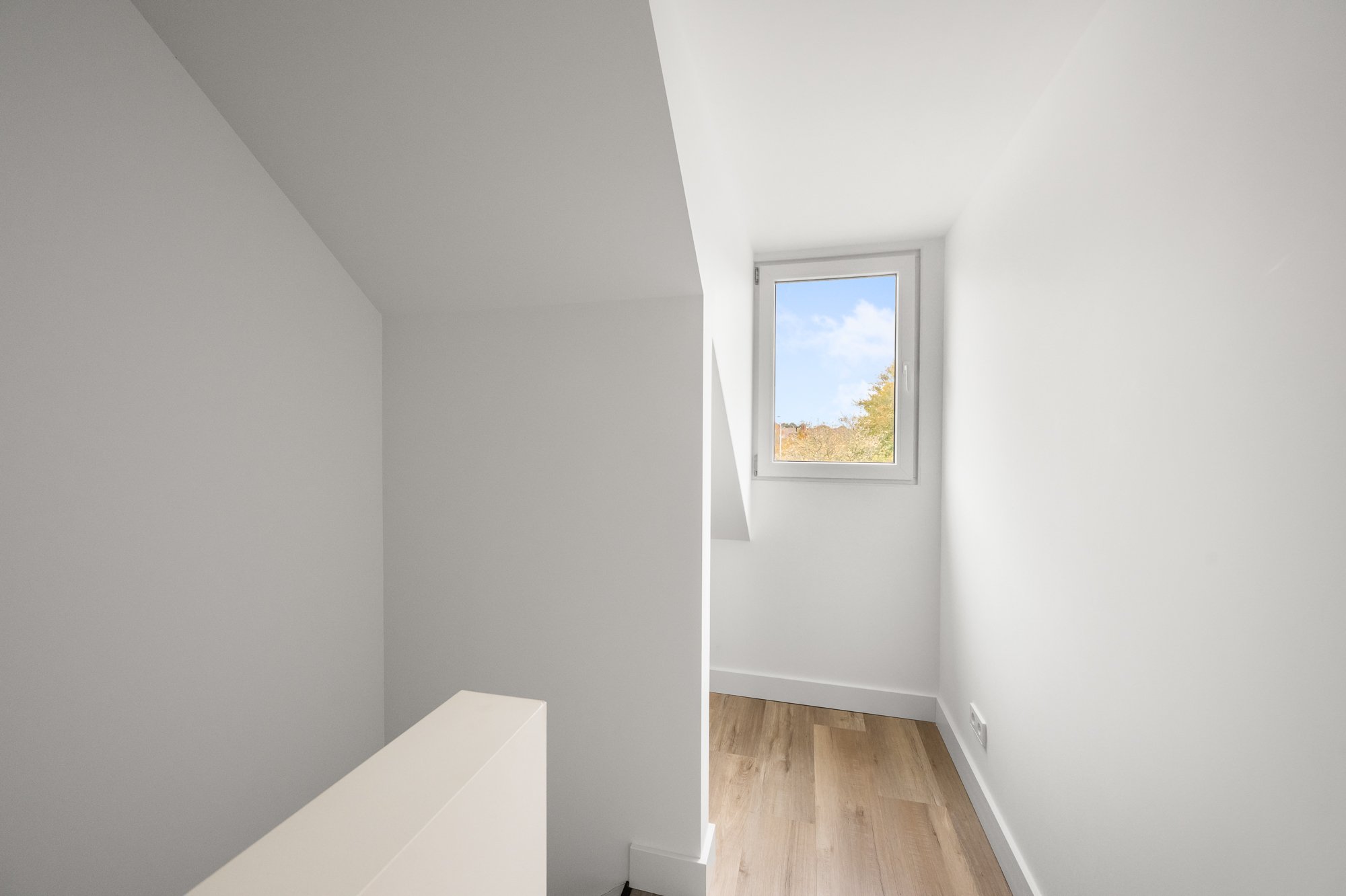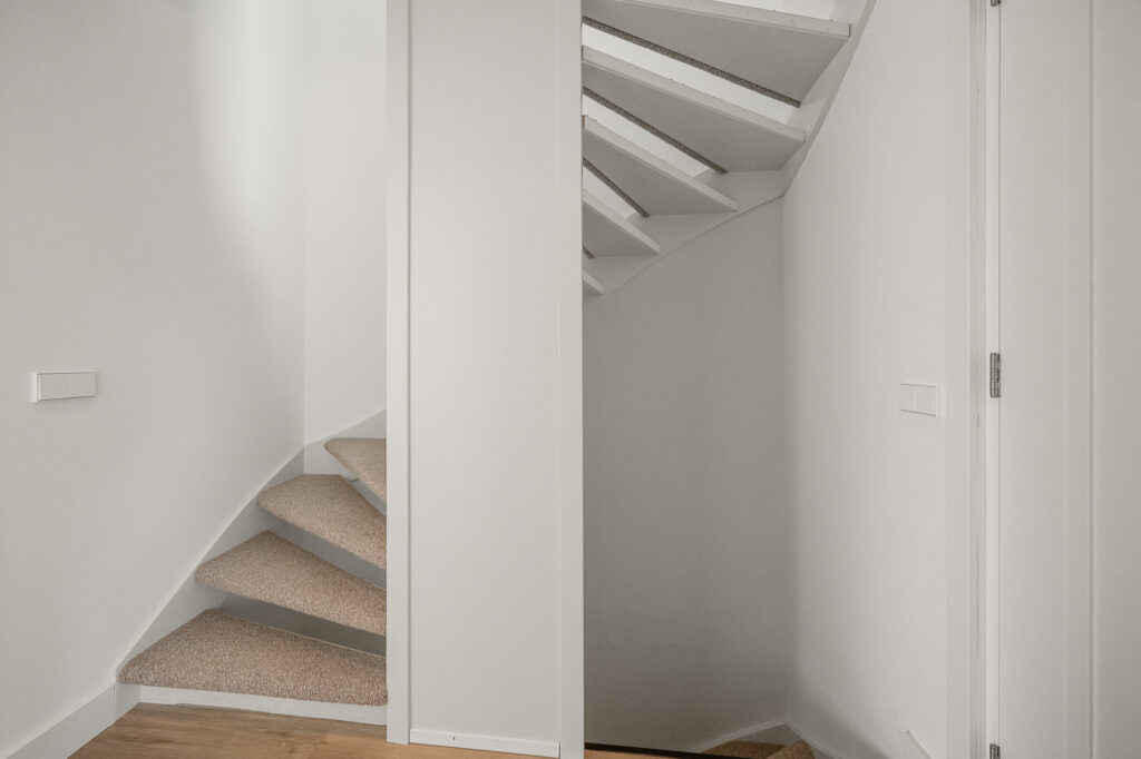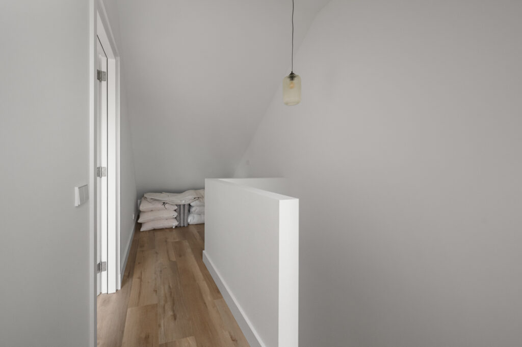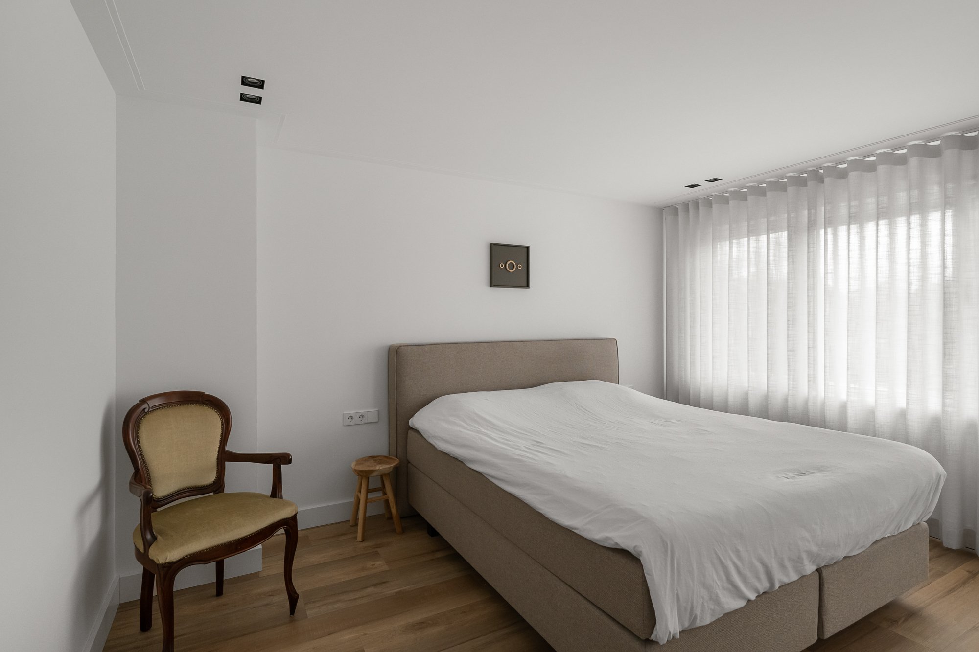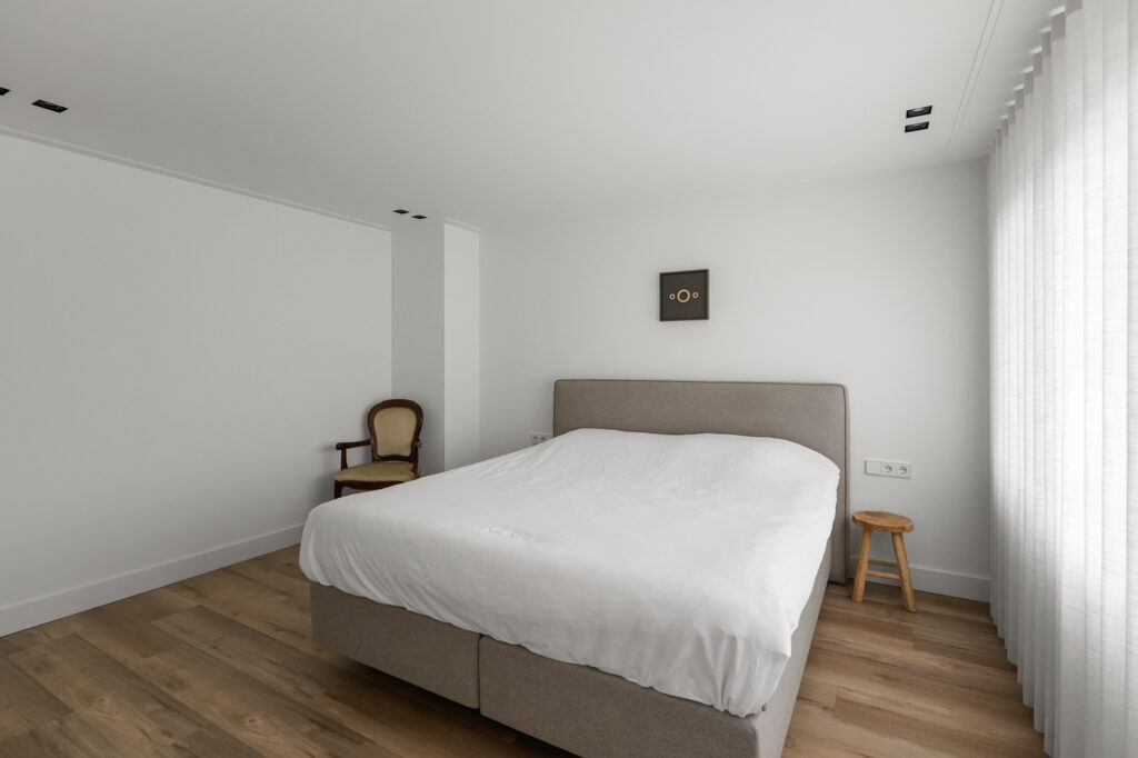 De eerste verdieping telt twee ruime slaapkamers, waarvan de hoofdslaapkamer is ingericht met een maatwerk kastenwand en grote ramen. De tweede kamer is perfect als kinderkamer of werkkamer. Indien gewenst kan met een kleine aanpassing een extra slaapkamer gerealiseerd worden. De badkamer is strak en modern afgewerkt met een inloopdouche, een tweede toilet en een breed wastafelmeubel met verlichting – alles uitgevoerd in warme beige tinten en met hoogwaardige materialen.