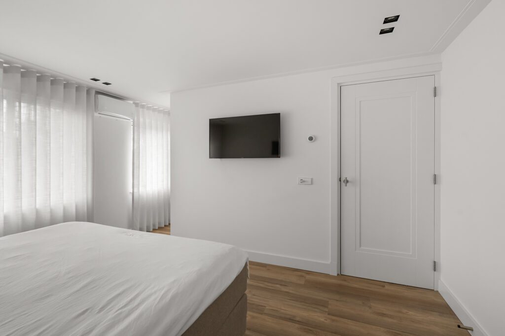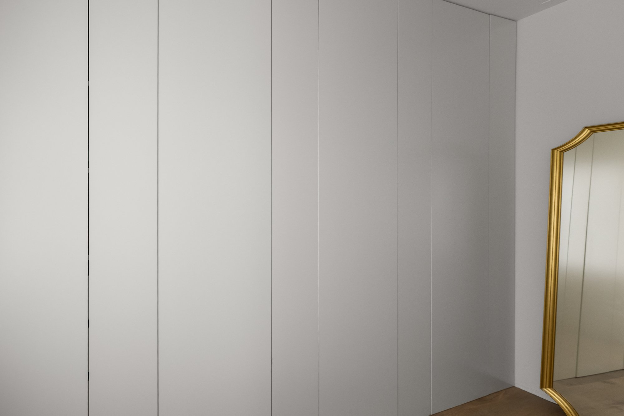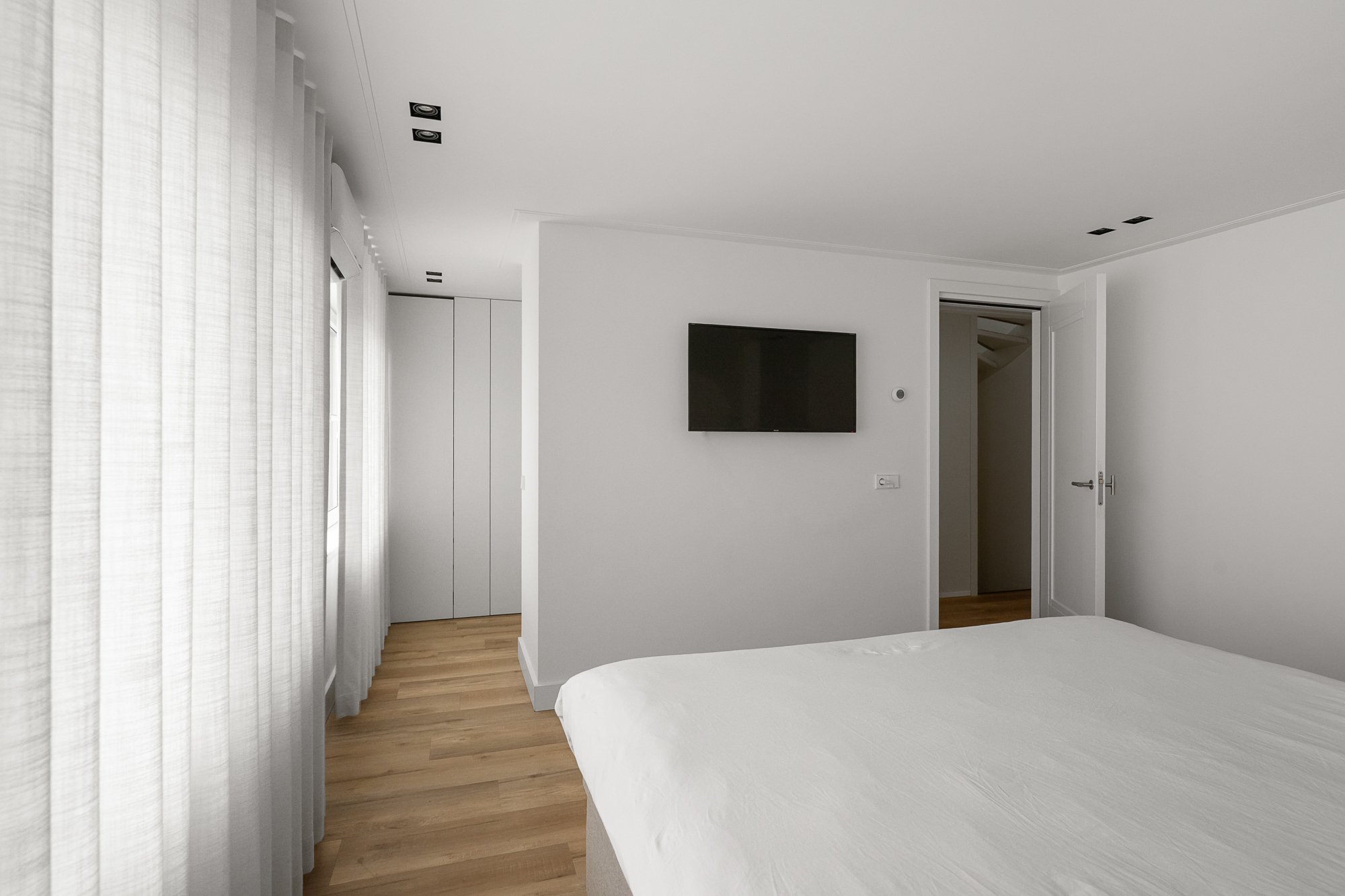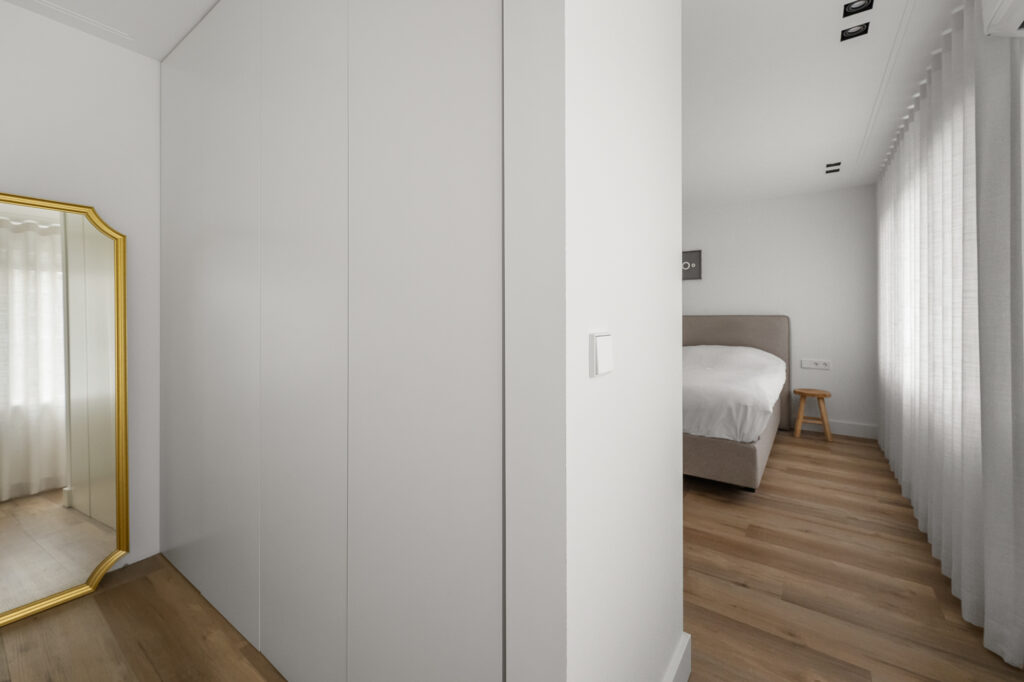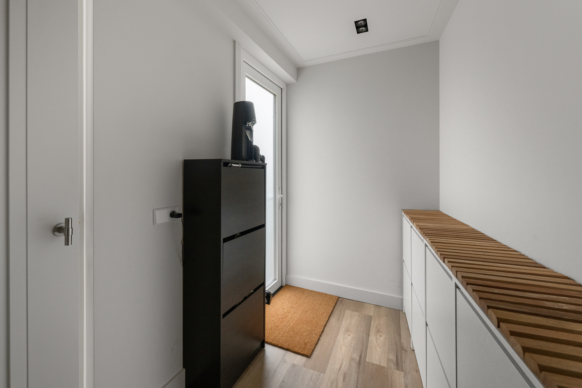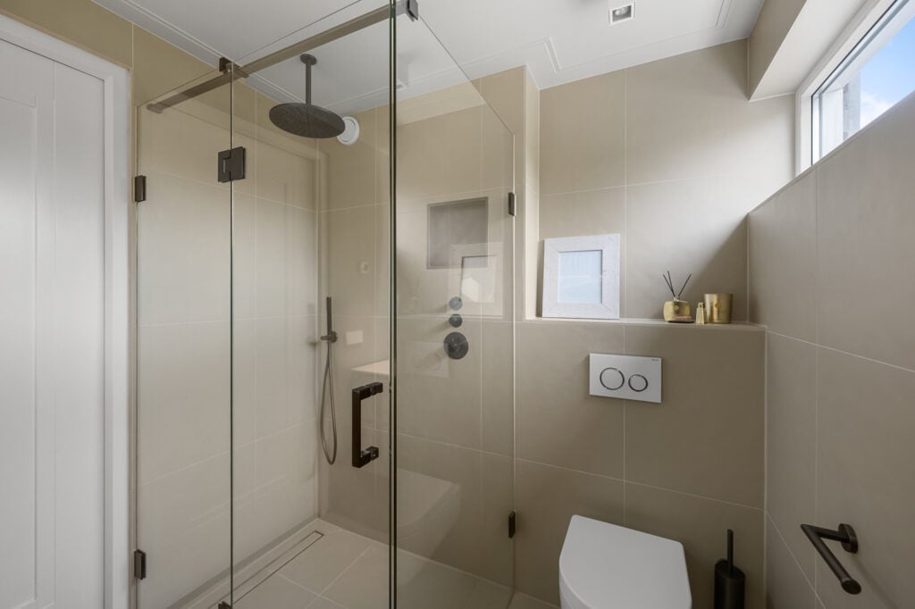 De eerste verdieping telt twee ruime slaapkamers, waarvan de hoofdslaapkamer is ingericht met een maatwerk kastenwand en grote ramen. De tweede kamer is perfect als kinderkamer of werkkamer. Indien gewenst kan met een kleine aanpassing een extra slaapkamer gerealiseerd worden. De badkamer is strak en modern afgewerkt met een inloopdouche, een tweede toilet en een breed wastafelmeubel met verlichting – alles uitgevoerd in warme beige tinten en met hoogwaardige materialen.