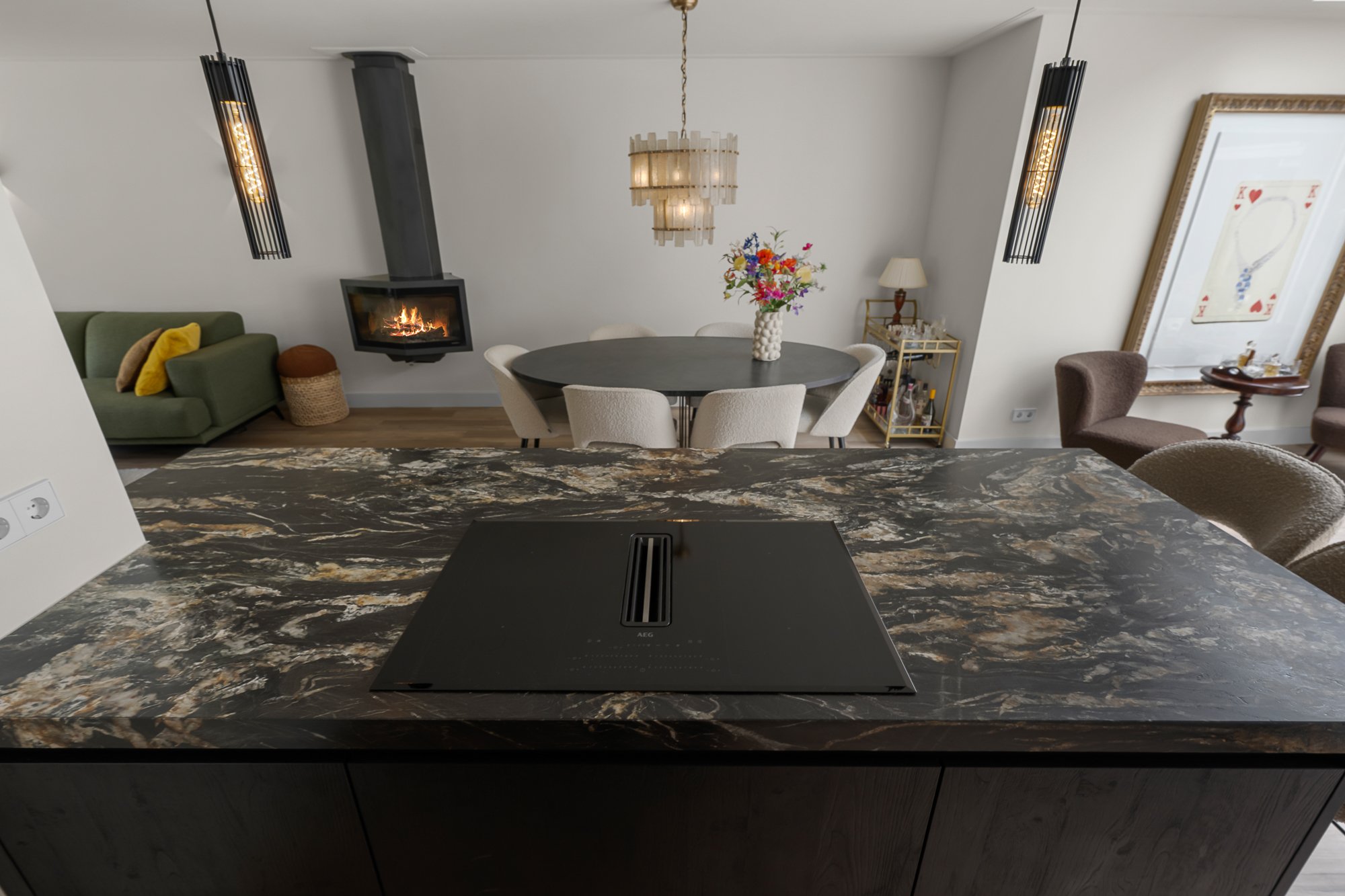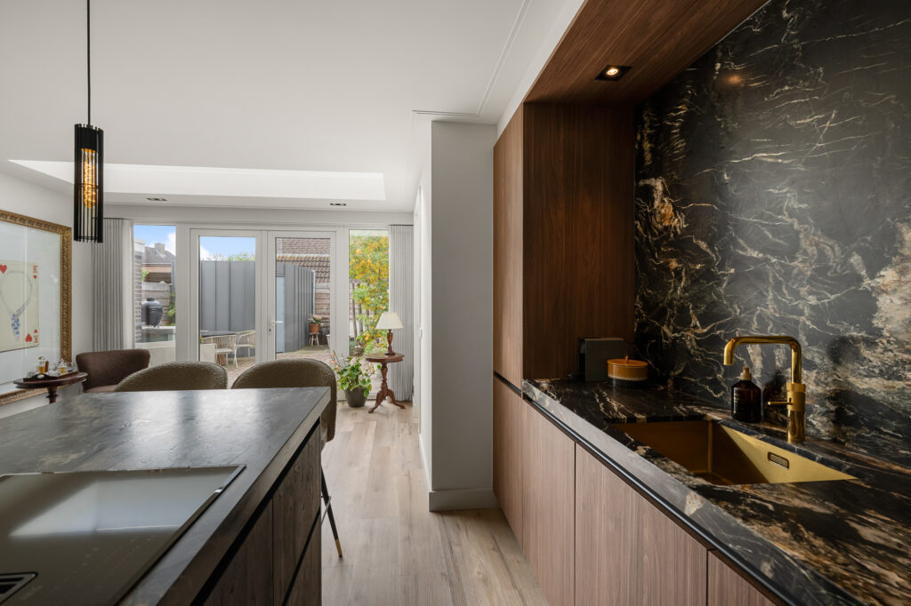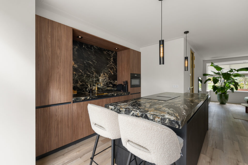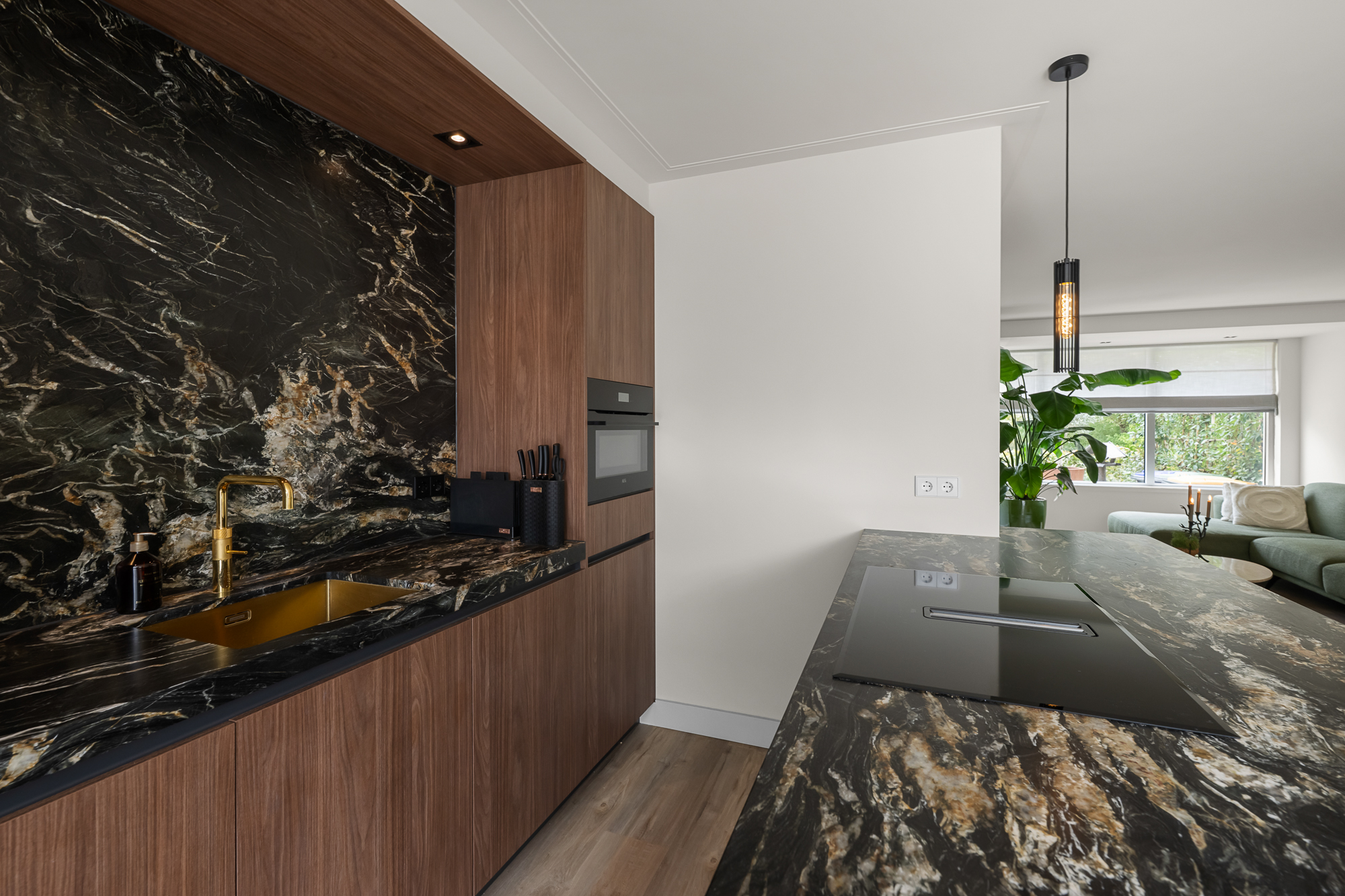 – luxe keuken (2022) met o.a. inductiekookplaat met afzuiging, combi-oven, vaatwasser, Quooker en marmeren werkblad;