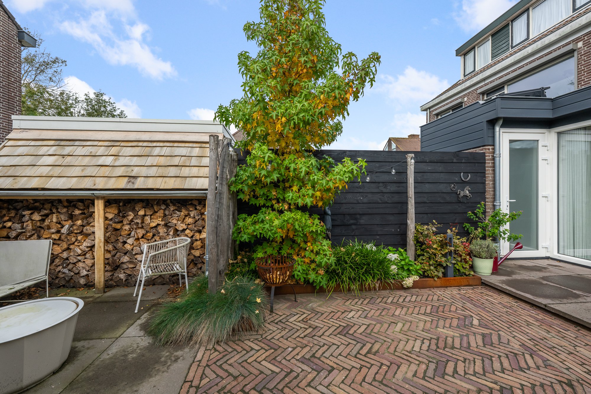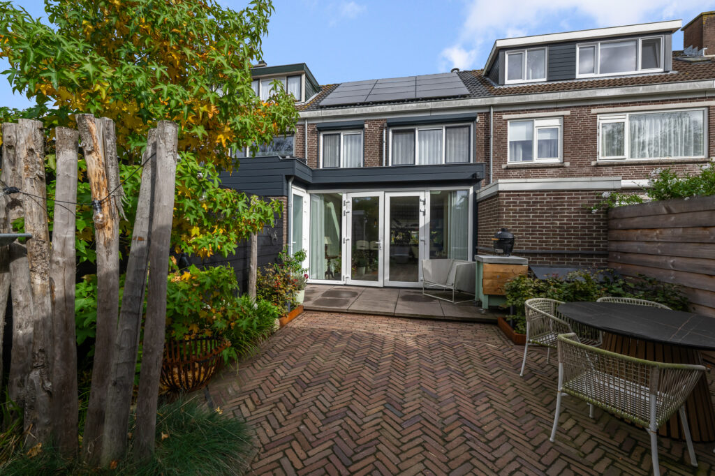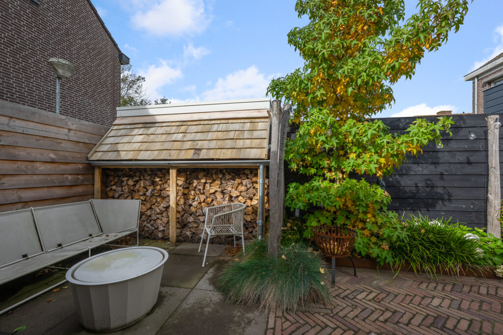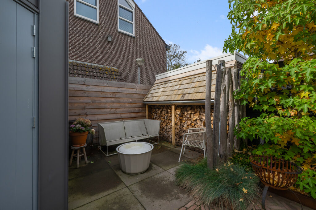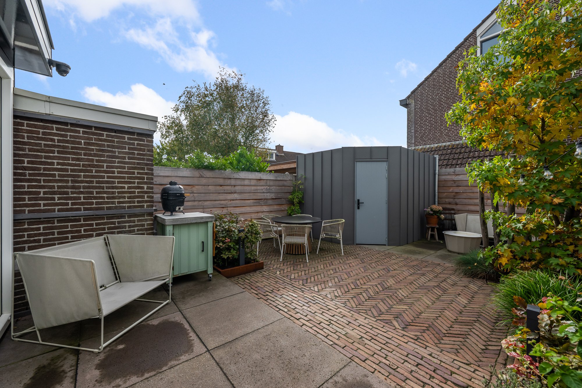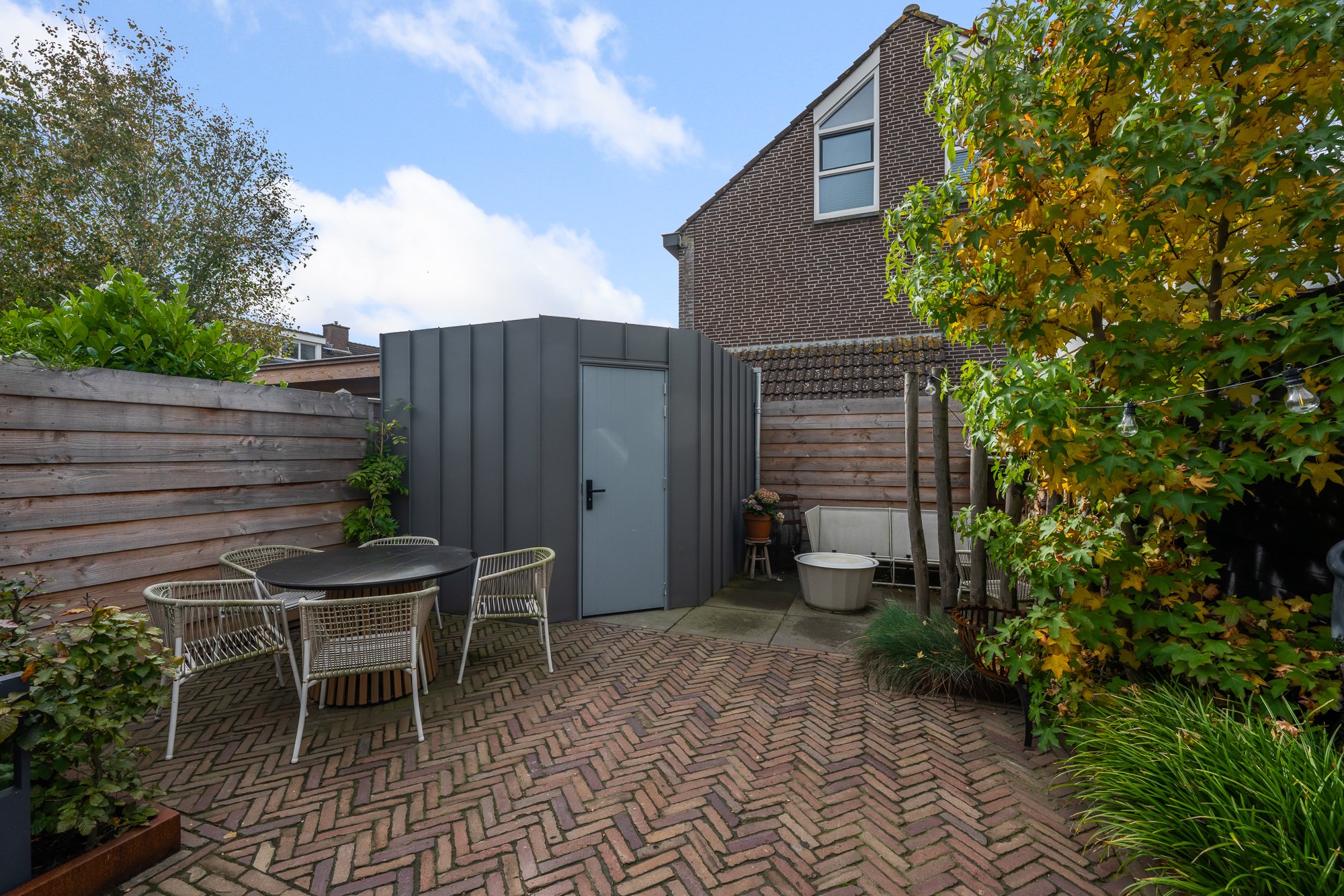 De zonnige achtertuin is onderhoudsvriendelijk aangelegd met sierbestrating, een moderne berging en een gezellige zithoek. Dankzij de gunstige ligging geniet je hier de hele middag en avond van de zon.
