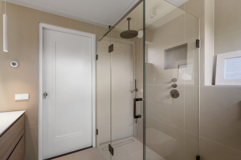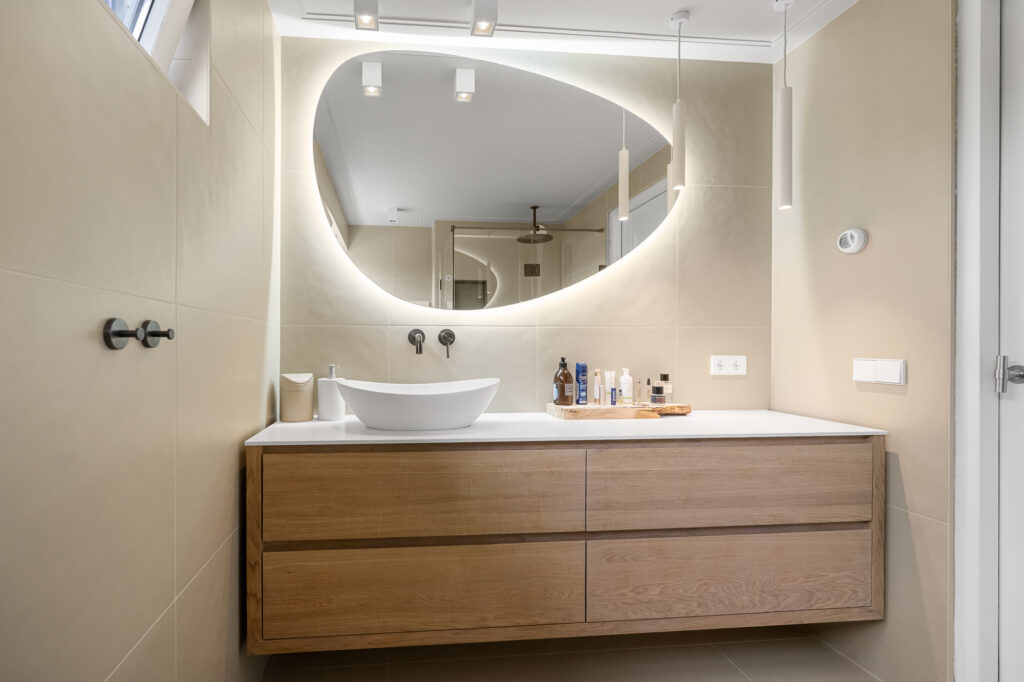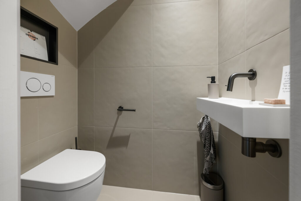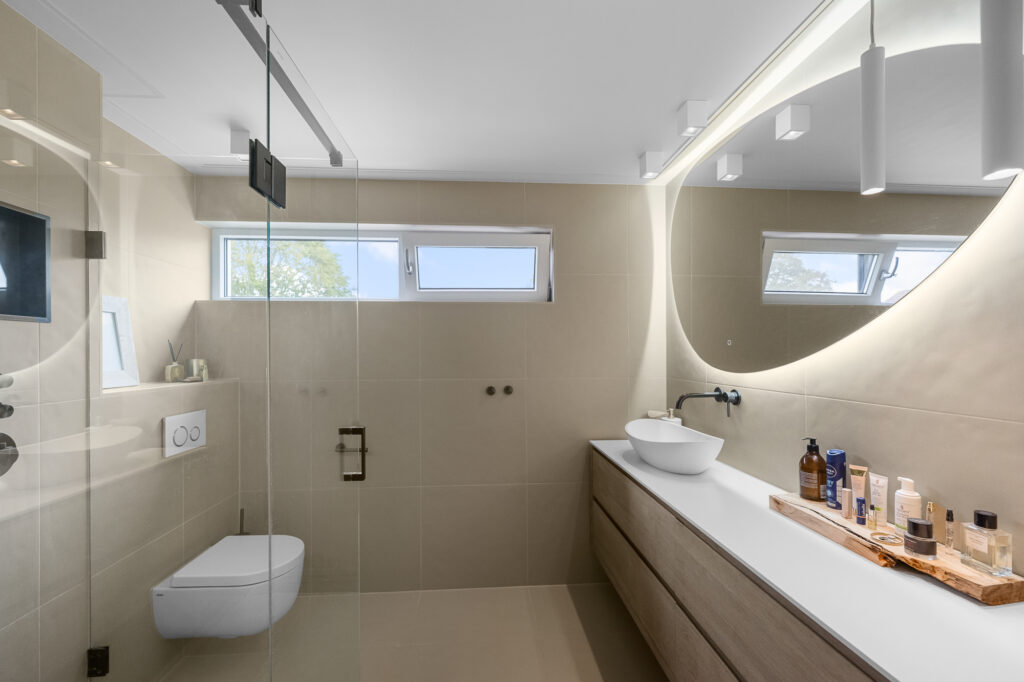 – moderne badkamer (2022) met inloopdouche, 2e toilet, en breed wastafelmeubel, Alles in warme tinten en hoogwaardige materialen;