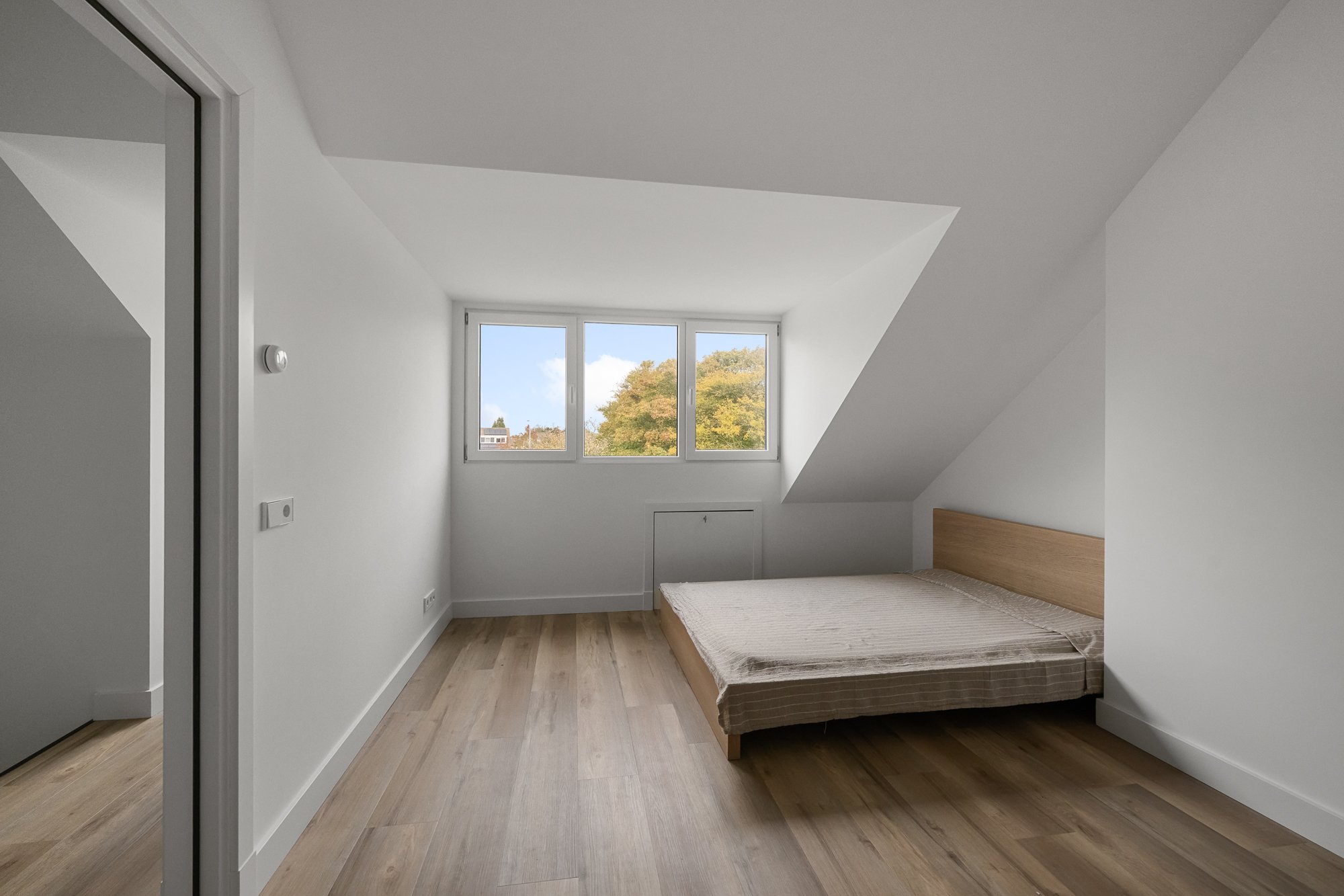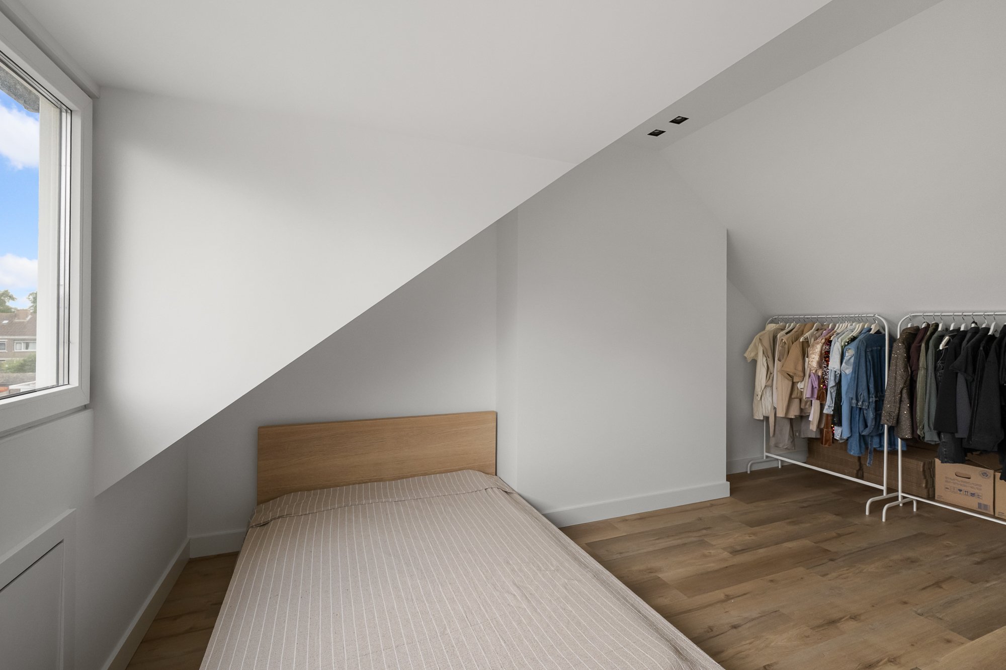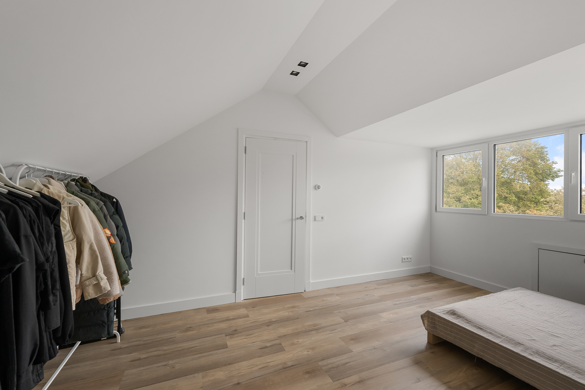 Op de tweede verdieping bevindt zich de derde slaapkamer, ruim, licht en voorzien van een grote dakkapel en bergruimte achter de knieschotten. Ook hier is dezelfde fraaie vloer gelegd en is vloerverwarming aanwezig.
