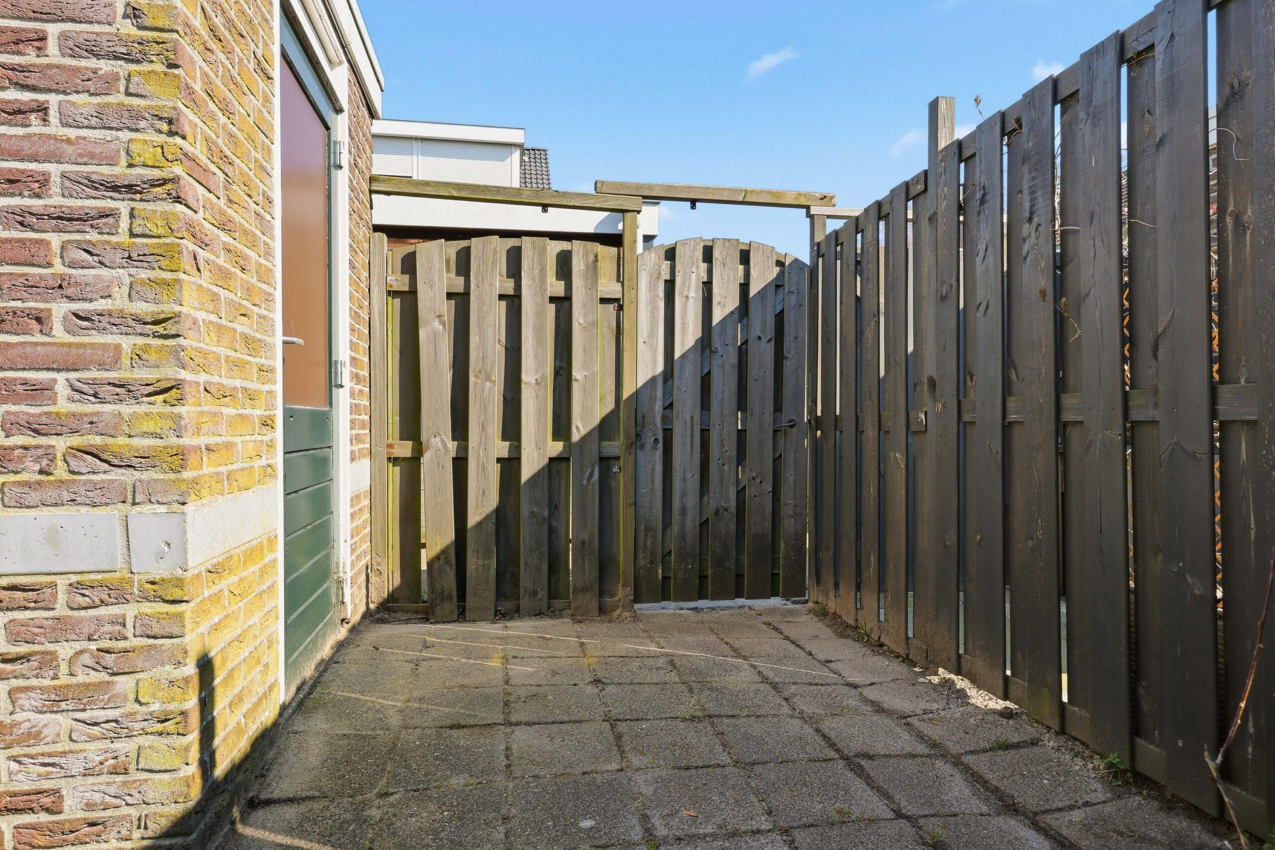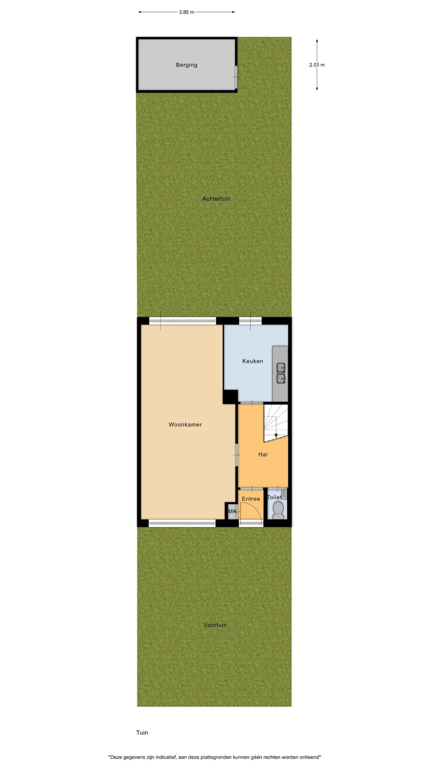 – Diepe achtertuin met stenen berging