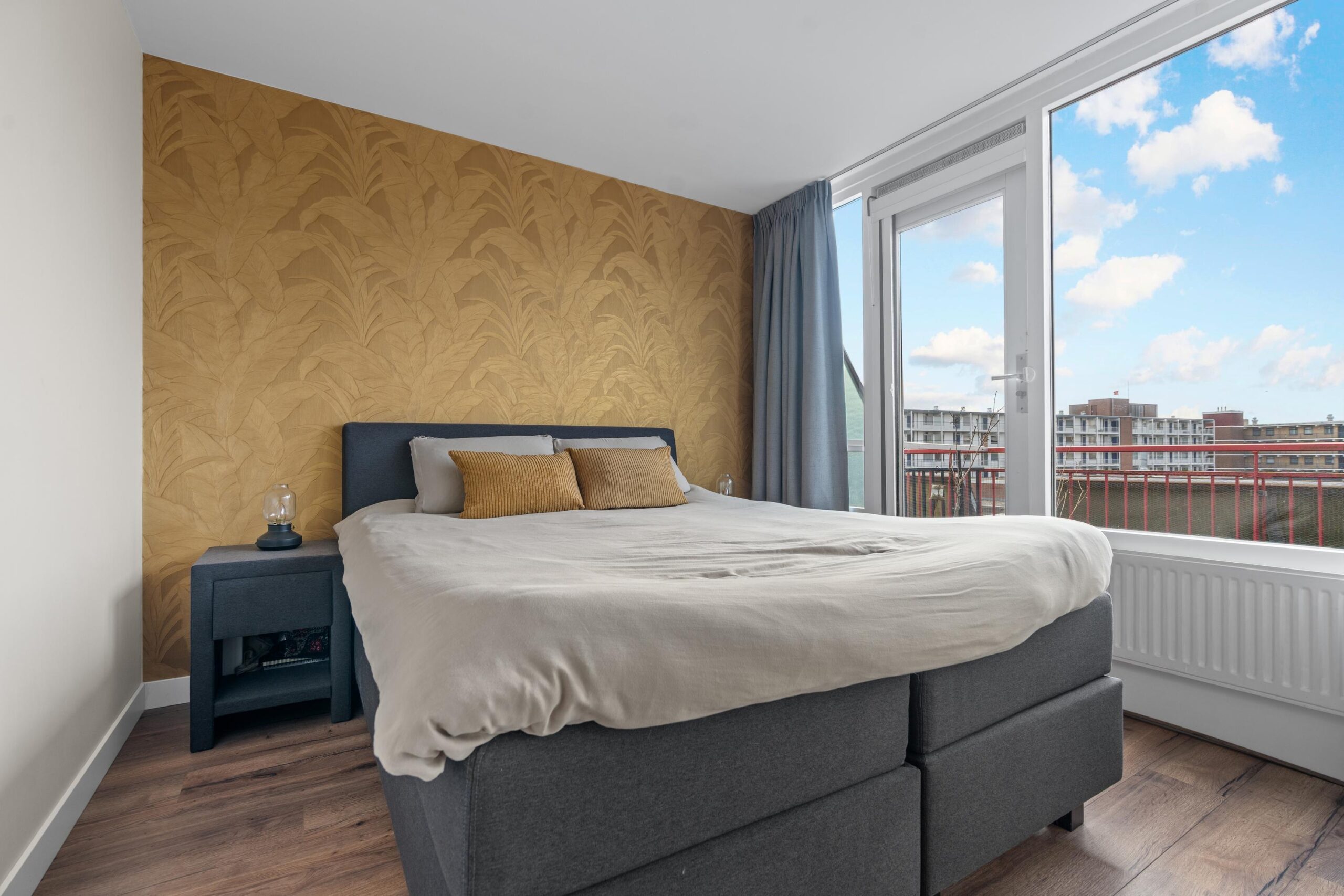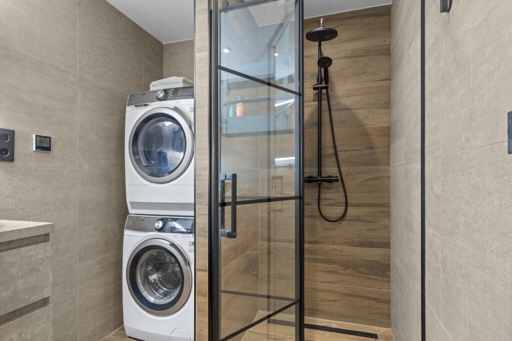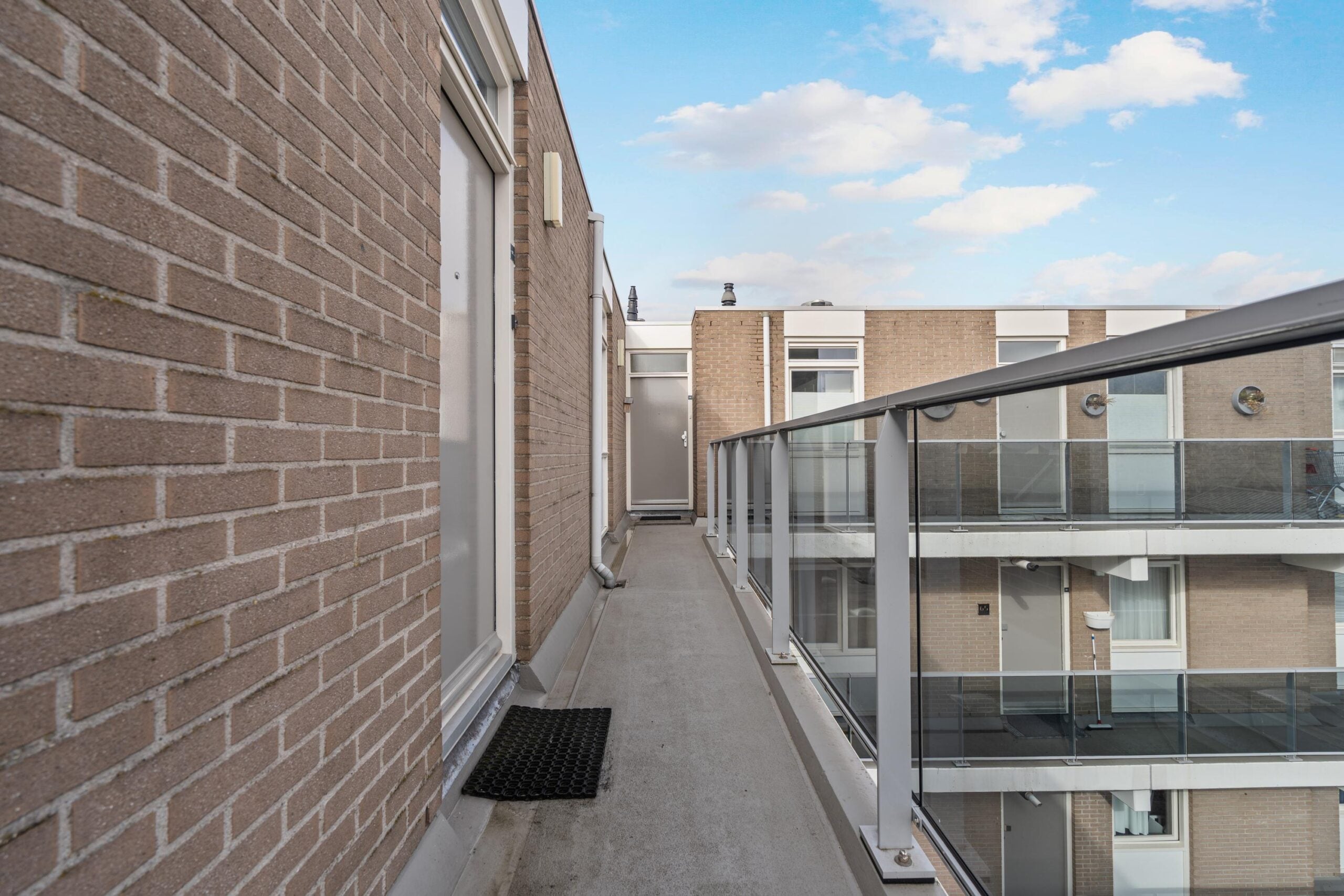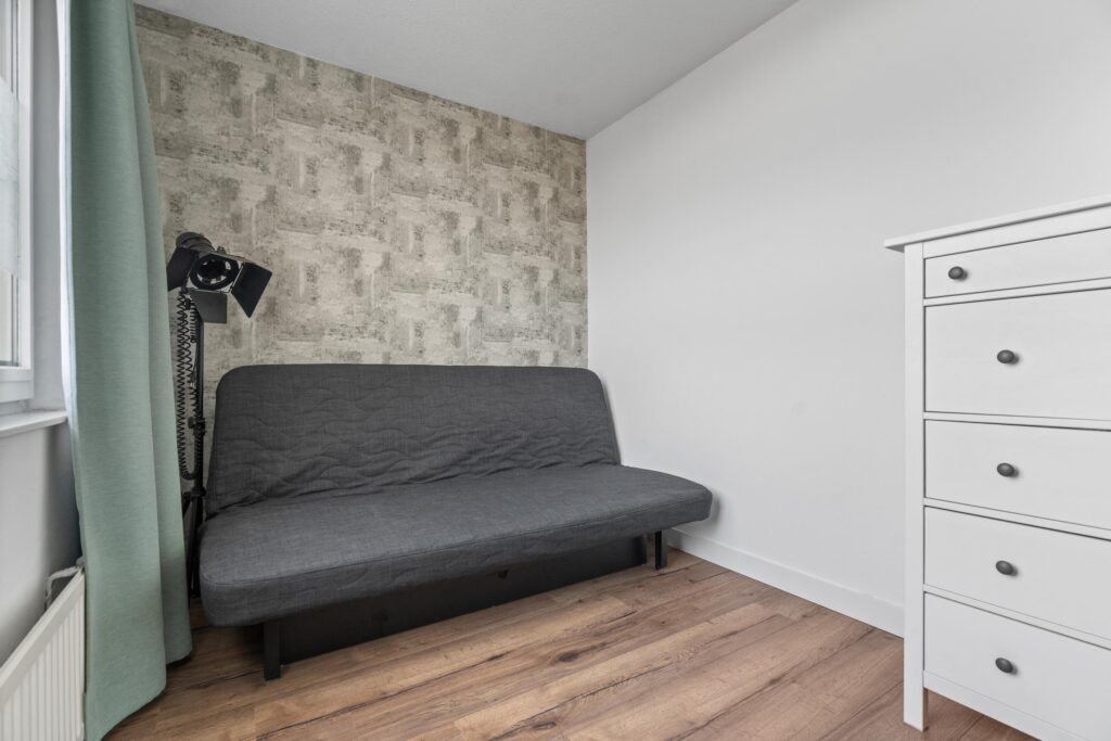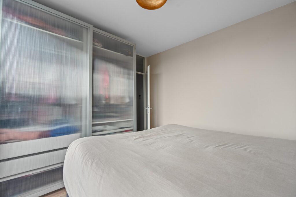 Kom binnen in de centrale hal met bellentableau en brievenbus. Stap in de lift naar de 4e etage en treed binnen op nummer 97. Bij binnenkomst treffen we direct de vernieuwde meterkast (2025). Ook heb je toegang tot de 2 slaapkamers waarvan de master bedroom toegang geeft tot een gedeelte van het zonneterras. De sfeervolle badkamer (2021) is van alle gemakken voorzien met dubbele wastafelmeubel, douche en wasmachine aansluiting. Het separate toilet is in dezelfde stijl en sfeer als de badkamer vervangen.