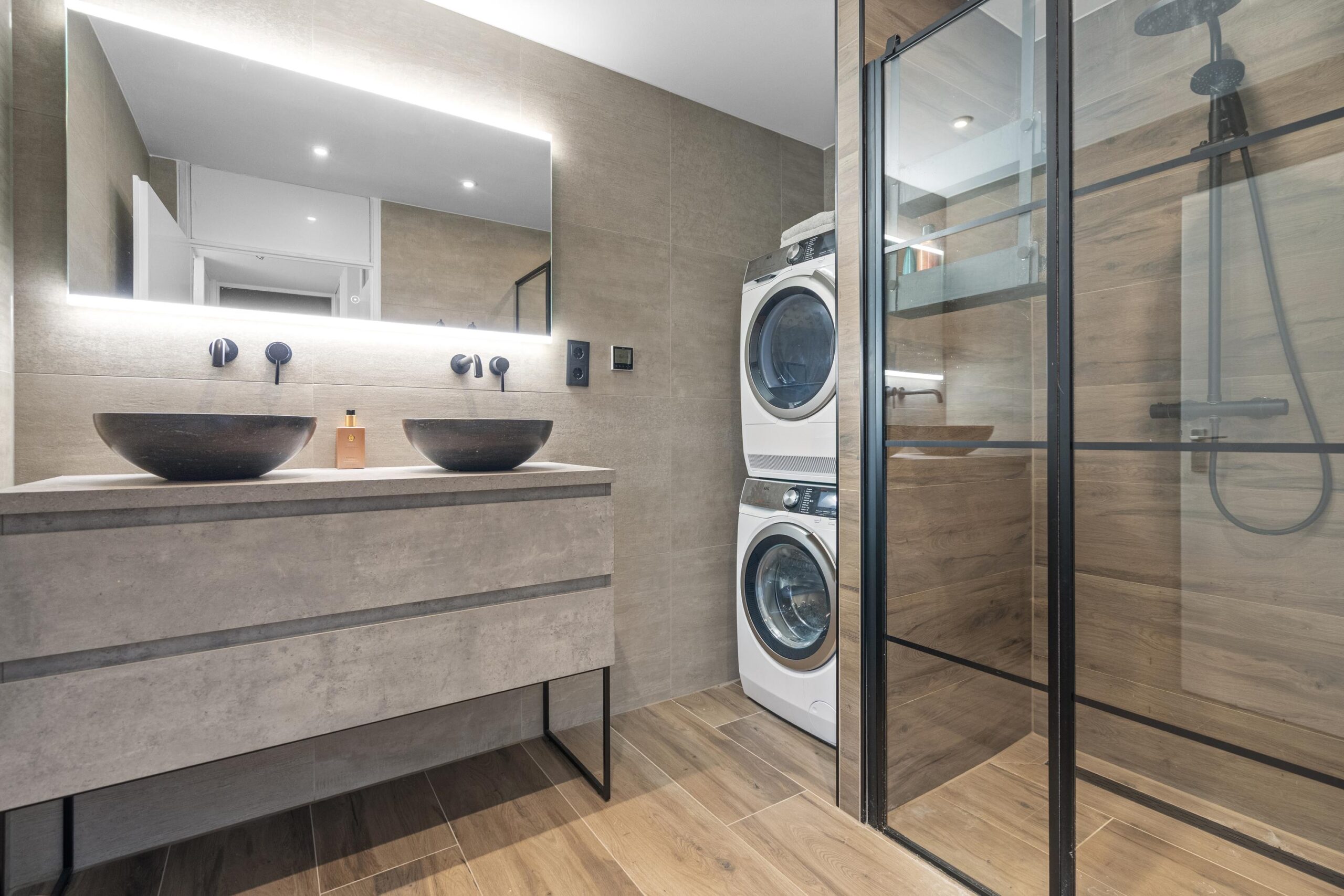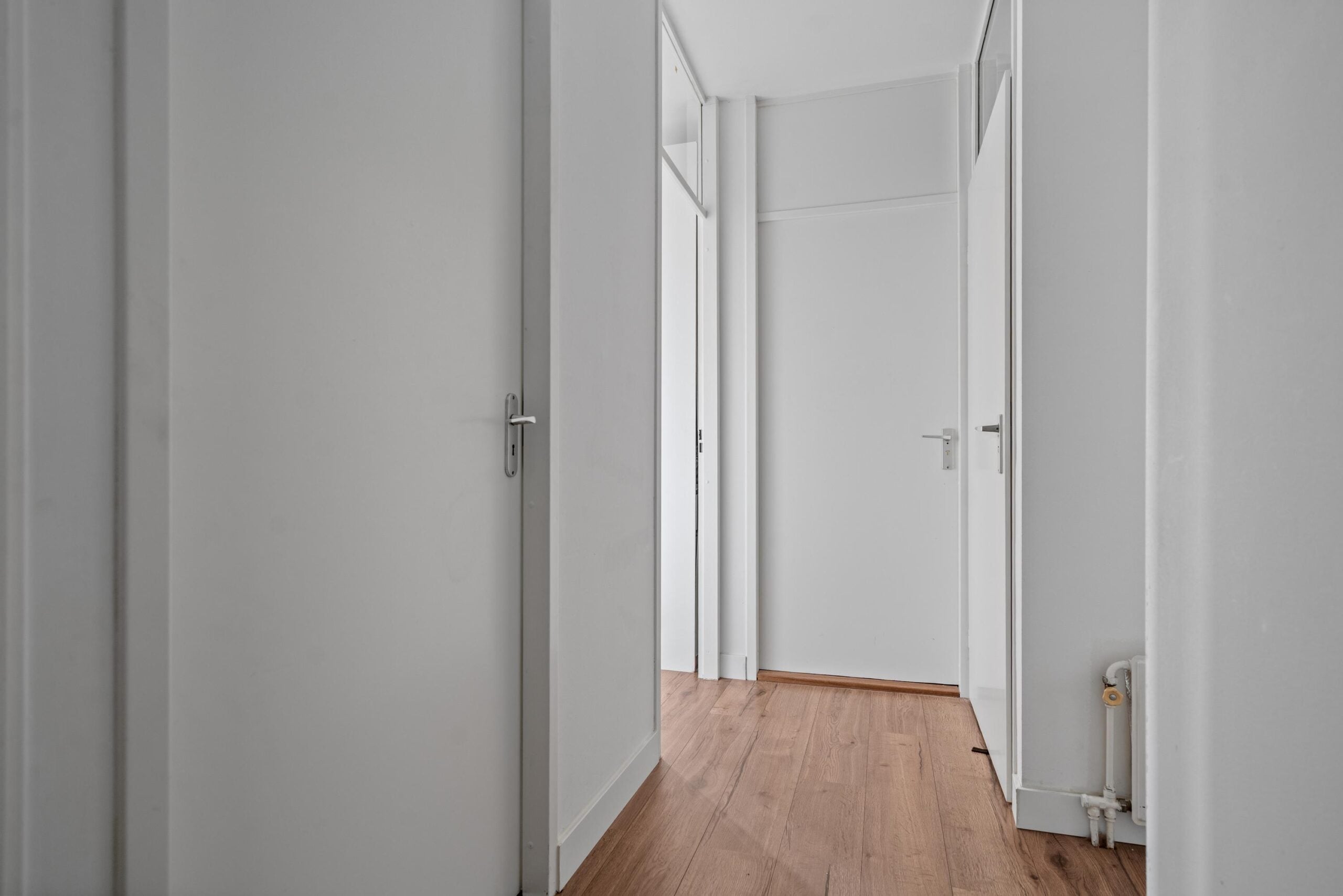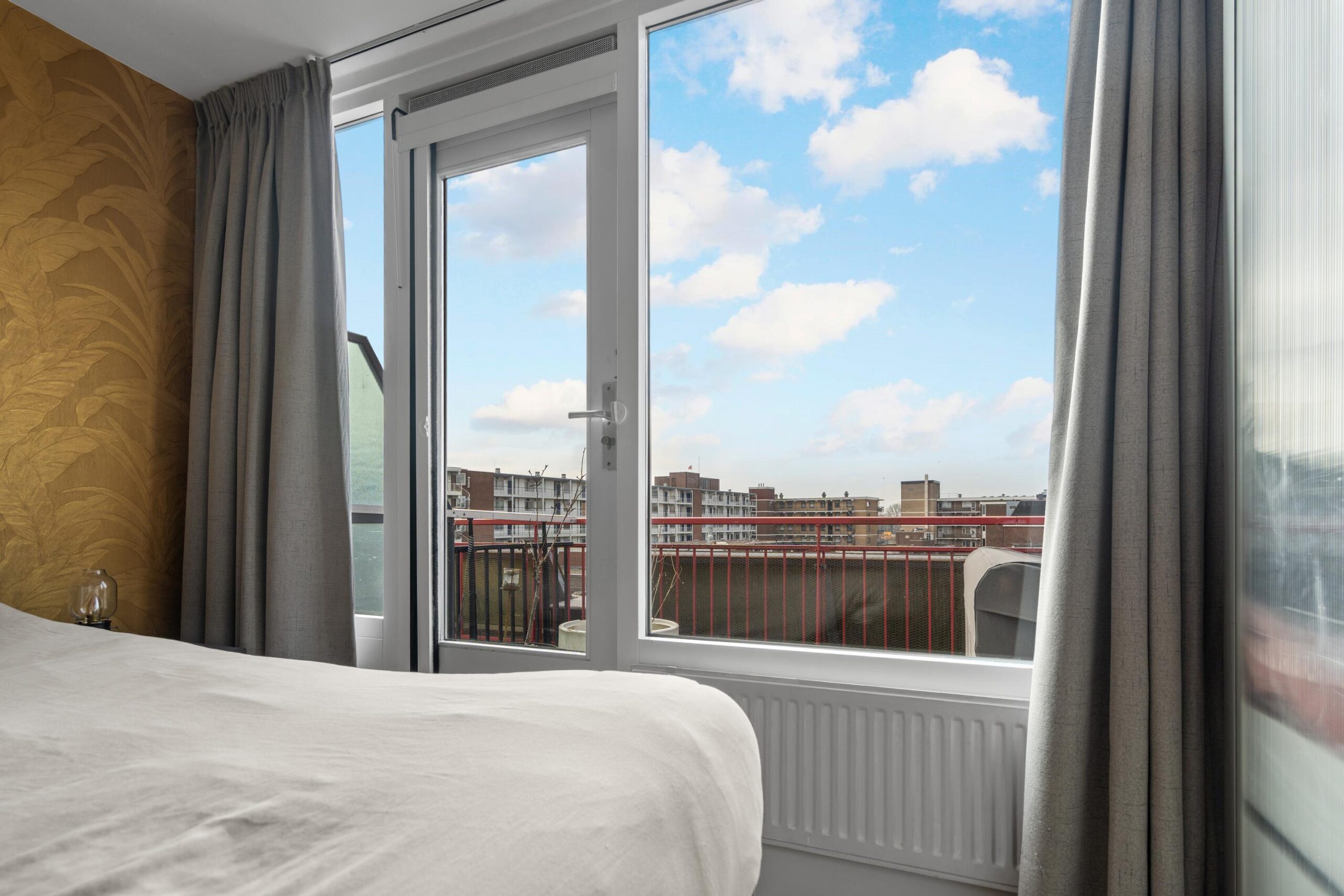 Kom binnen in de centrale hal met bellentableau en brievenbus. Stap in de lift naar de 4e etage en treed binnen op nummer 97. Bij binnenkomst treffen we direct de vernieuwde meterkast (2025). Ook heb je toegang tot de 2 slaapkamers waarvan de master bedroom toegang geeft tot een gedeelte van het zonneterras. De sfeervolle badkamer (2021) is van alle gemakken voorzien met dubbele wastafelmeubel, douche en wasmachine aansluiting. Het separate toilet is in dezelfde stijl en sfeer als de badkamer vervangen.