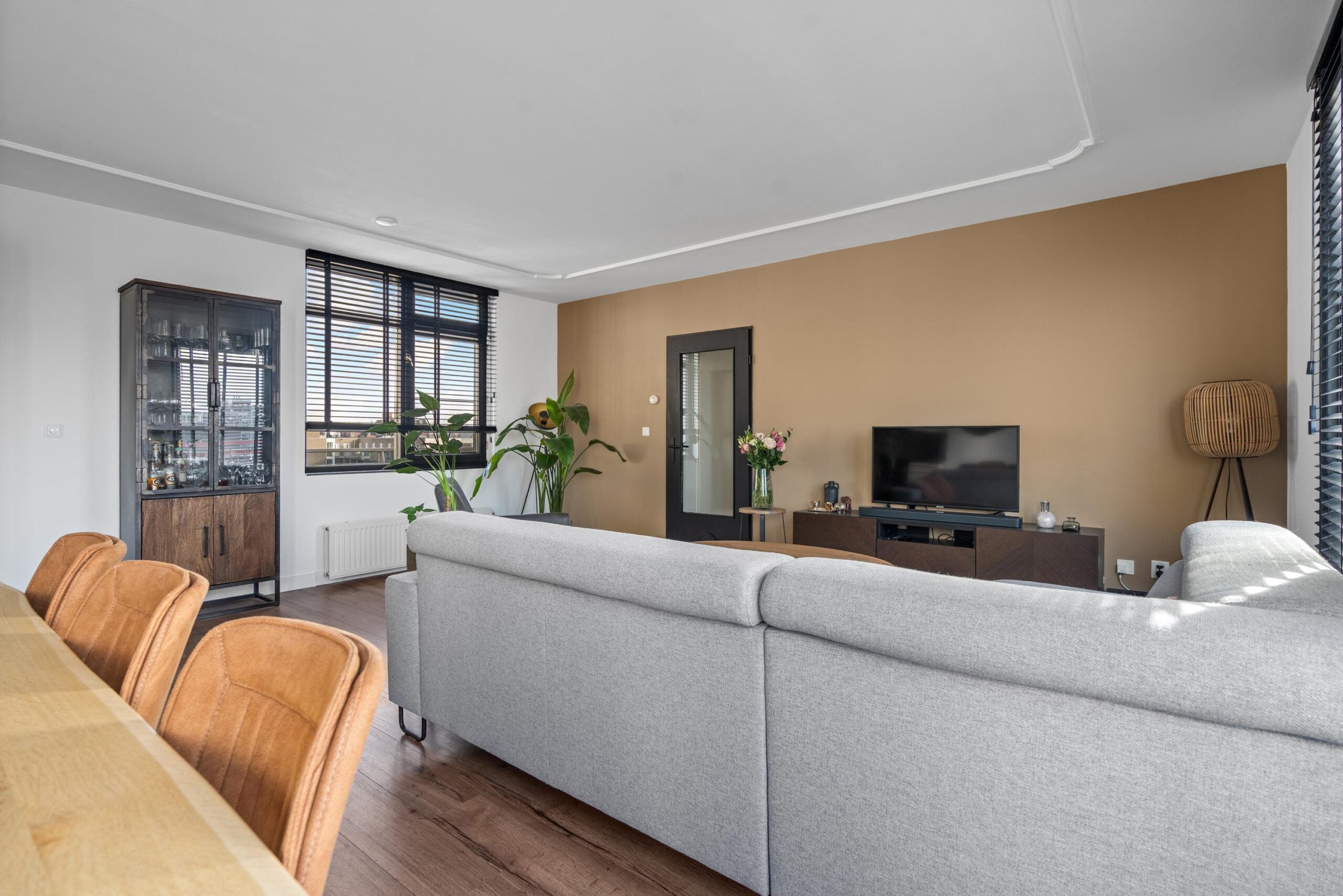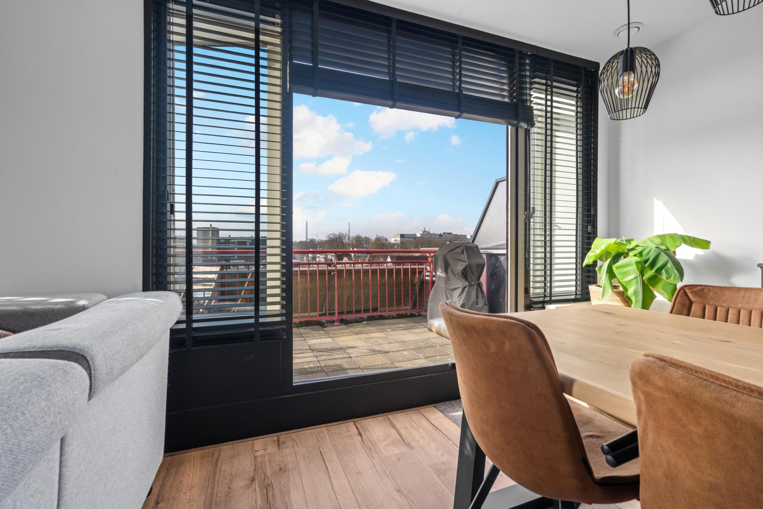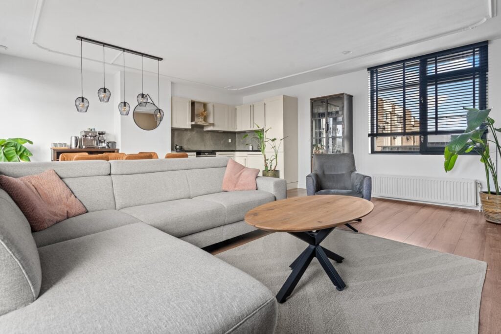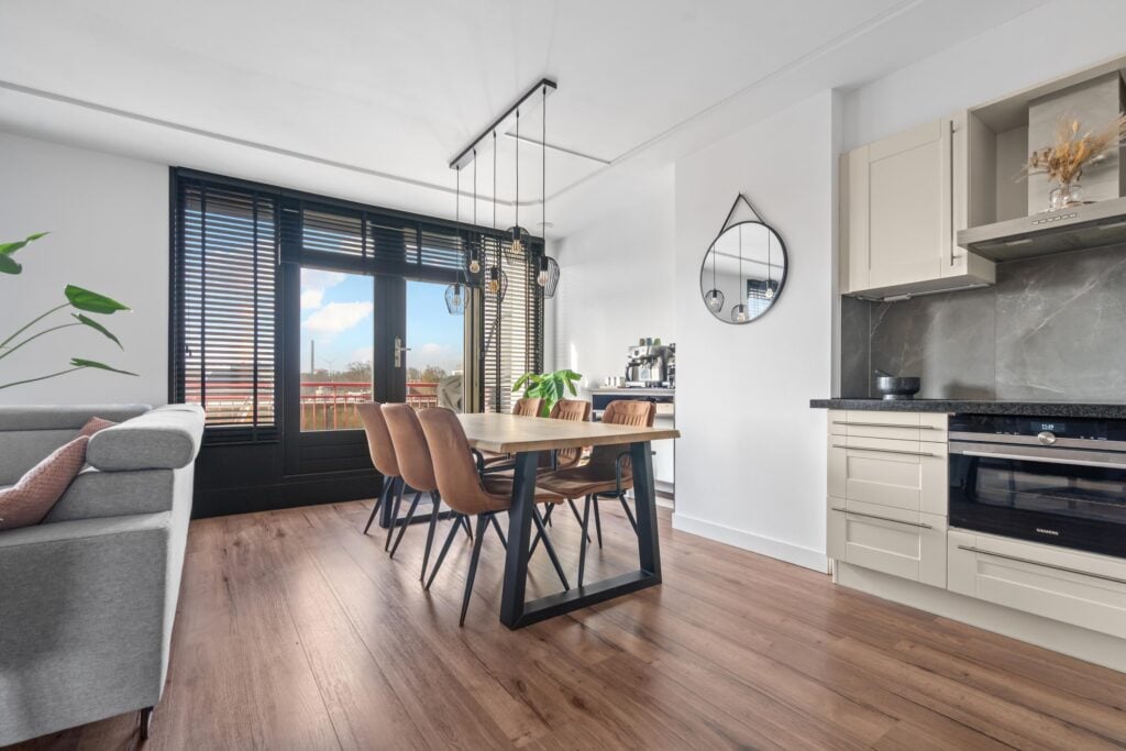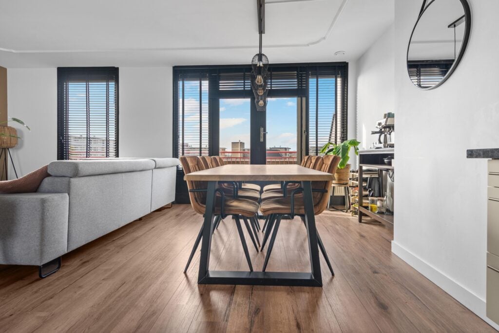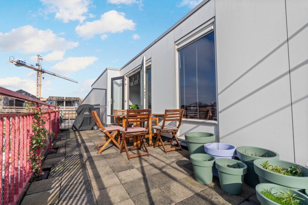 De ruime woonkamer met open keuken heeft een fantastisch lichtinval. Door de grote raampartijen en de openslaande deuren naar het ruime zonneterras creëer je hier het echte binnen buiten gevoel. De open keuken heeft een neutrale basis en past in ieders interieur. Alle inbouwapparatuur is aanwezig, hier kun je met een gerust hart de sterren van de hemel koken. Wat dit appartement uniek maakt, is het zeer riante zonneterras. Het terras, toegankelijk via de openslaande deuren, geeft uitzicht over Beverwijk. De ligging van het terras (zuidwesten) kan niet beter, hier kun je van de middag tot ’s avonds genieten van de ondergaande zon.