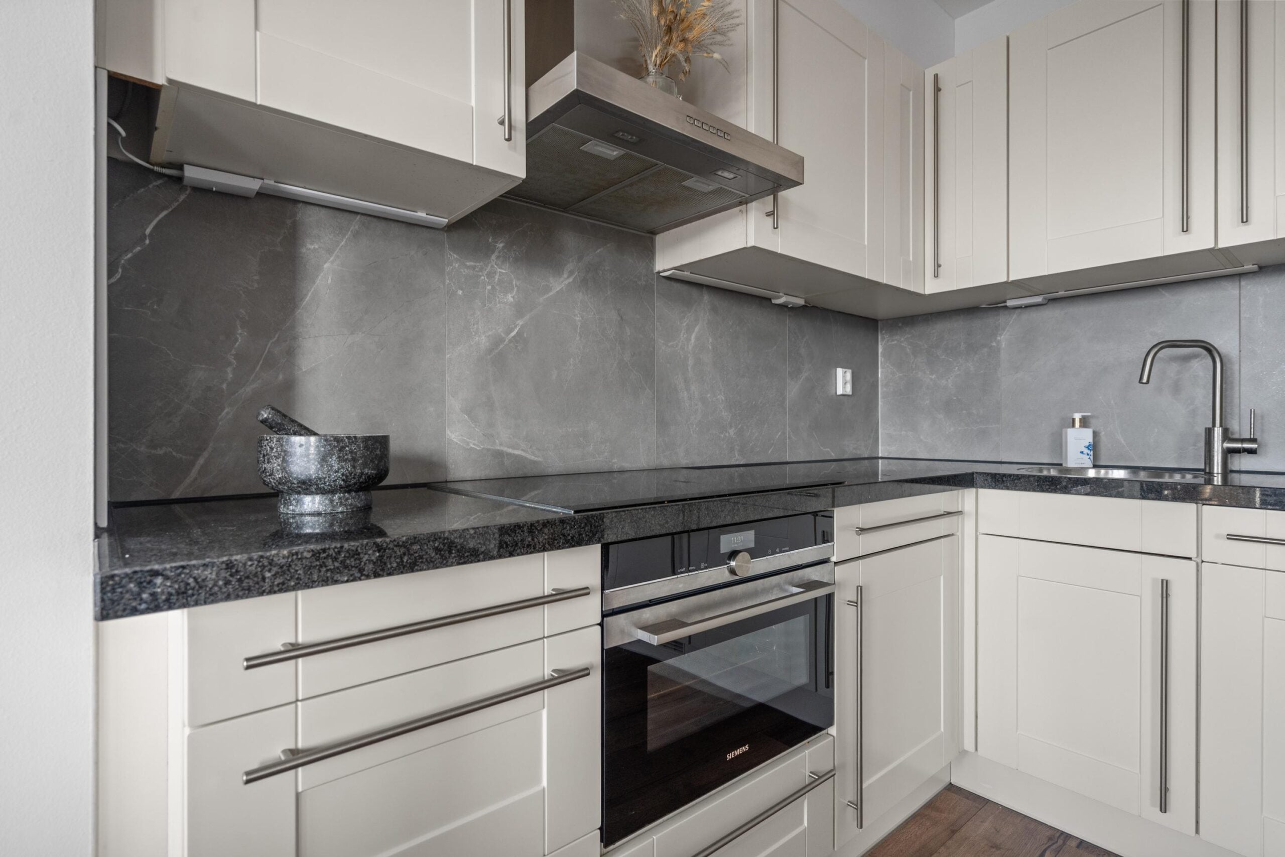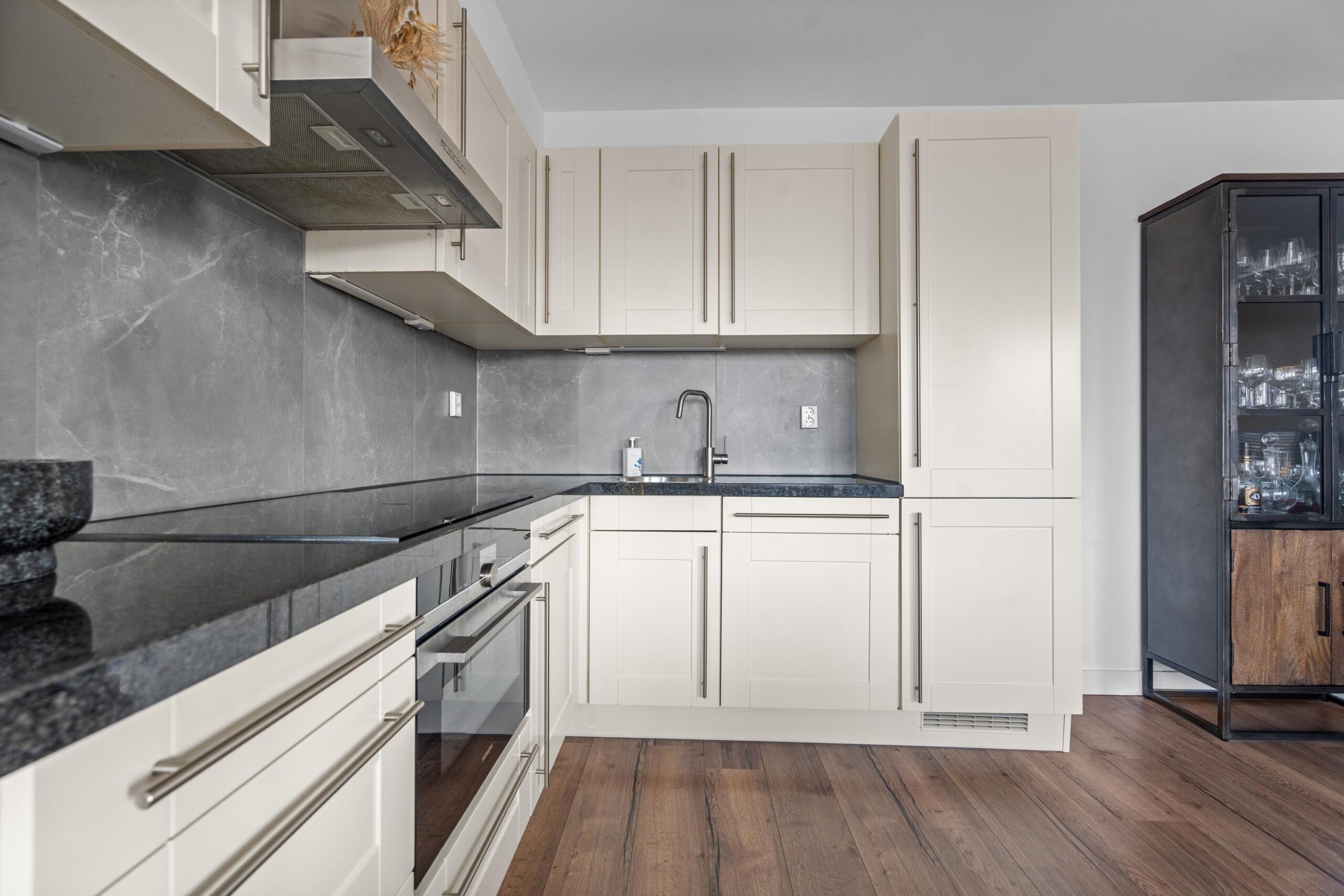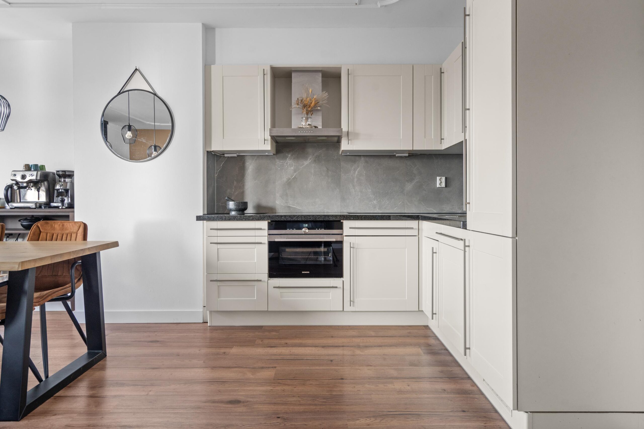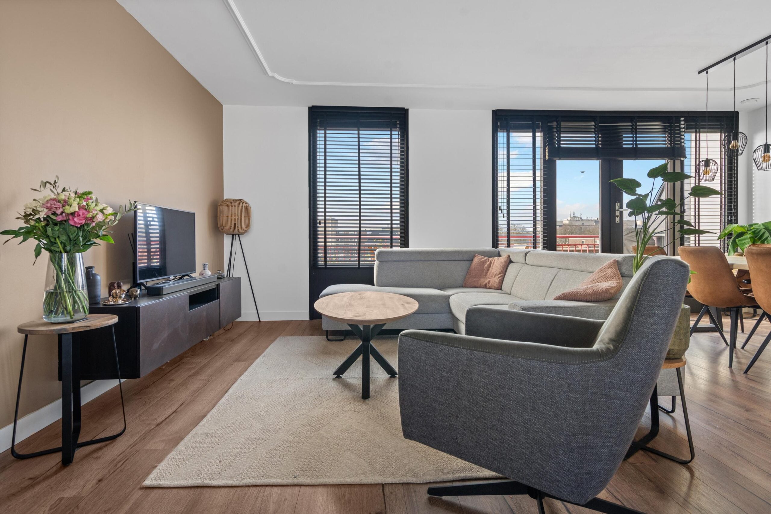 De ruime woonkamer met open keuken heeft een fantastisch lichtinval. Door de grote raampartijen en de openslaande deuren naar het ruime zonneterras creëer je hier het echte binnen buiten gevoel. De open keuken heeft een neutrale basis en past in ieders interieur. Alle inbouwapparatuur is aanwezig, hier kun je met een gerust hart de sterren van de hemel koken. Wat dit appartement uniek maakt, is het zeer riante zonneterras. Het terras, toegankelijk via de openslaande deuren, geeft uitzicht over Beverwijk. De ligging van het terras (zuidwesten) kan niet beter, hier kun je van de middag tot ’s avonds genieten van de ondergaande zon.