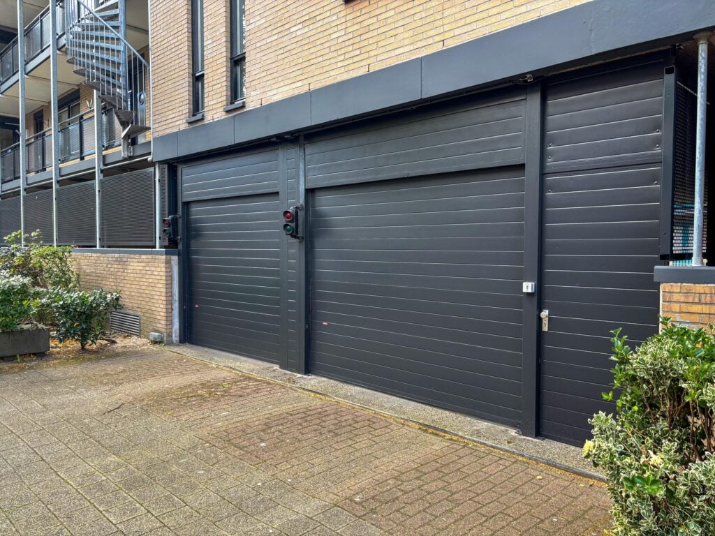 De parkeergarage is toegankelijk via een elektrische overheaddeur.