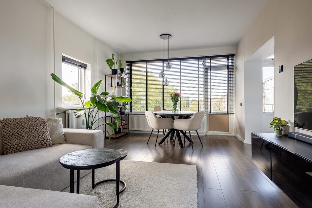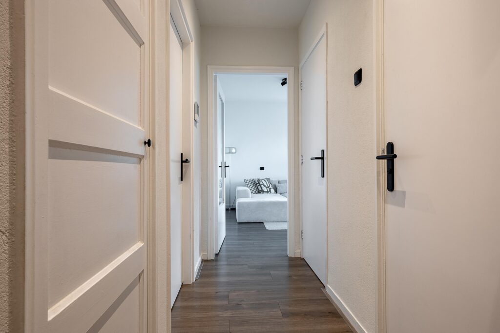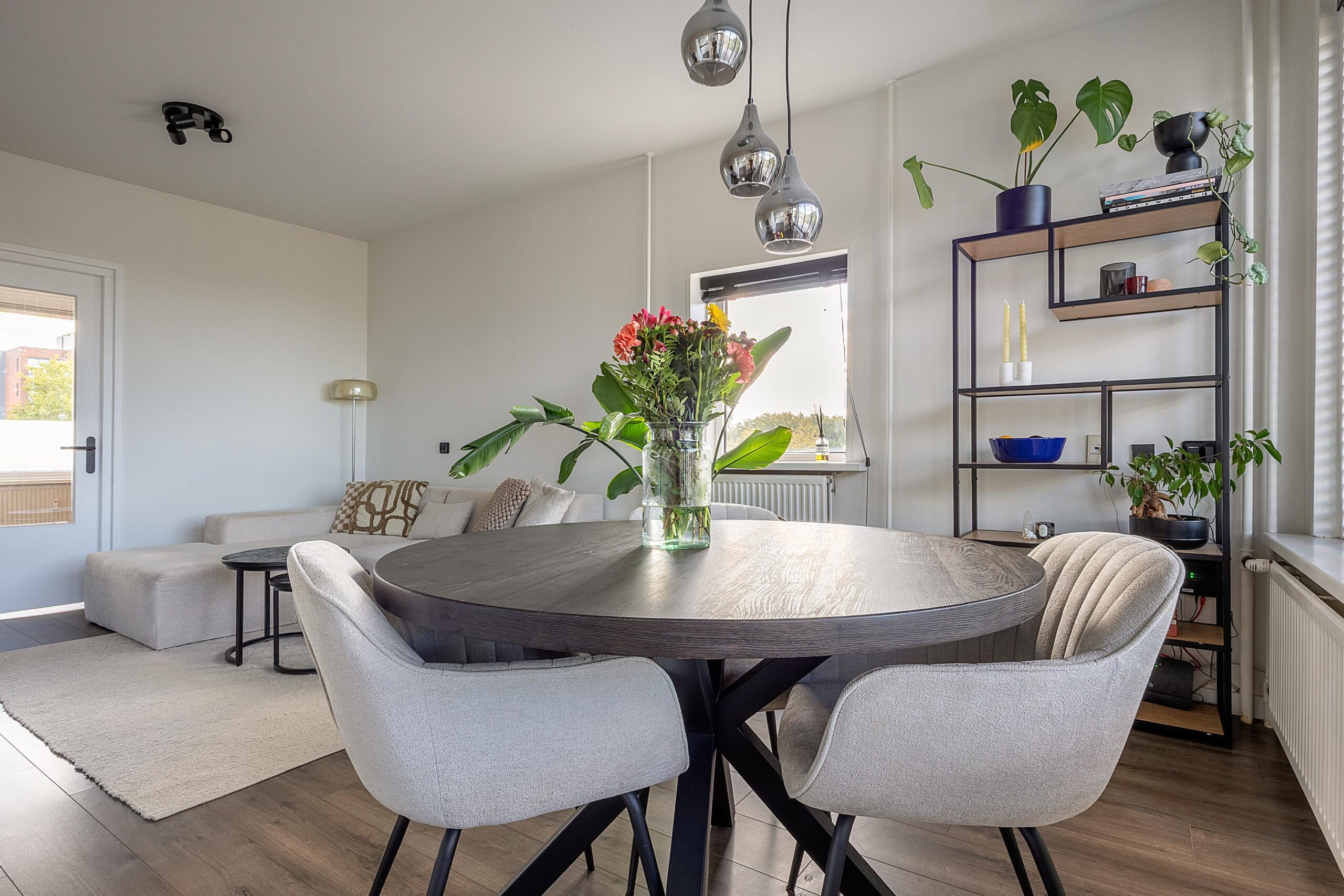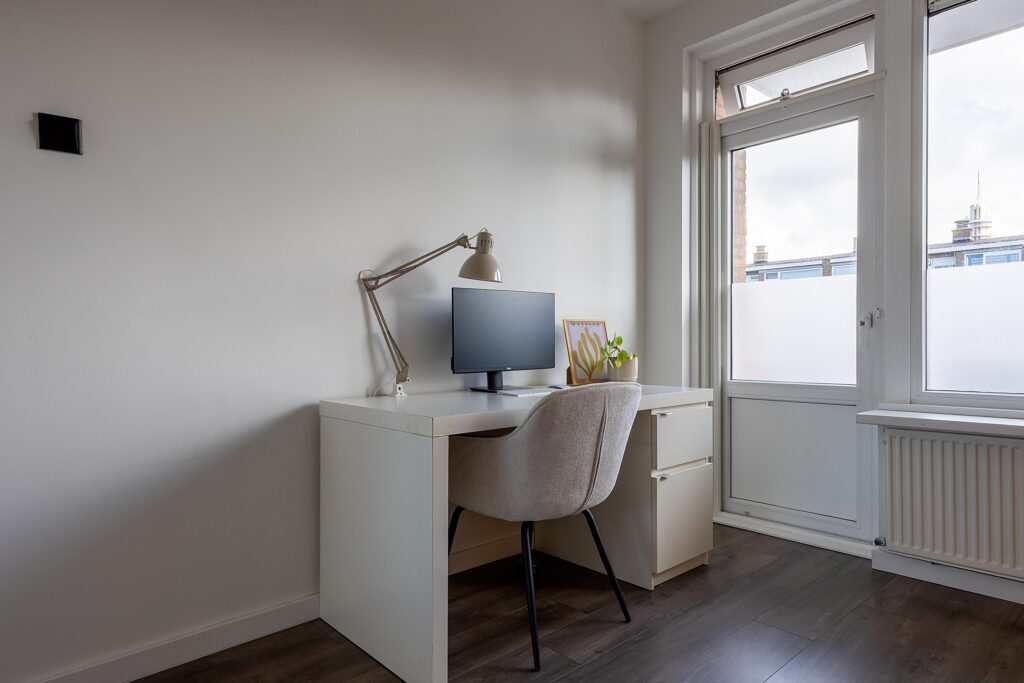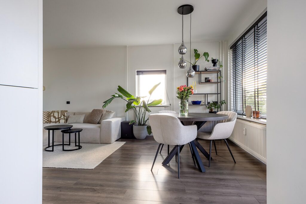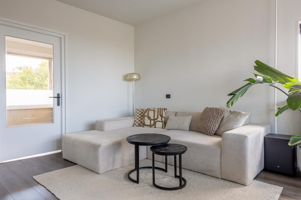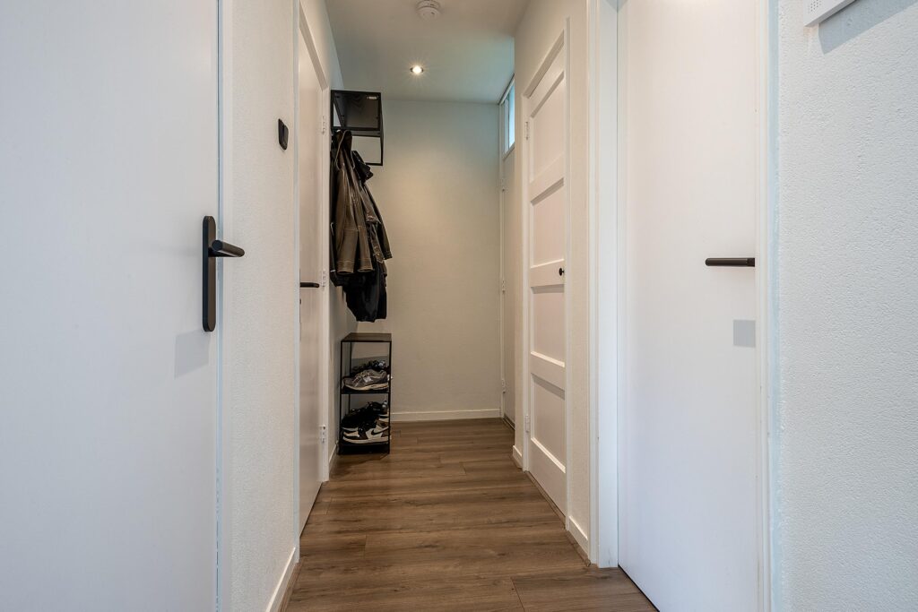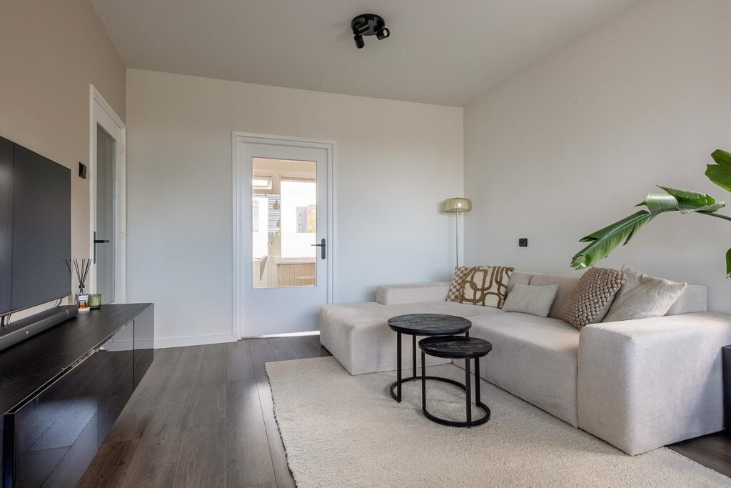 Op de derde verdieping stap je binnen in een lichte hal die je direct overzicht geeft. De woonkamer voelt ruim en uitnodigend, met brede raampartijen en vrij uitzicht. Alles is strak gestuukt en recent opnieuw geschilderd, wat de woning een frisse en moderne uitstraling geeft. De nieuwe vloer maakt het geheel helemaal af, waardoor je er echt zo in kunt.