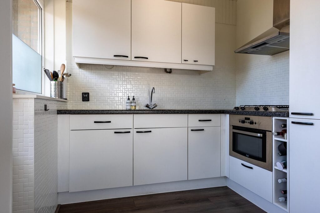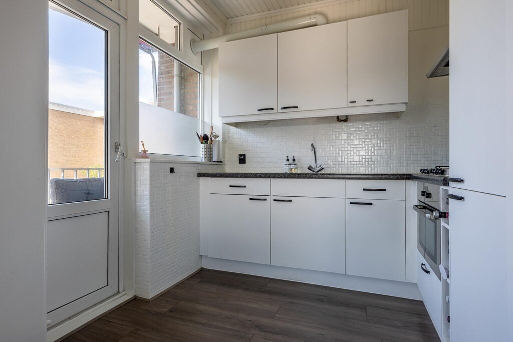 Grenzend aan de woonkamer vind je de keuken. Deze is keurig afgewerkt en praktisch ingedeeld met voldoende werk- en kastruimte. Ideaal om dagelijks comfortabel te koken en toch gezellig in verbinding te blijven met de woonkamer en het balkon, waar je ’s middags en aan het einde van de dag geniet van de zon.