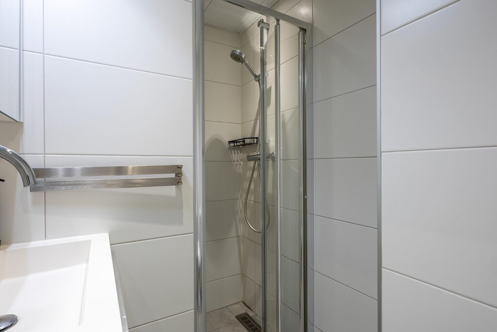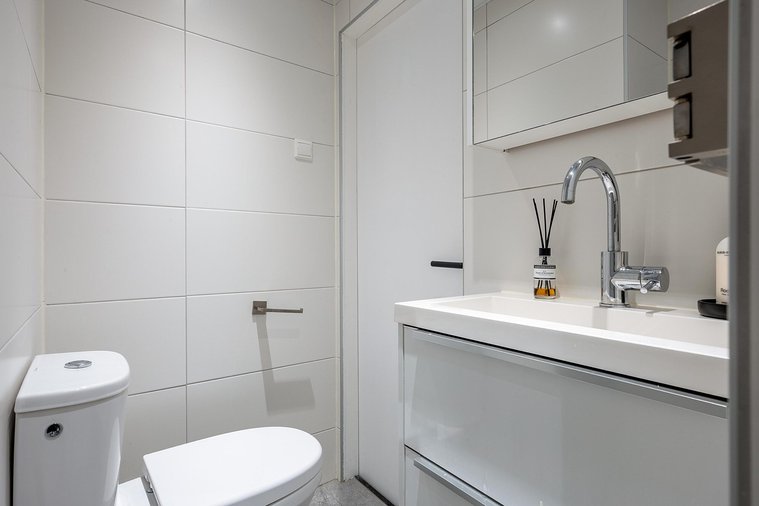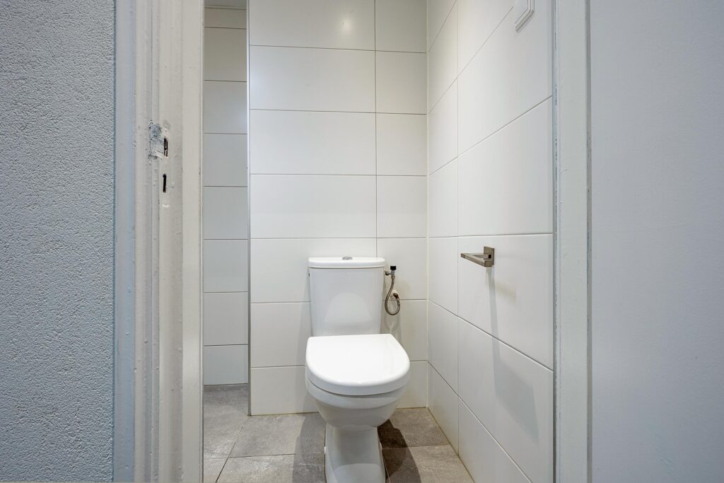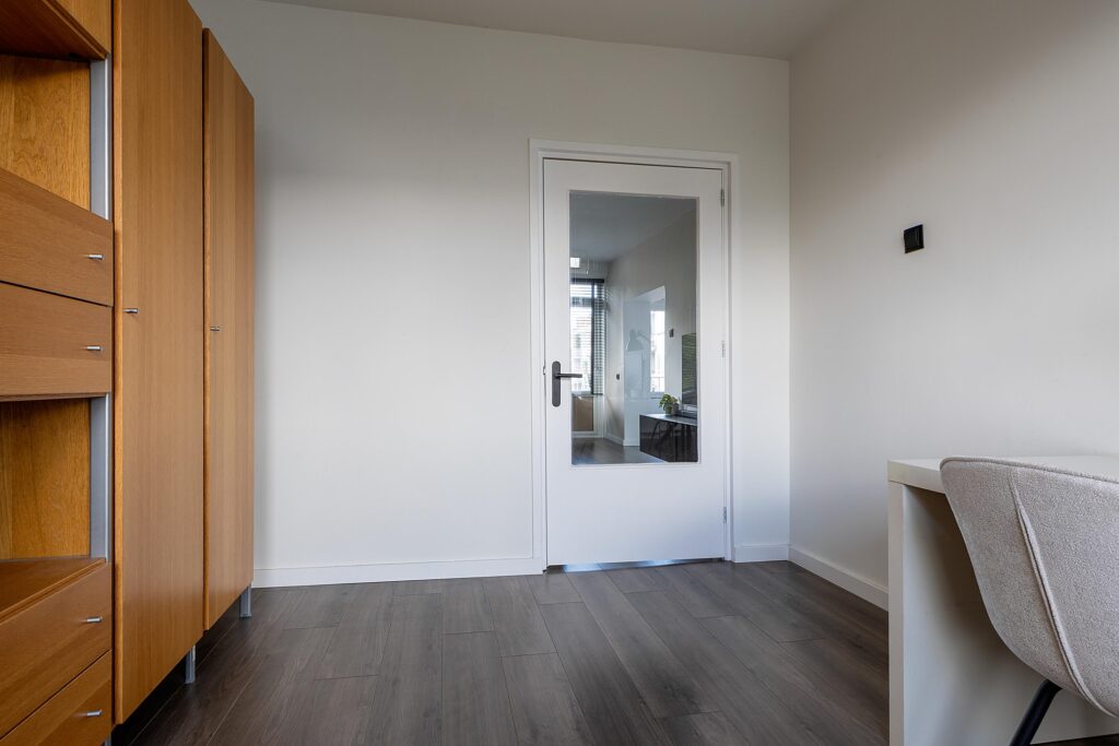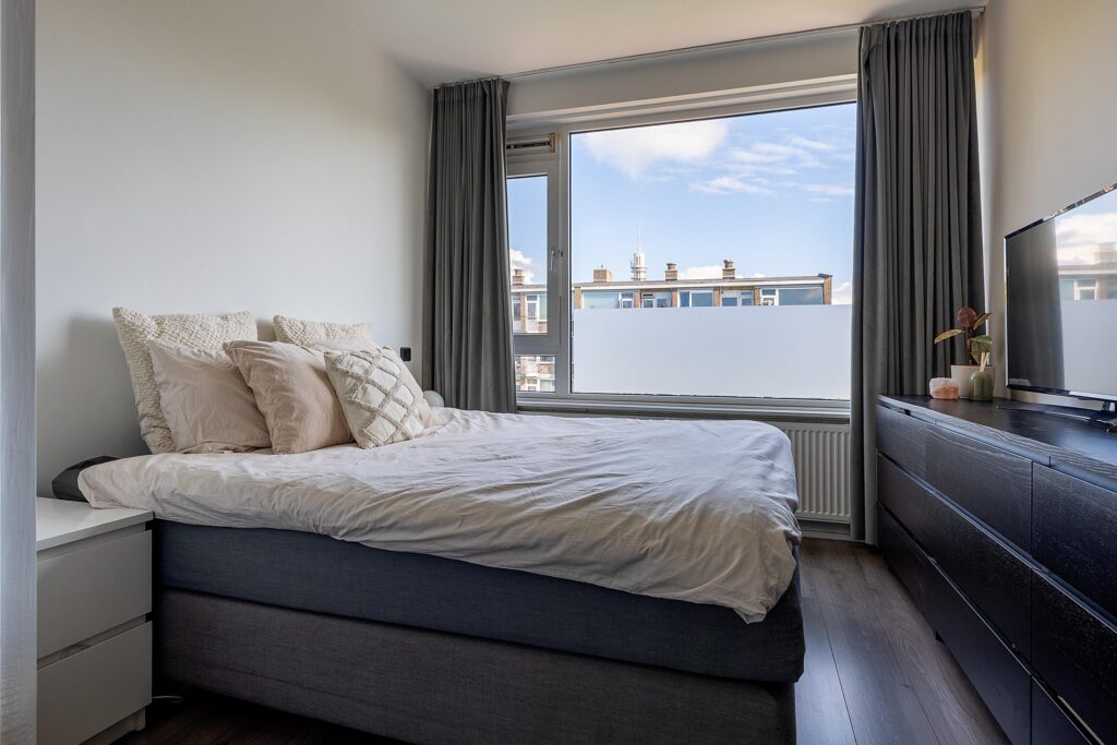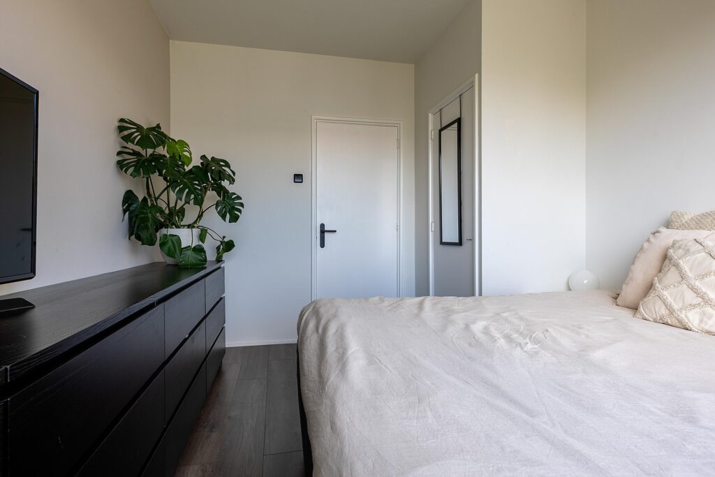 Het appartement beschikt over twee slaapkamers. De hoofdslaapkamer is royaal en biedt volop ruimte voor een groot bed en een kledingkast. De tweede kamer is ideaal als logeer-, werk- of kinderkamer. Vanuit deze kant van het appartement heb je toegang tot het tweede balkon, waar de ochtendzon je dag fris en licht laat beginnen. De badkamer is netjes en compleet met douche, toilet en wastafel – compact, fris en efficiënt ingericht.