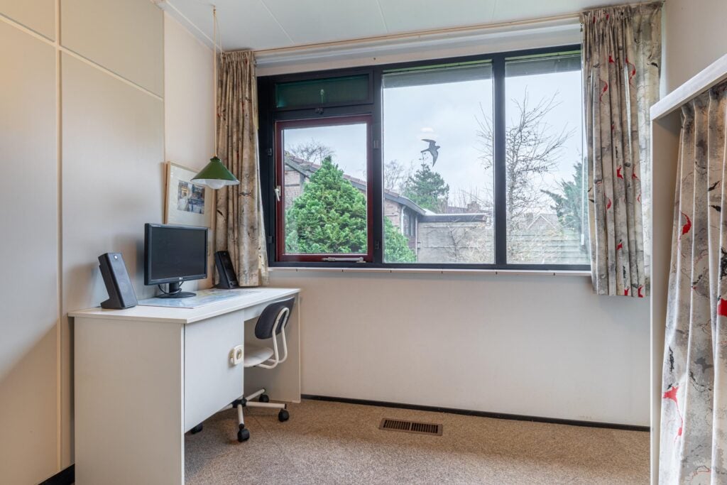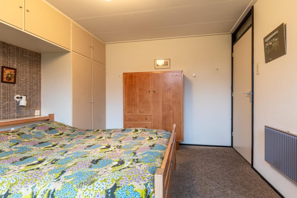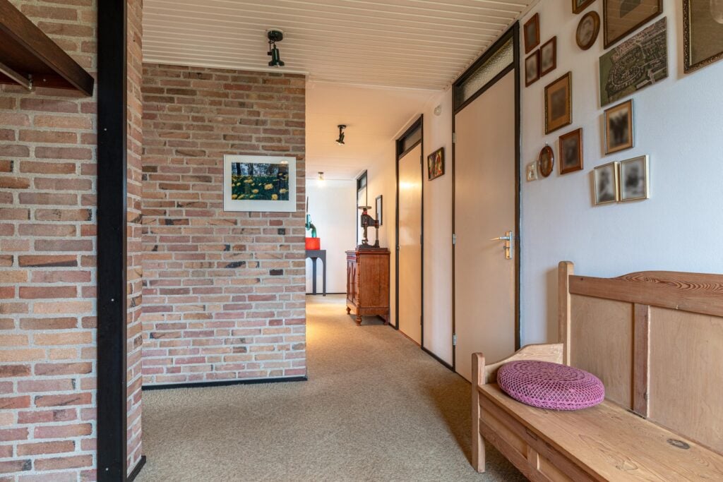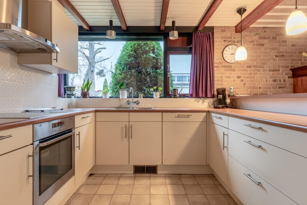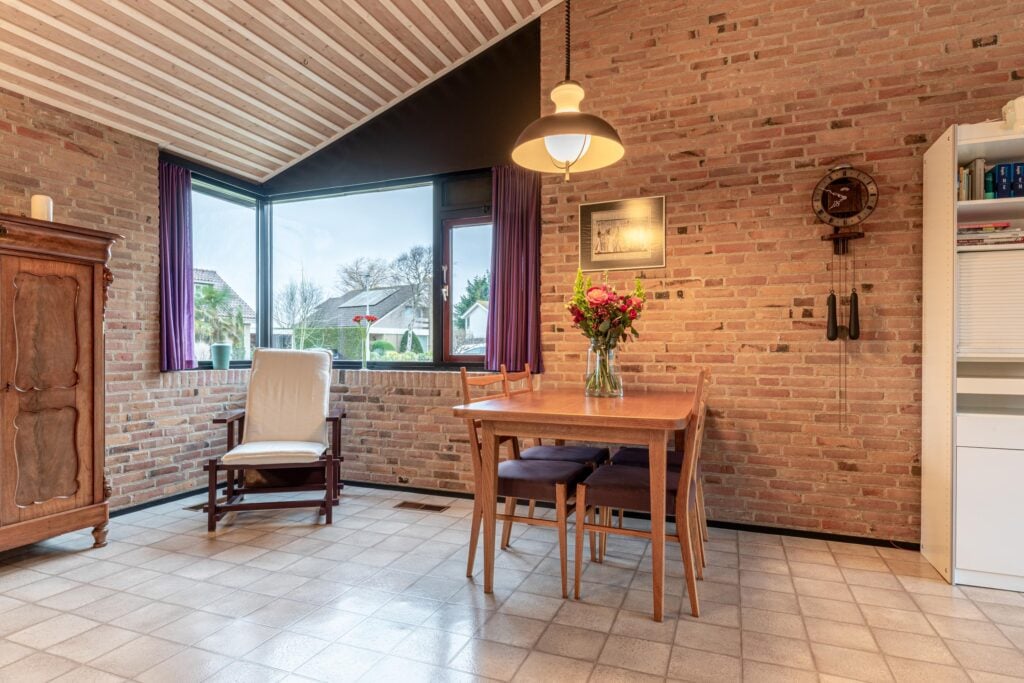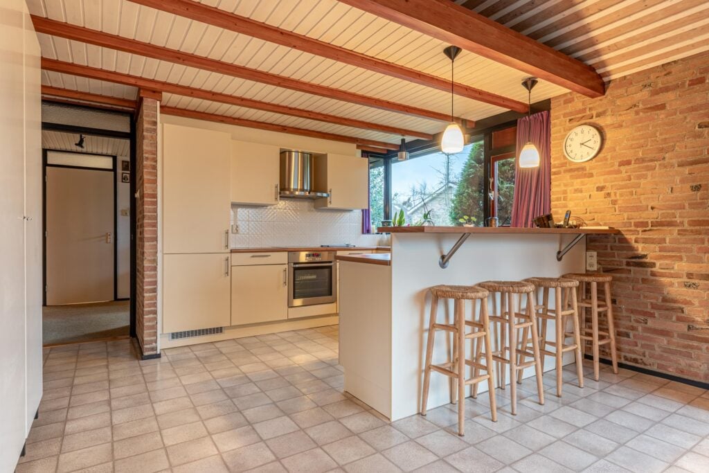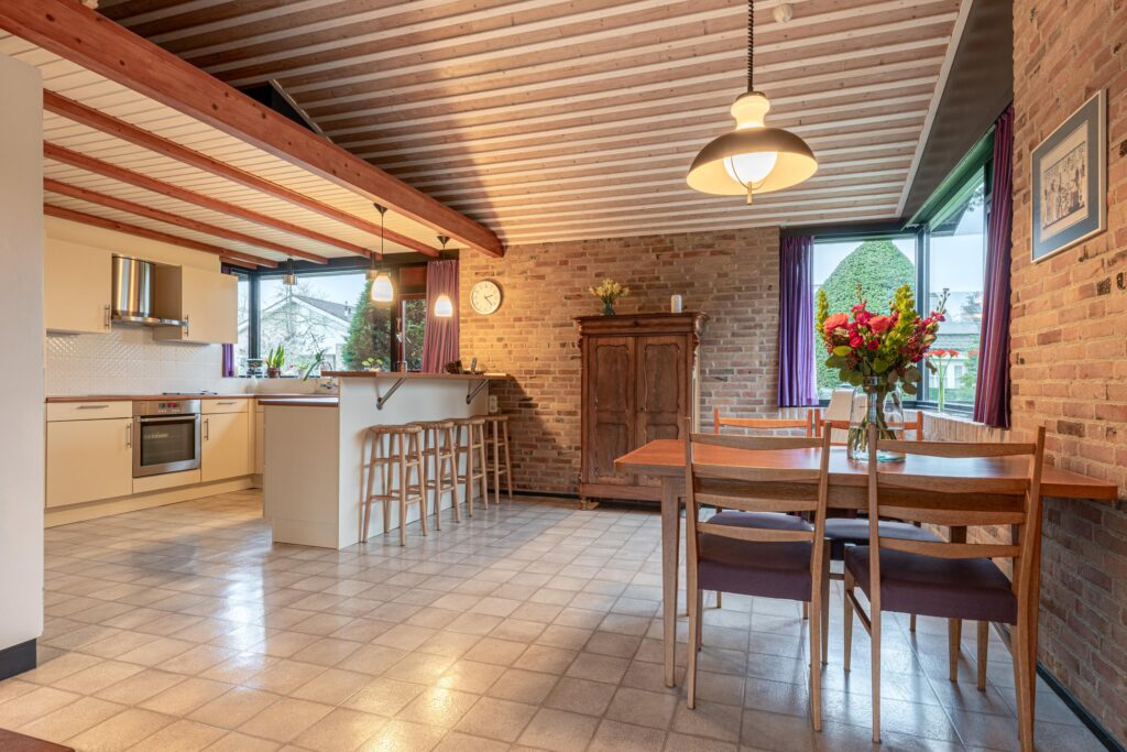 Via de entree kom je binnen in een ruime hal met garderobe, separaat toilet én toegang tot de eerste slaapkamer. Door de hal bereiken we de open keuken met zicht op het eetgedeelte en komen we in de ruime woonkamer. De woonkamer is breed van opzet, met heerlijk grote raampartijen én openslaande deuren, gericht op de royale achtertuin gelegen op het zuidoosten. De open haard vormt een sfeervol middelpunt en maakt de woonkamer tot een knusse ruimte, ideaal voor gezellige avonden thuis. De keuken is praktisch ingericht en biedt volop mogelijkheden om uit te breiden tot een echte woonkeuken of volledig te moderniseren naar eigen smaak. Door het kozijn in de hoek heb je hier een fantastisch zicht op het groen rondom de woning en fijn extra daglicht dat naar binnen valt.