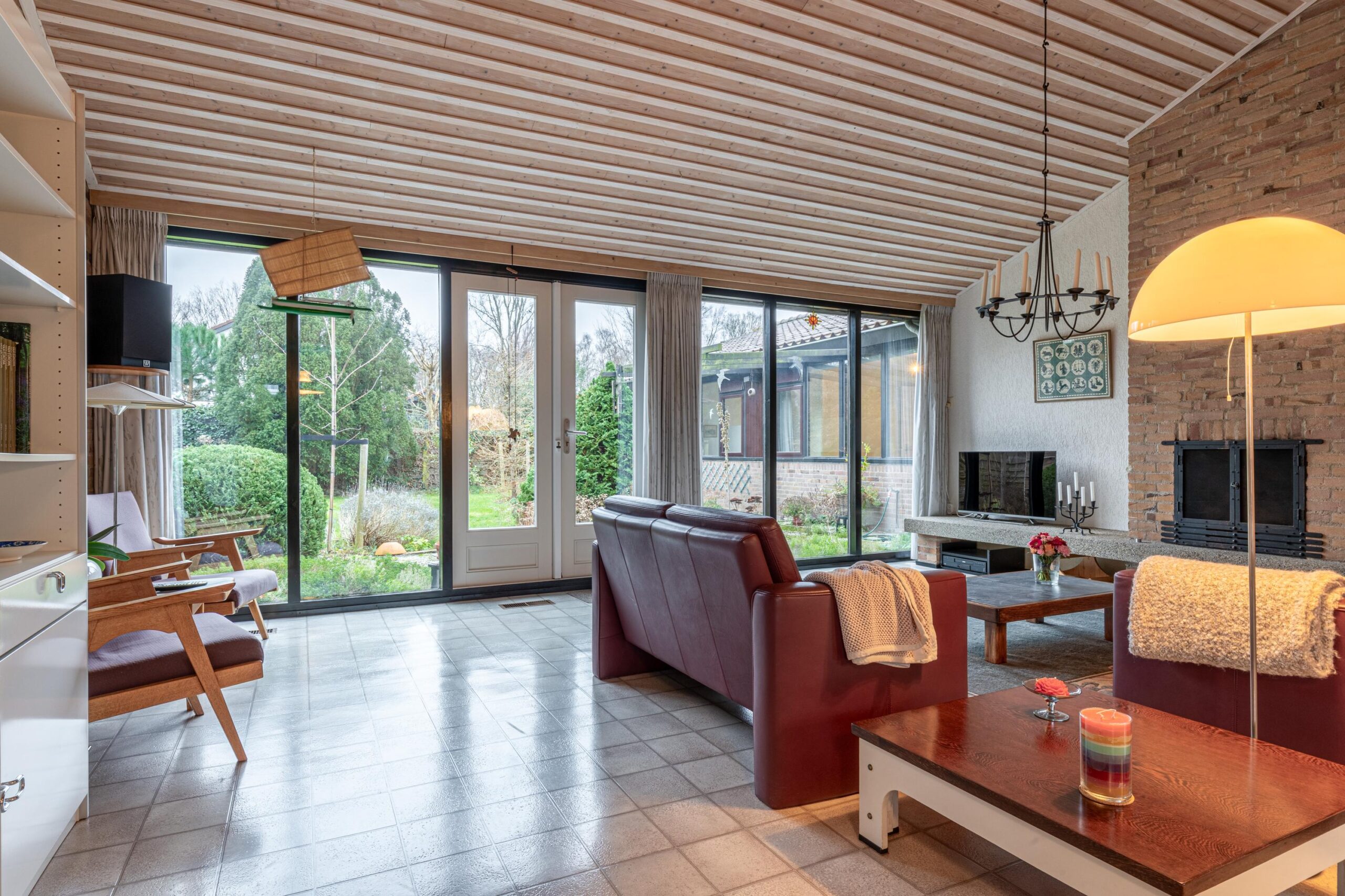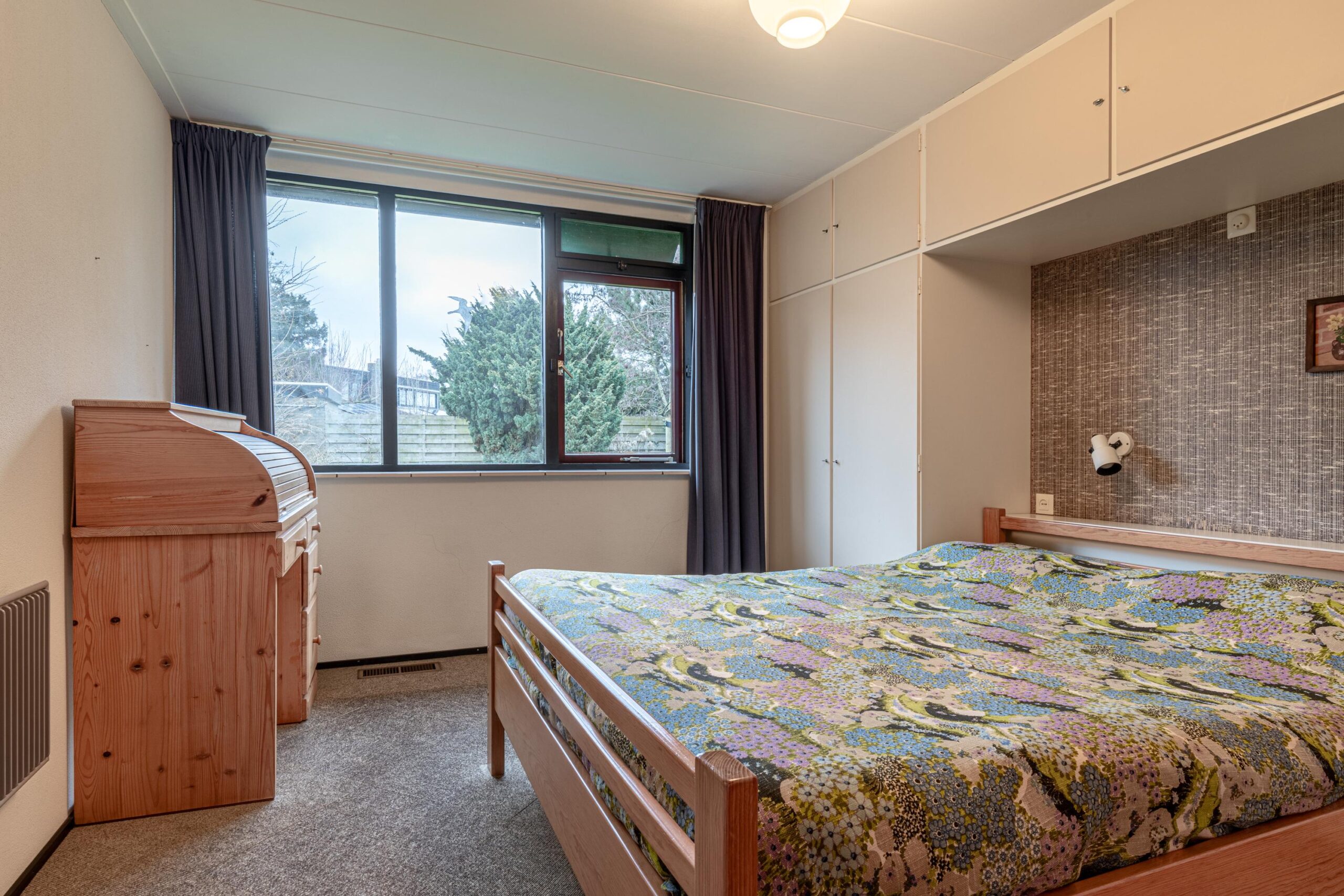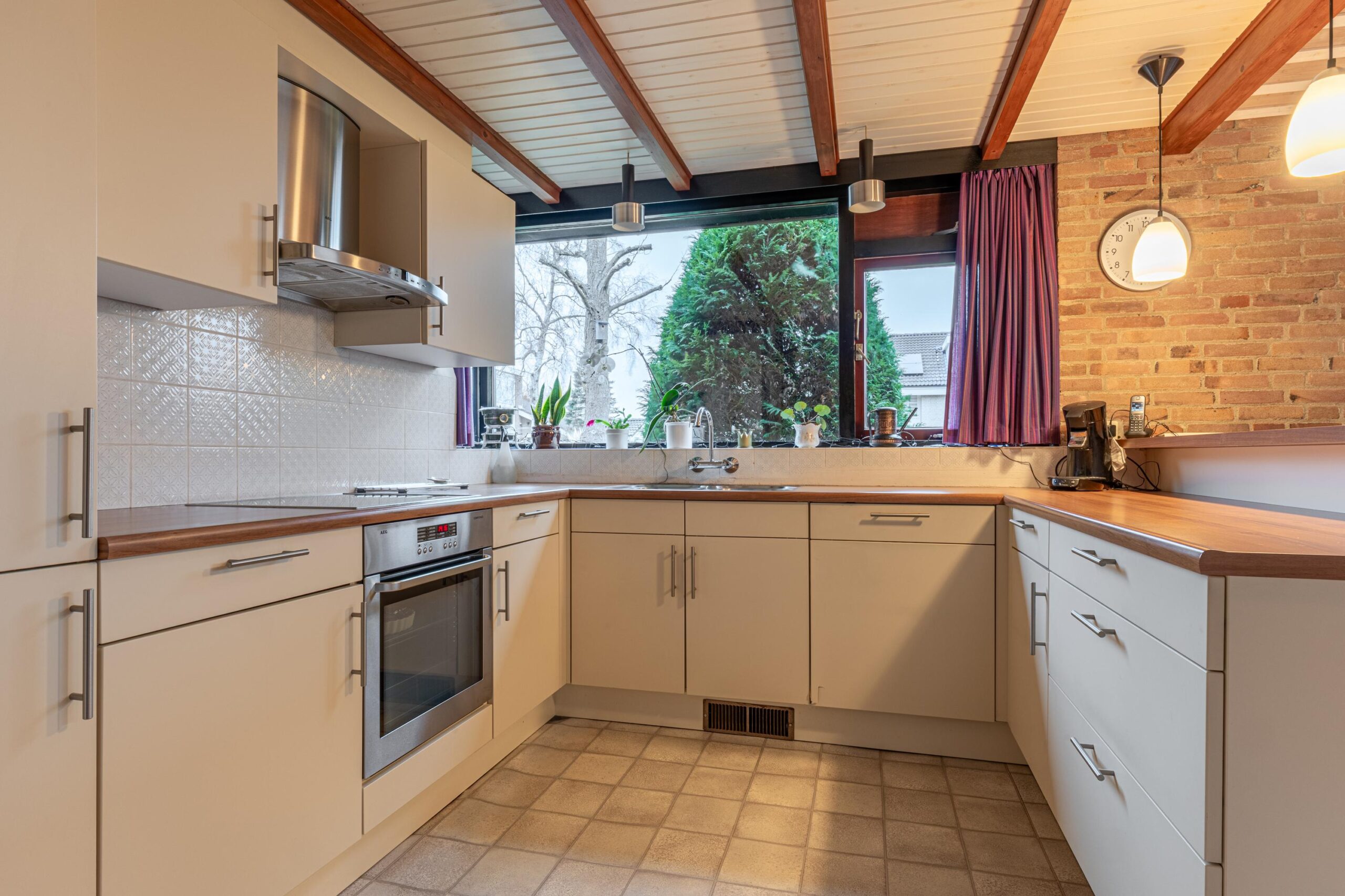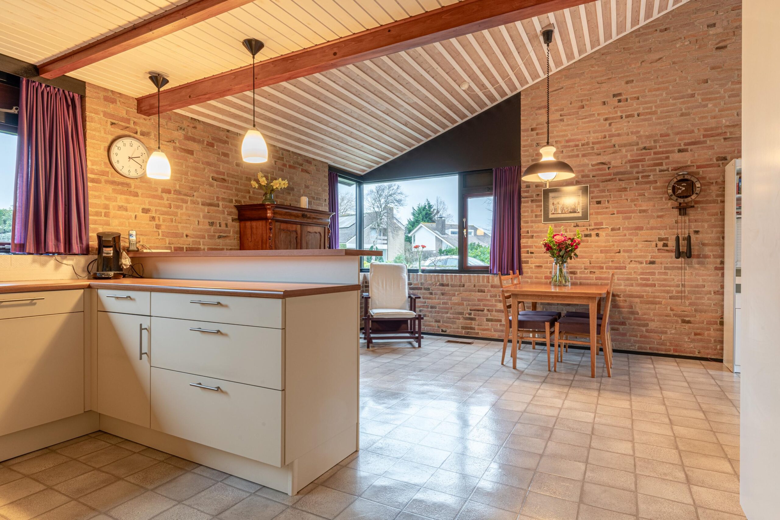 Via de entree kom je binnen in een ruime hal met garderobe, separaat toilet én toegang tot de eerste slaapkamer. Door de hal bereiken we de open keuken met zicht op het eetgedeelte en komen we in de ruime woonkamer. De woonkamer is breed van opzet, met heerlijk grote raampartijen én openslaande deuren, gericht op de royale achtertuin gelegen op het zuidoosten. De open haard vormt een sfeervol middelpunt en maakt de woonkamer tot een knusse ruimte, ideaal voor gezellige avonden thuis. De keuken is praktisch ingericht en biedt volop mogelijkheden om uit te breiden tot een echte woonkeuken of volledig te moderniseren naar eigen smaak. Door het kozijn in de hoek heb je hier een fantastisch zicht op het groen rondom de woning en fijn extra daglicht dat naar binnen valt.