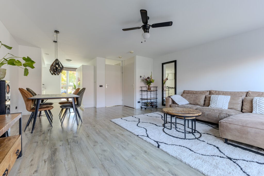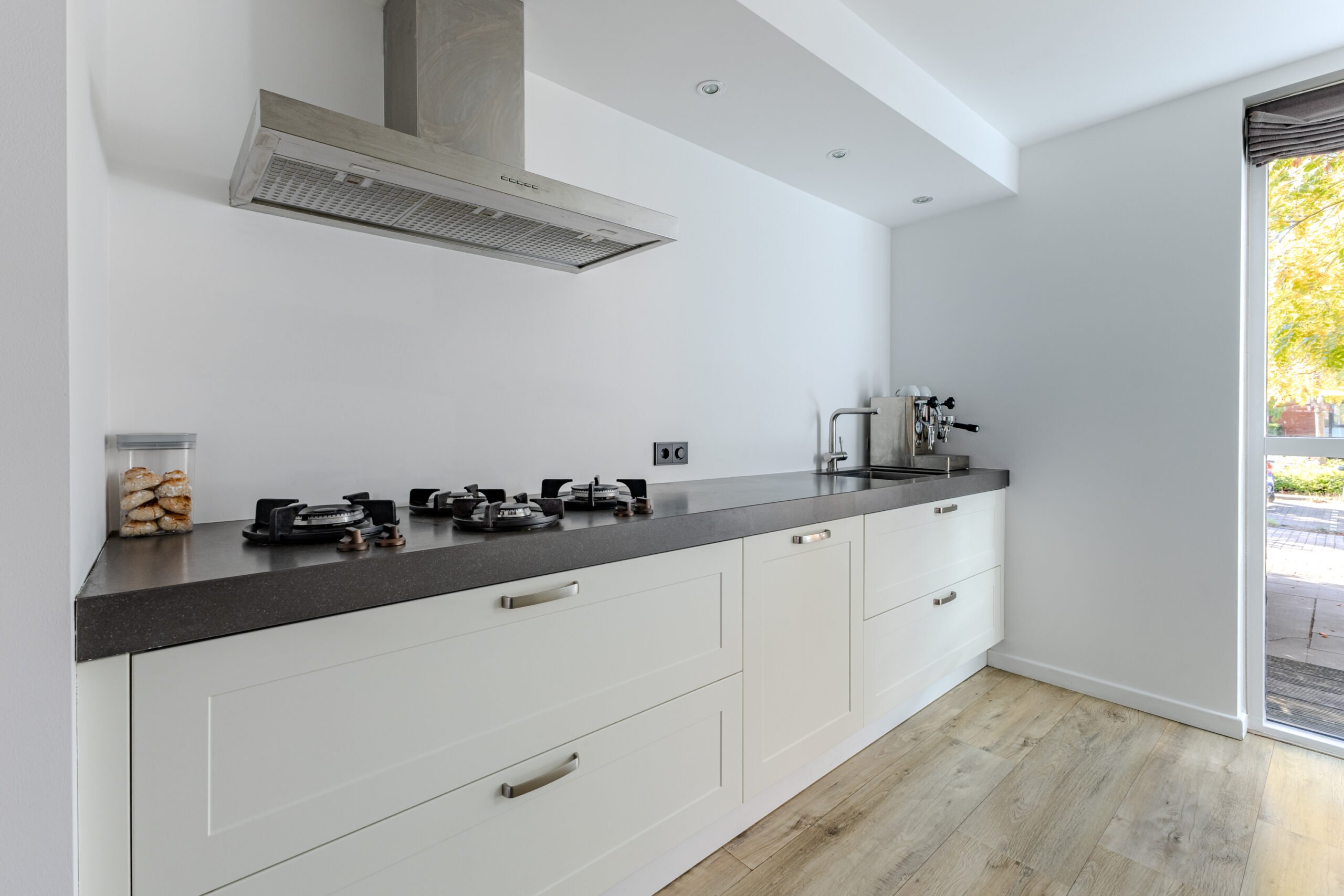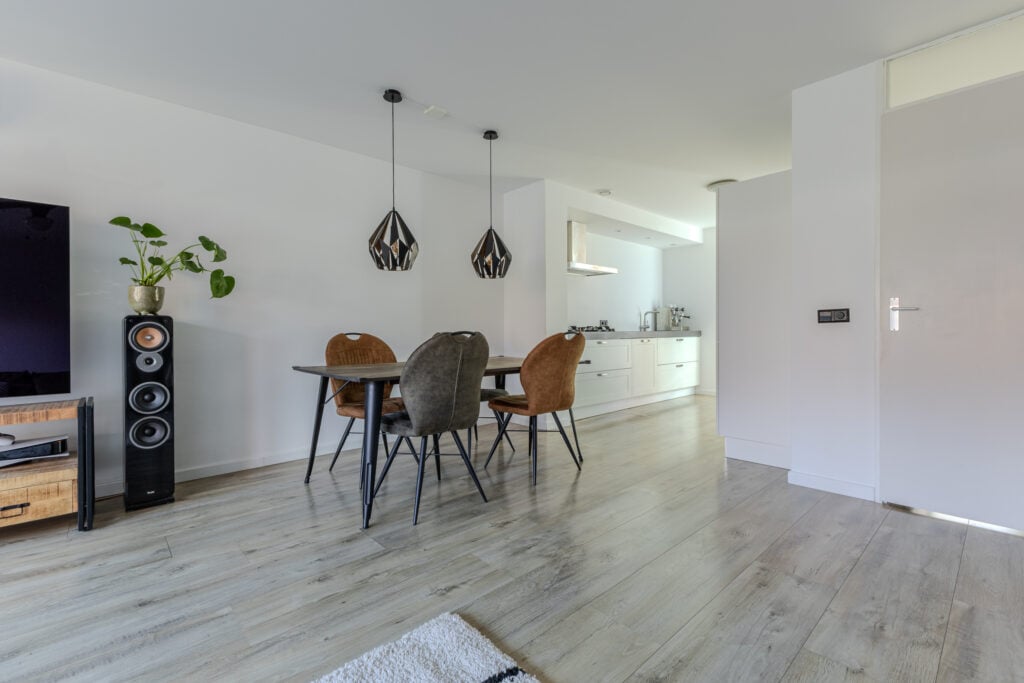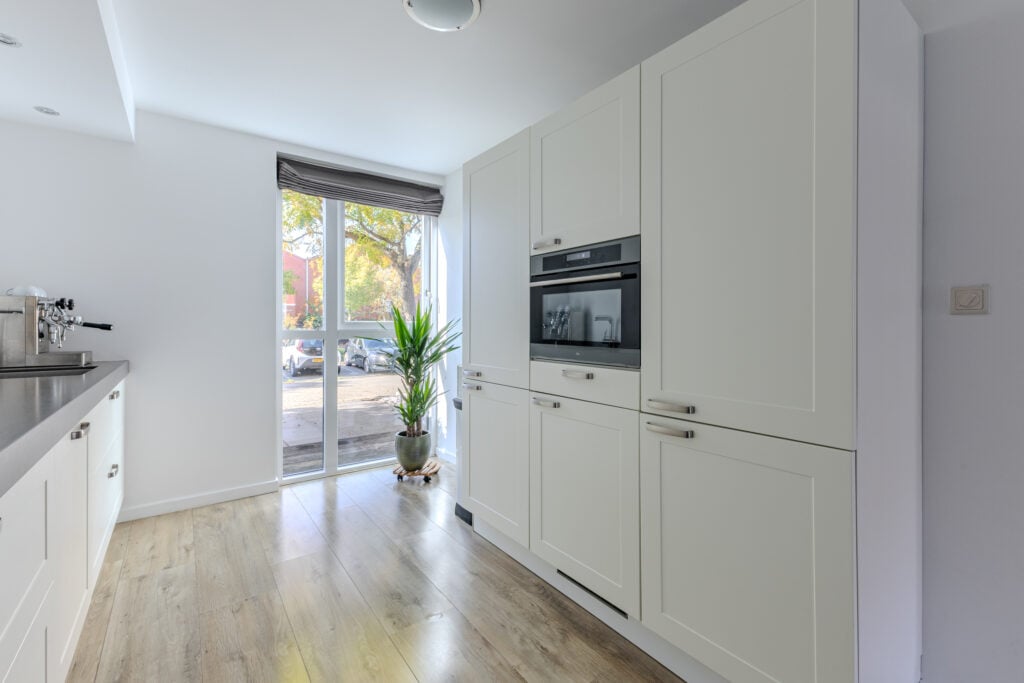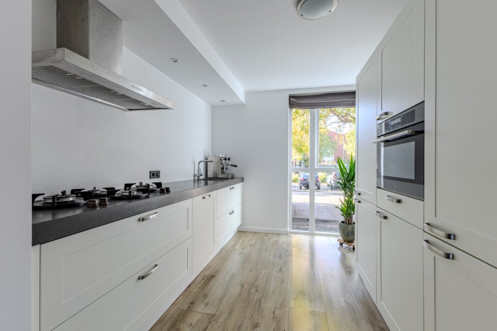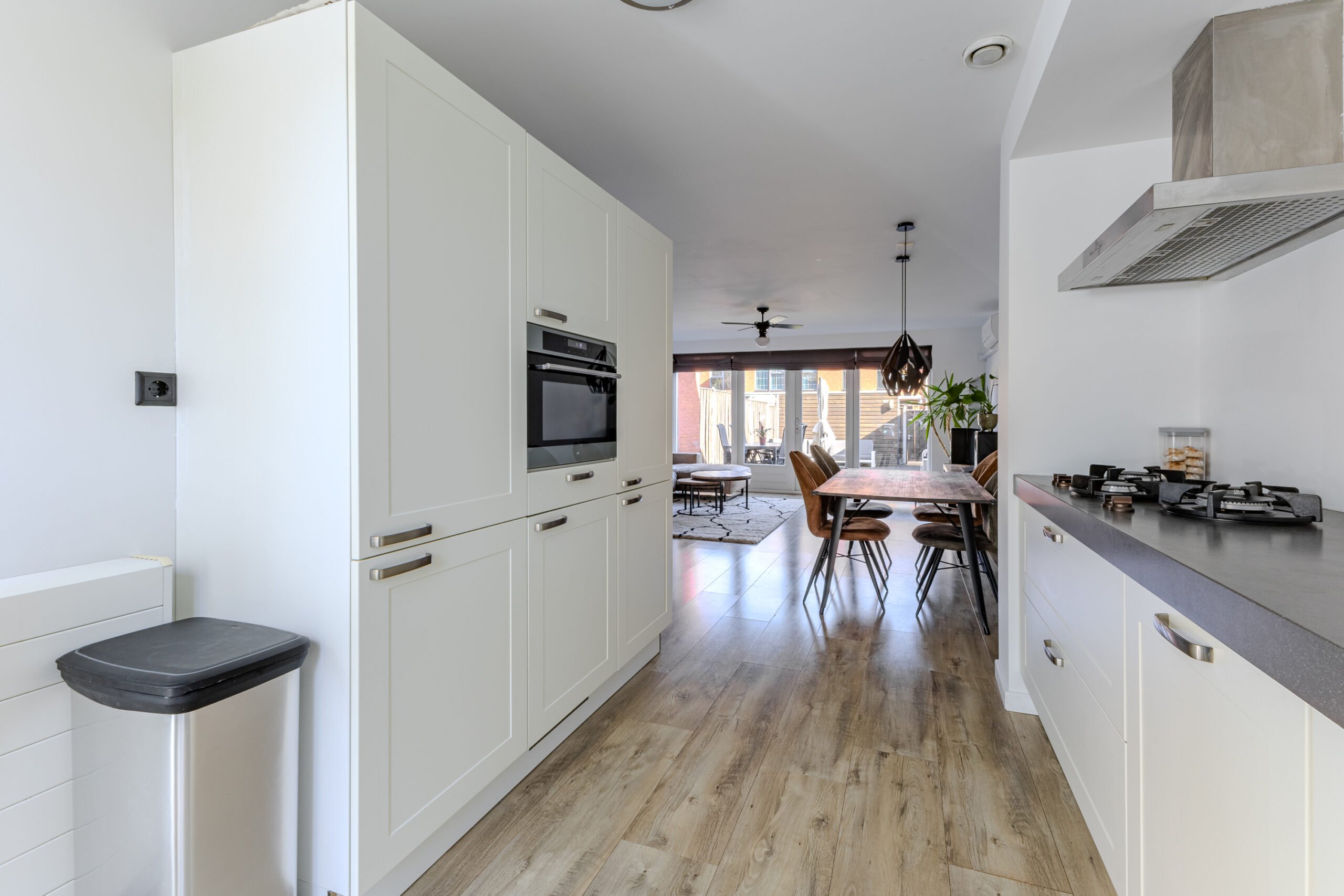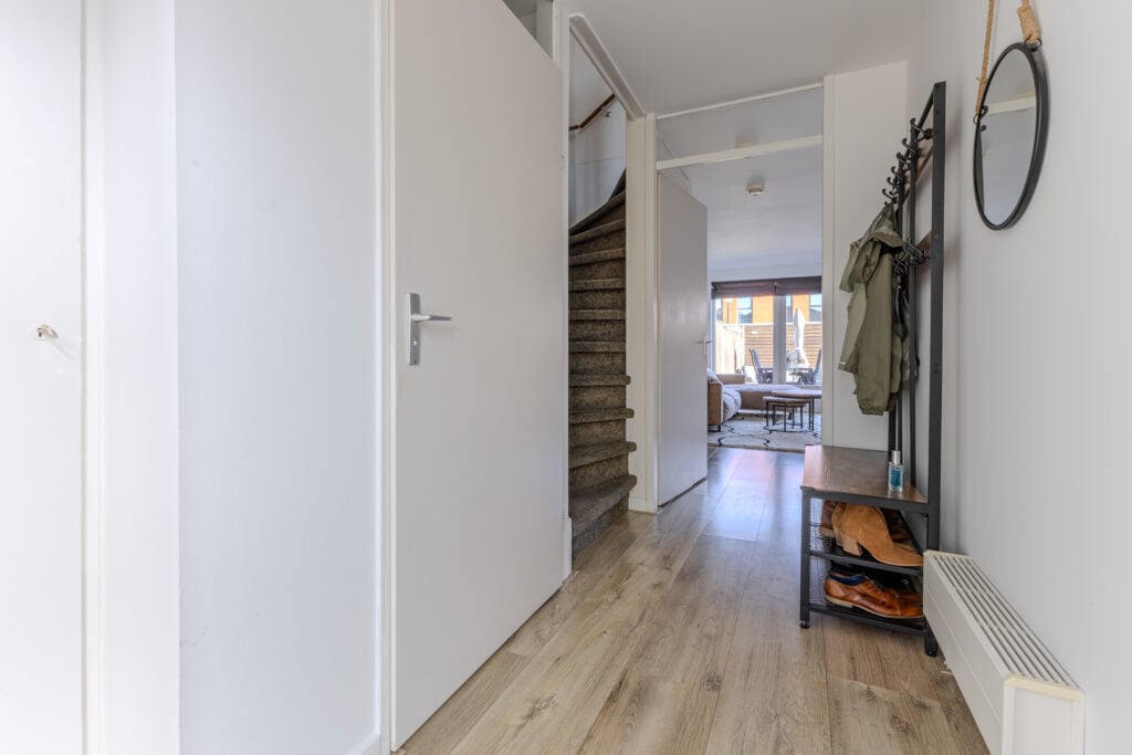 Via de voortuin bereikt u de entree met hal, meterkast en modern toilet. De lichte woonkamer strekt zich uit over de volle breedte van het huis en heeft grote raampartijen, die zorgen voor een open en zonnige sfeer. De vloer met houtlook geeft warmte en een eigentijdse uitstraling. Aan de voorzijde bevindt zich een Häcker keuken (2017) met o.a. PITT Cooking geïntegreerde kookpitten, een donker granieten werkblad en een vernieuwde vaatwasser (2025). Vanuit de keuken kijkt u gezellig uit op de straatzijde. Via de woonkamer zijn de openslaande deuren naar de achtertuin bereikbaar.