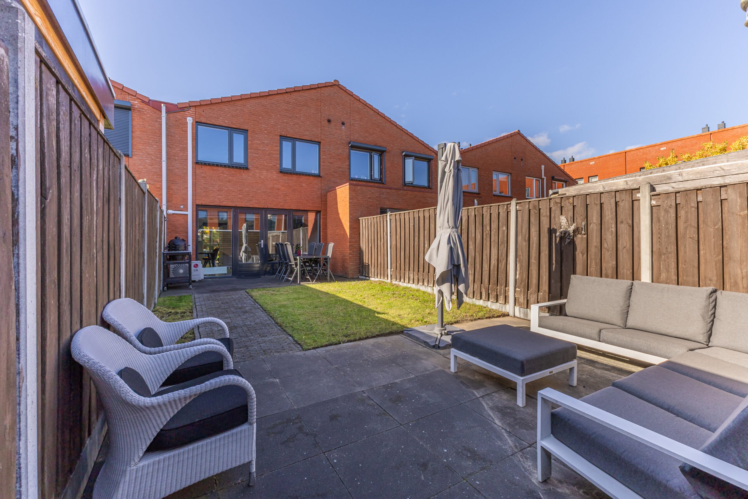 De zonnige achtertuin (ca. 64 m²) is onderhoudsvriendelijk aangelegd met terras, gazon en een houten berging. Hier geniet u volop van de middag- en avondzon. Aan de voorzijde is eveneens een praktische tuin, ideaal voor een zitje of fietsen.