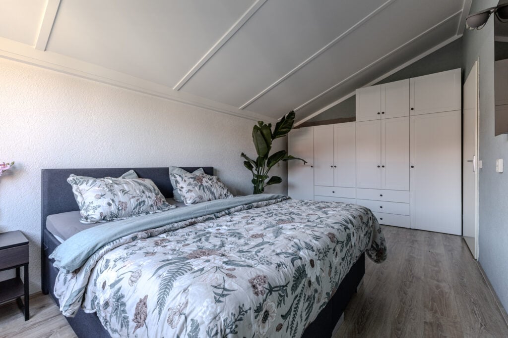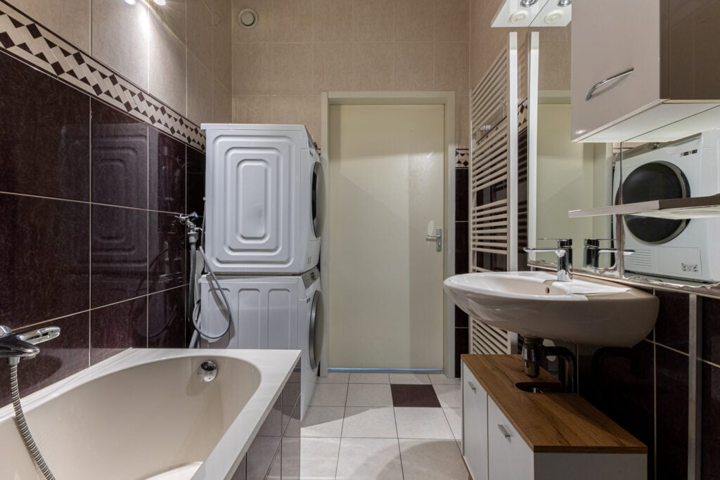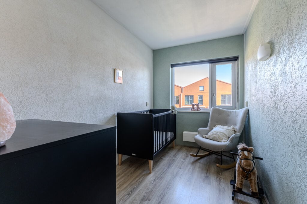 Hier vindt u drie slaapkamers, stuk voor stuk met veel lichtinval en strakke afwerking. De badkamer is volledig betegeld en uitgerust met een ligbad, wastafelmeubel en de aansluiting voor de wasmachine en droger.