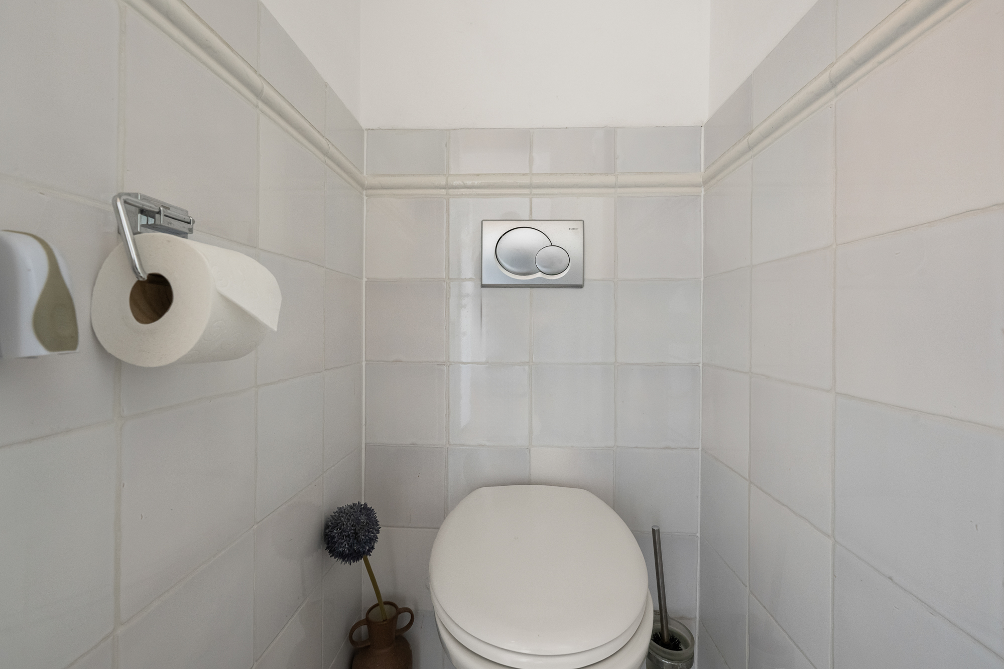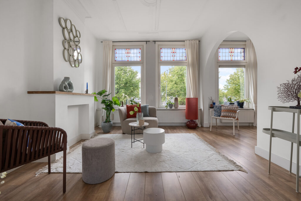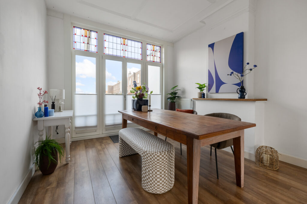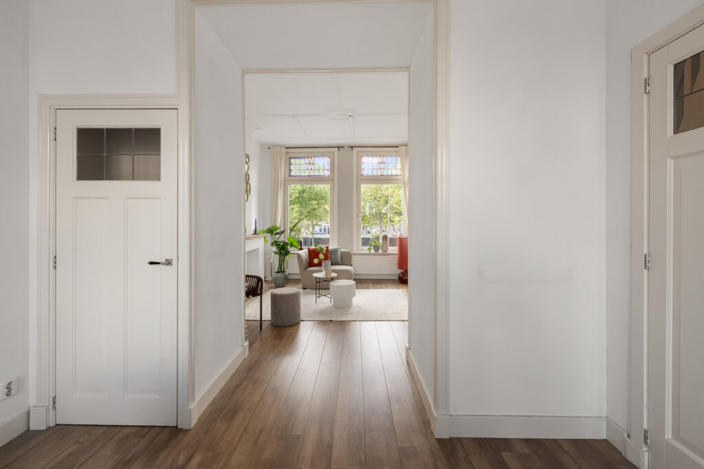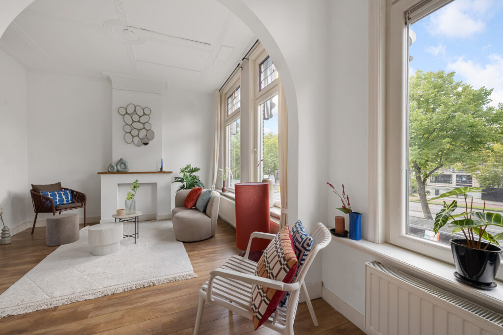 On the first floor, the landing leads to the bright living and dining room en suite, with high ceilings, two original mantelpieces and large windows offering beautiful views over the Spaarne. The kitchen is neat and fitted with built-in appliances; if you prefer open-plan living, an open kitchen can easily be created here. From both the kitchen and the living room you step onto the wide balcony, perfect for your first coffee in the morning sun. There is also a separate toilet on this level.