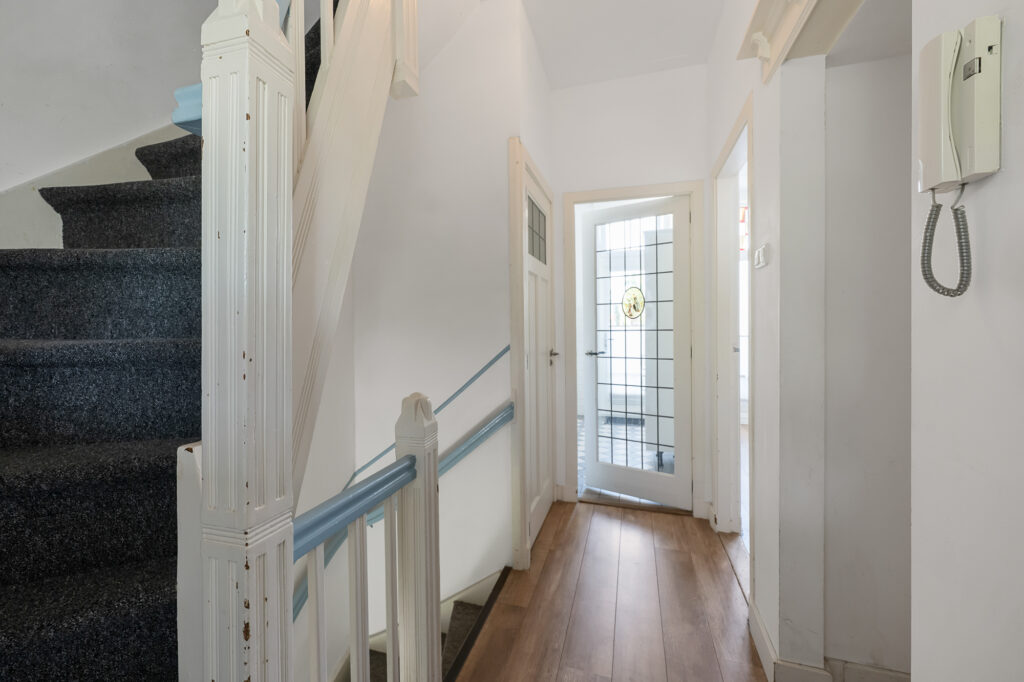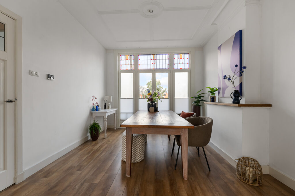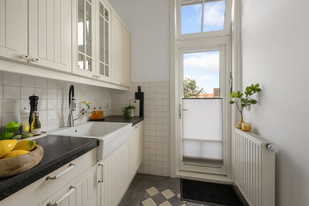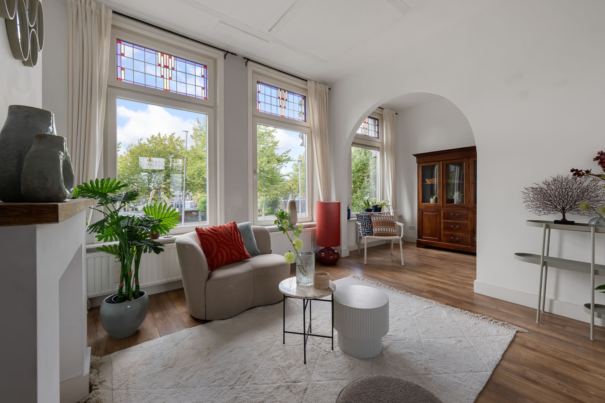 On the first floor, the landing leads to the bright living and dining room en suite, with high ceilings, two original mantelpieces and large windows offering beautiful views over the Spaarne. The kitchen is neat and fitted with built-in appliances; if you prefer open-plan living, an open kitchen can easily be created here. From both the kitchen and the living room you step onto the wide balcony, perfect for your first coffee in the morning sun. There is also a separate toilet on this level.