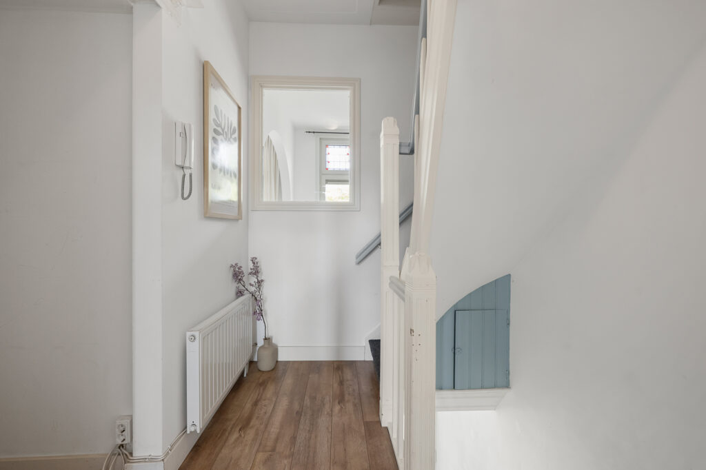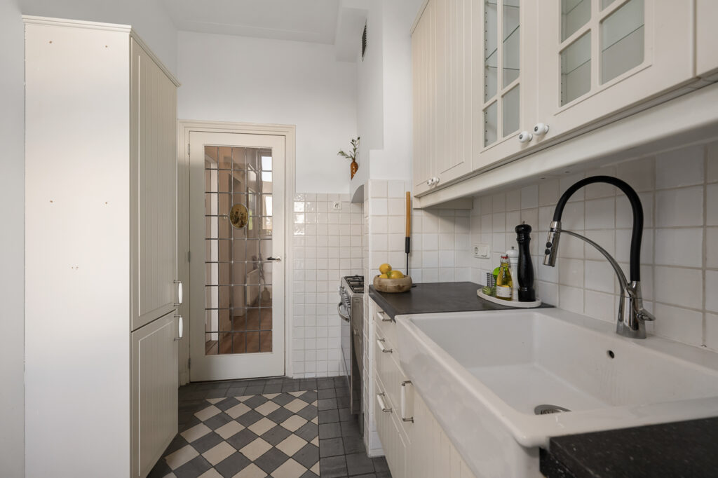 Op de eerste verdieping kom je via de overloop in de lichte kamer-en-suite met hoge plafonds, twee schouwen en grote ramen met prachtig zicht over het Spaarne. De keuken is netjes en voorzien van inbouwapparatuur; wie liever open kookt kan hier eenvoudig een open keuken creëren. Vanuit zowel de keuken als de woonkamer stap je het brede balkon op; ideaal voor je eerste koffie in de ochtendzon. Op deze etage is ook een apart toilet aanwezig.