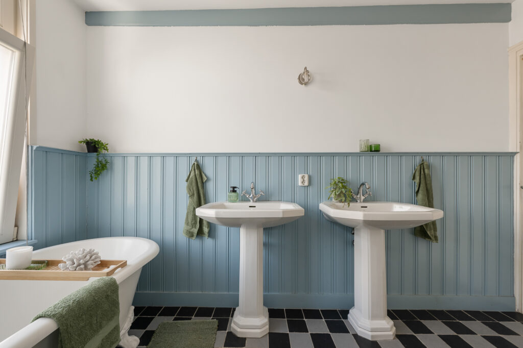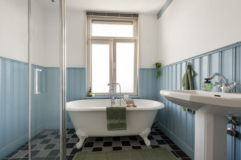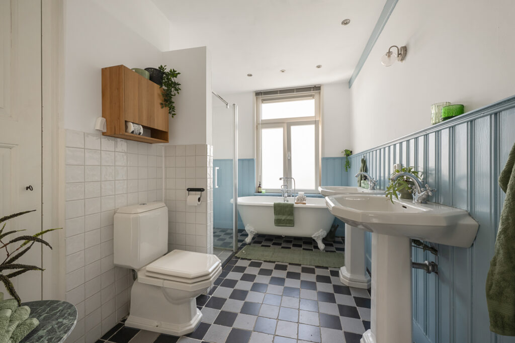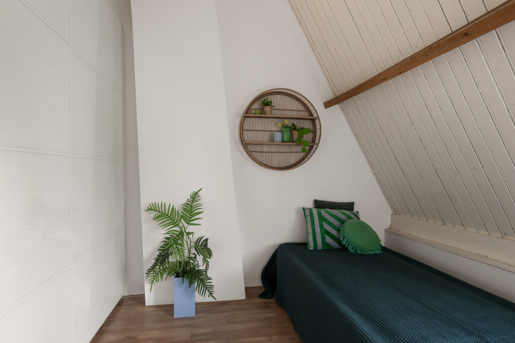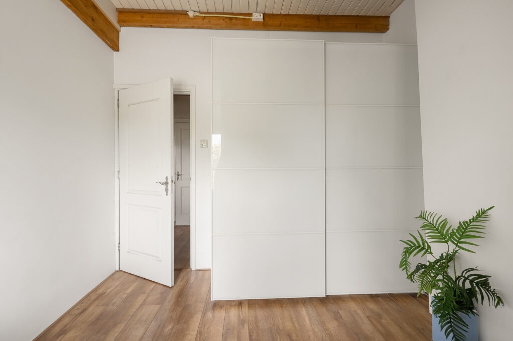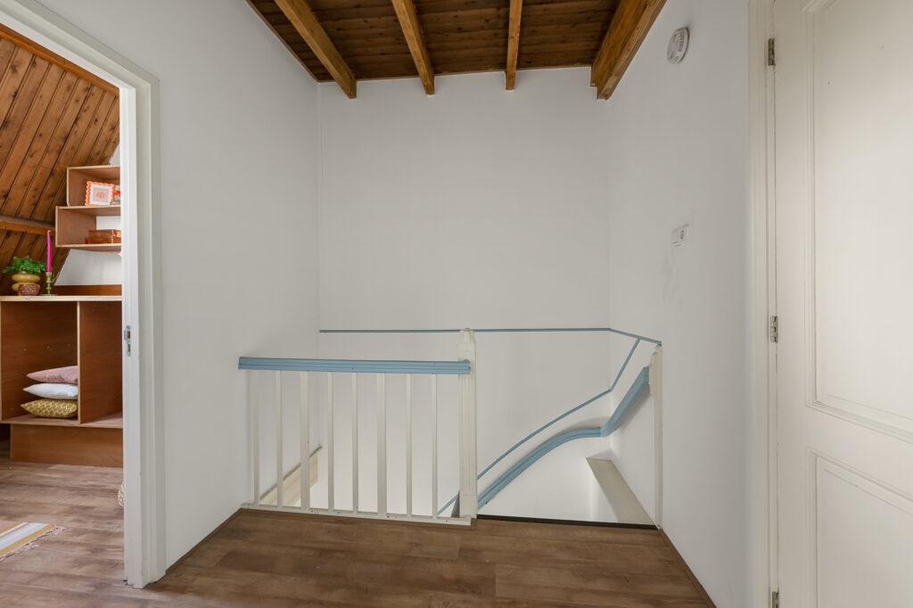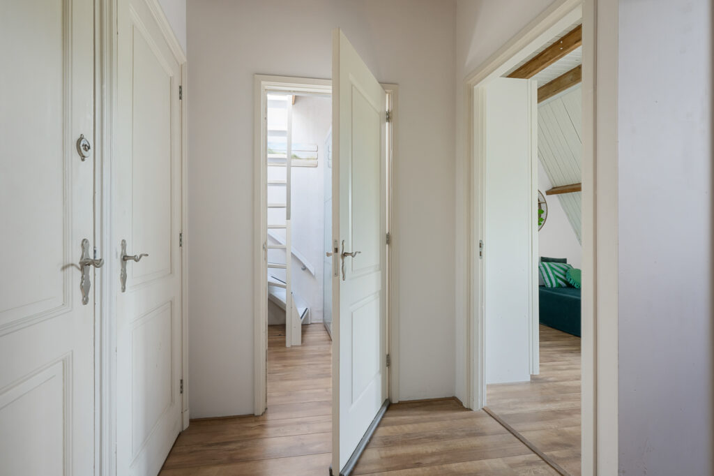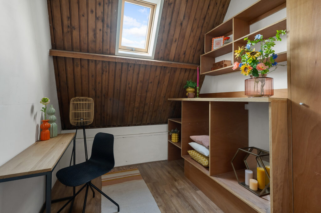 Een verdieping hoger ligt de slaapverdieping met een ruime overloop en drie kamers: twee royale slaapkamers en een derde kamer die nu dienstdoet als werkkamer, maar net zo goed kan functioneren als extra slaapkamer of walk-in. De badkamer is royaal opgezet en uitgerust met een vrijstaand ligbad, inloopdouche, tweede toilet en dubbele wastafel. Vanaf de overloop leidt een vaste trap naar het dakterras.