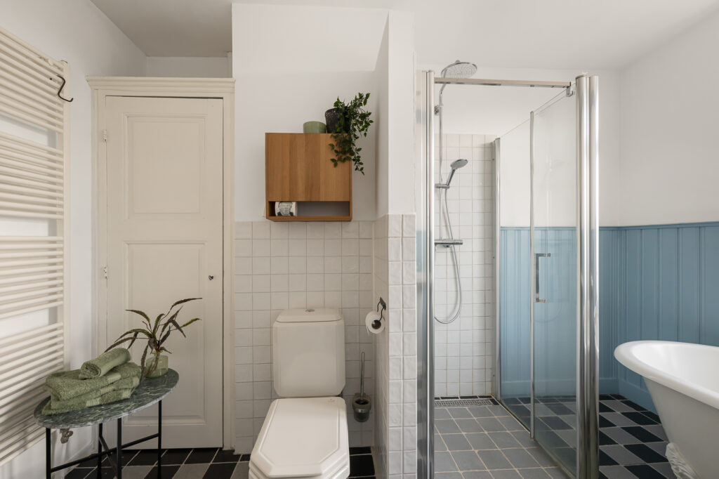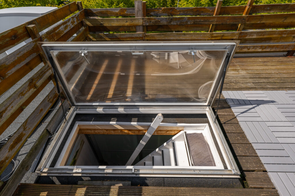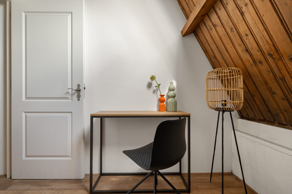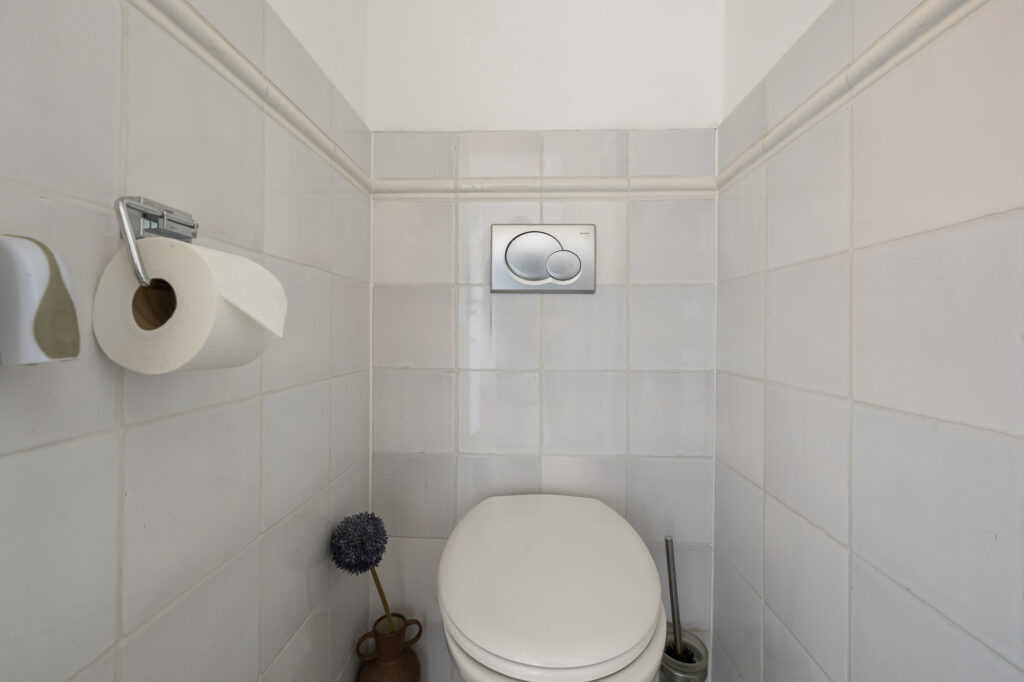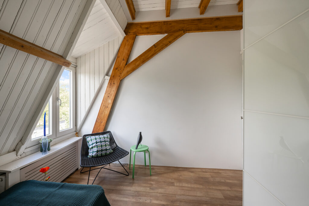 One floor up is the sleeping level with a generous landing and three rooms: two spacious bedrooms and a third room currently used as a study, which would also work well as an extra bedroom or walk-in closet. The bathroom is generously sized and equipped with a freestanding bathtub, walk-in shower, second toilet and double washbasin. From the landing, a fixed staircase leads up to the roof terrace.