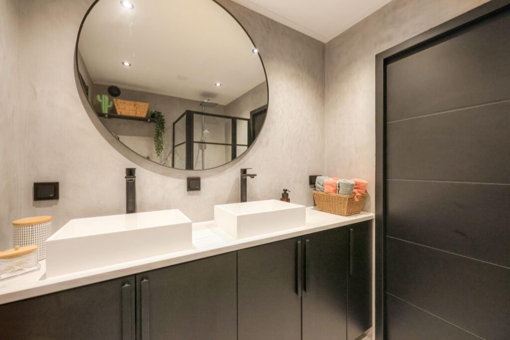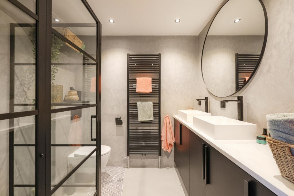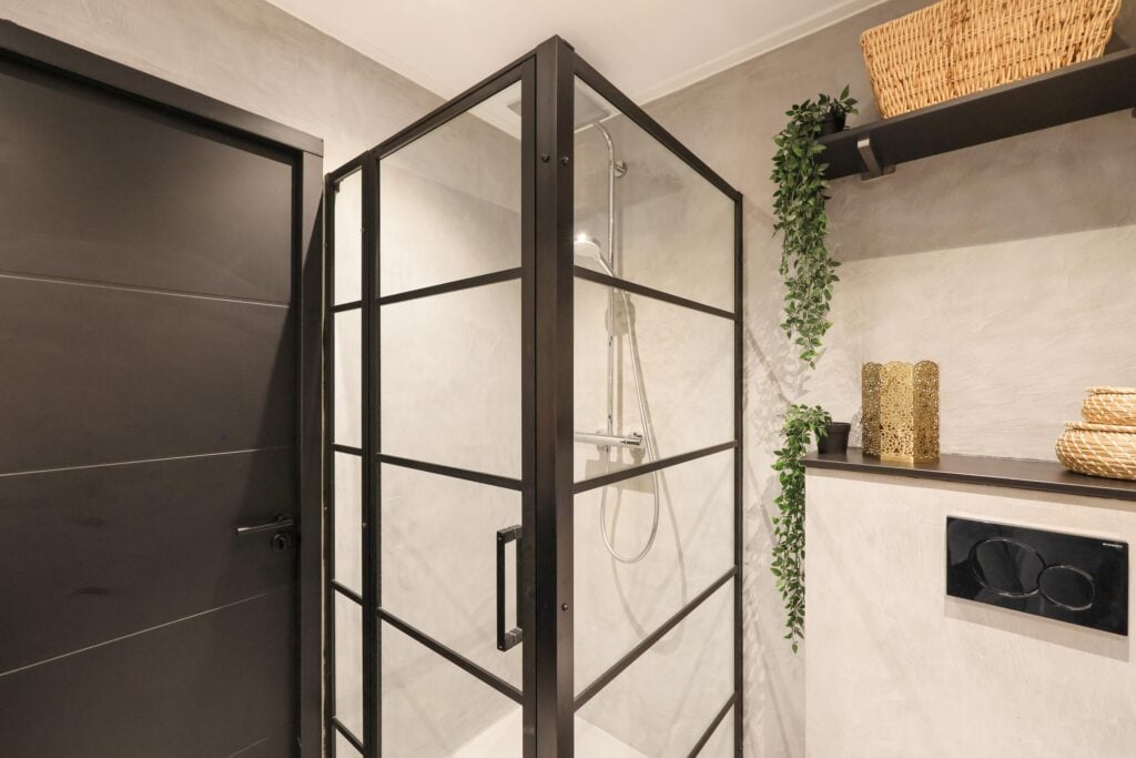 – de badkamer is vernieuwd en strak afgewerkt met douchehoek, toilet, groot wastafelmeubel en kunststof gietvloer;