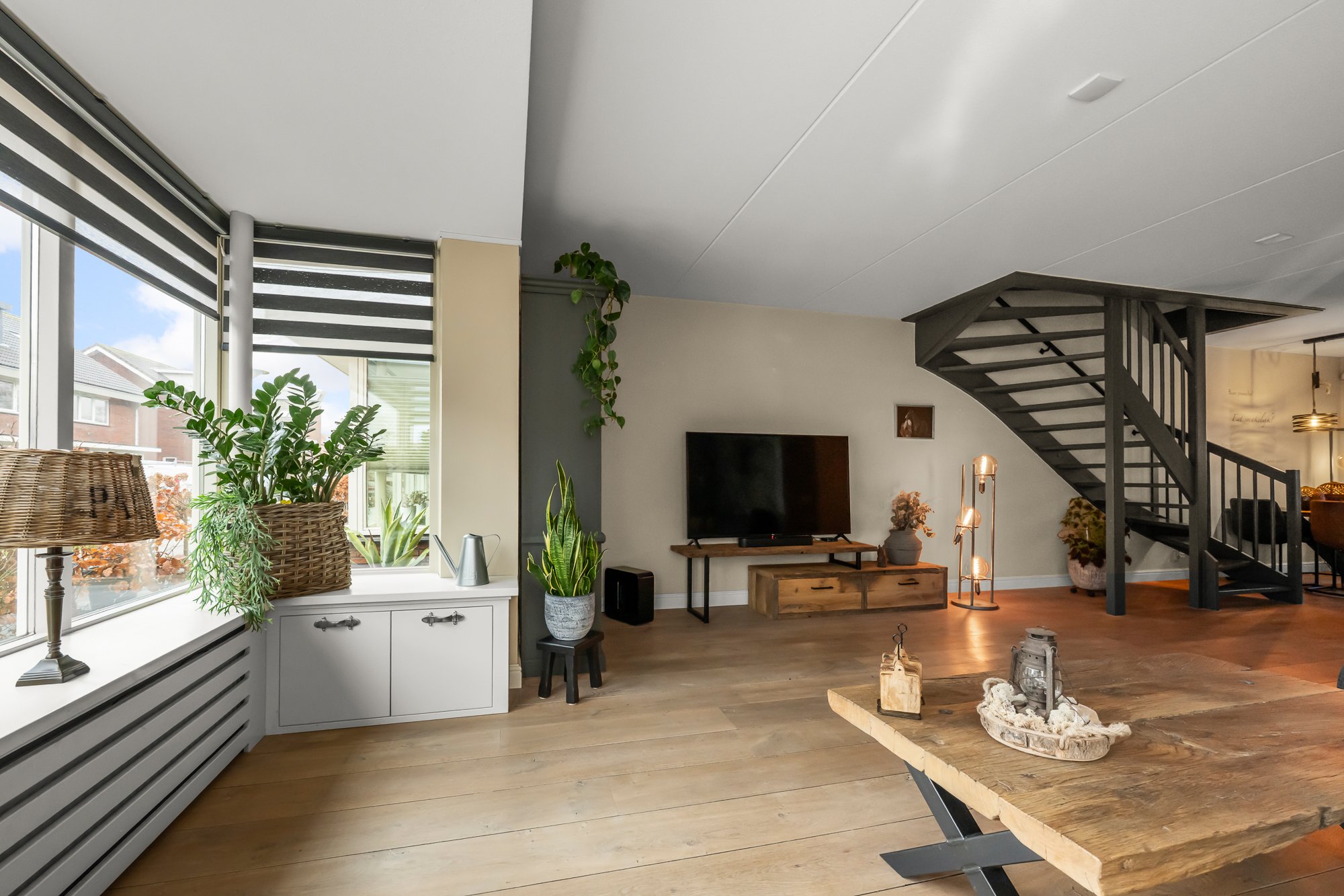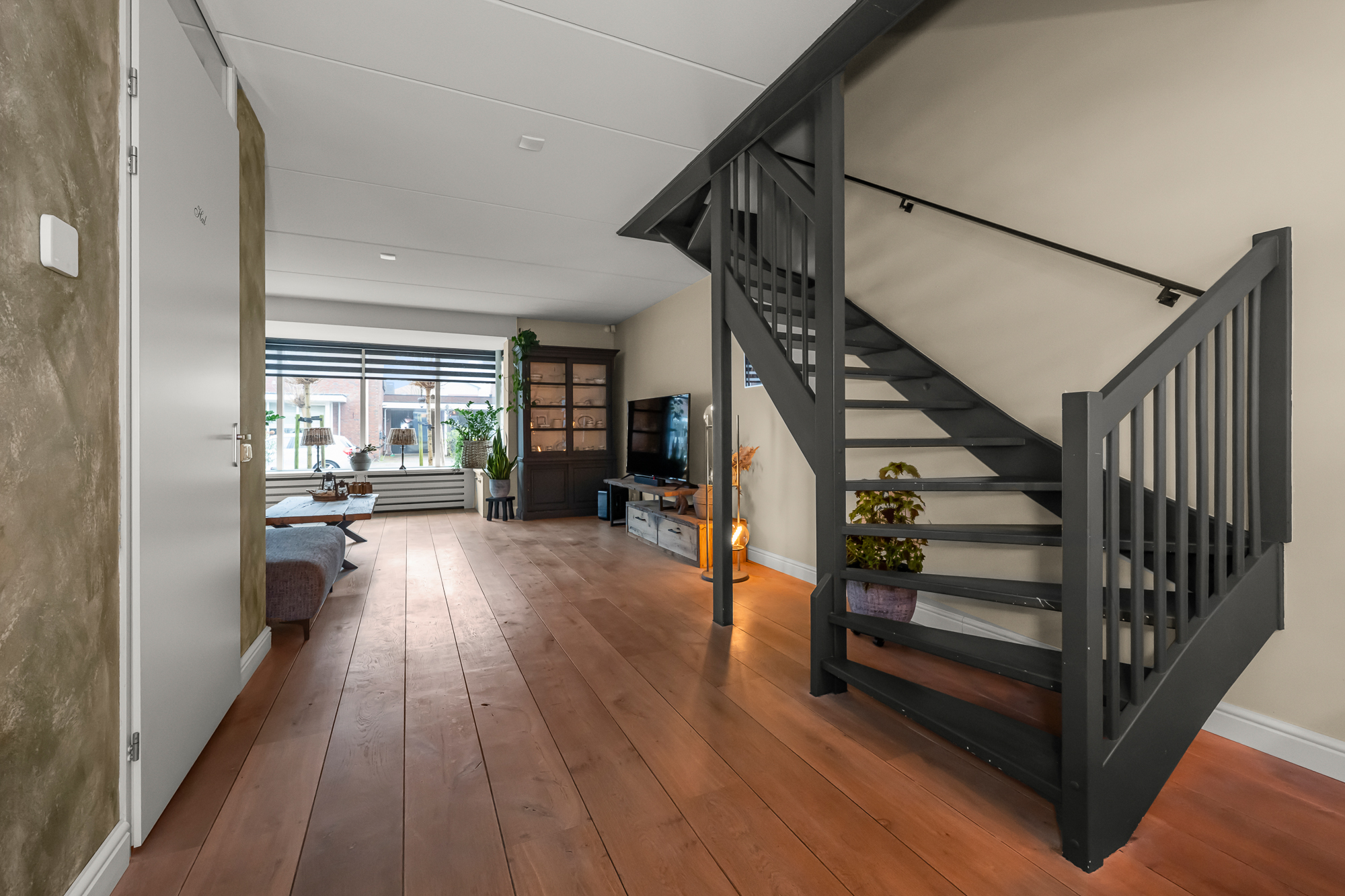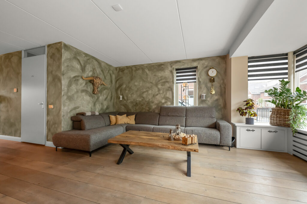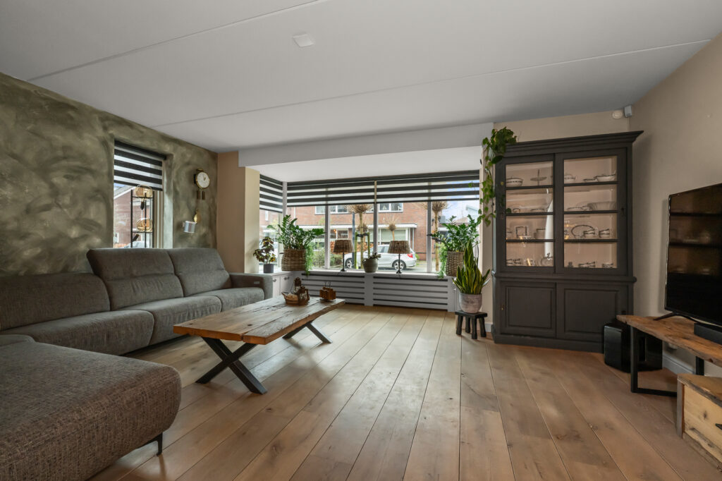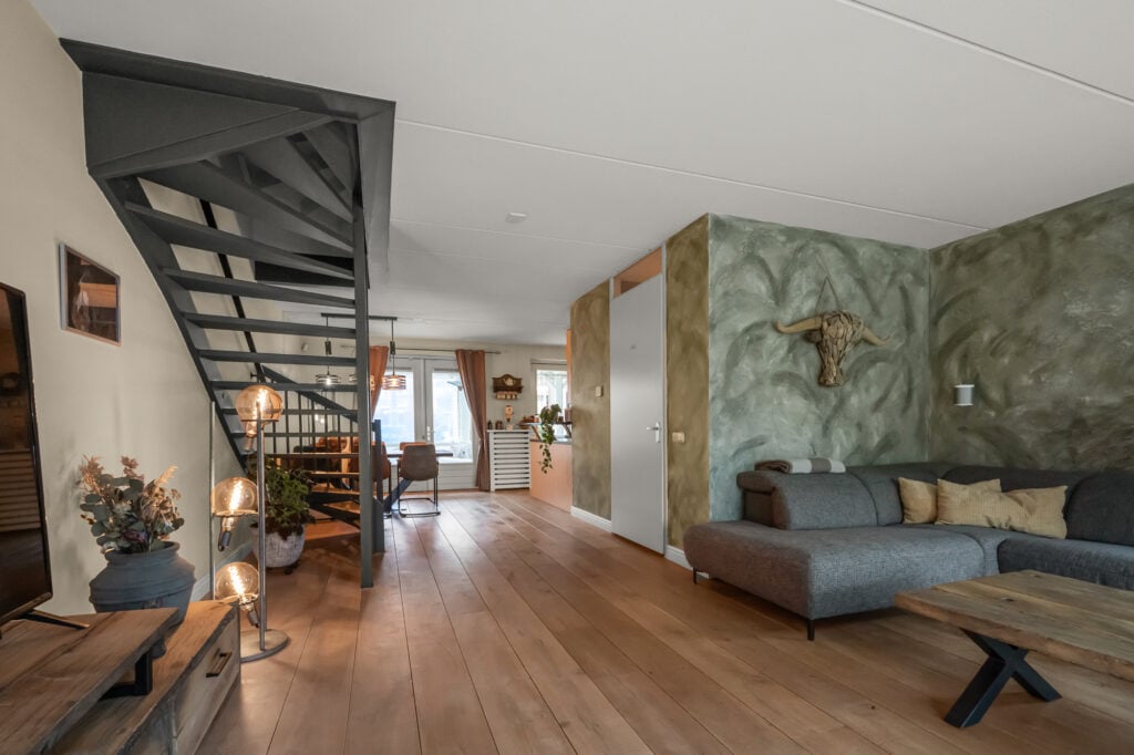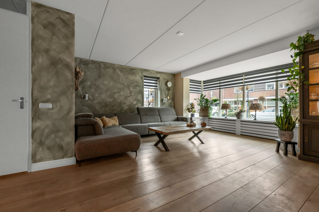 Op de begane grond is er een riante leefruimte, waar licht en ruimte direct opvallen. Grote raampartijen zorgen voor een prettige lichtinval en de brede woonkamer biedt volop mogelijkheden voor een comfortabele zithoek. De warme houten vloer en strak afgewerkte wanden dragen bij aan de fijne, rustige sfeer.
