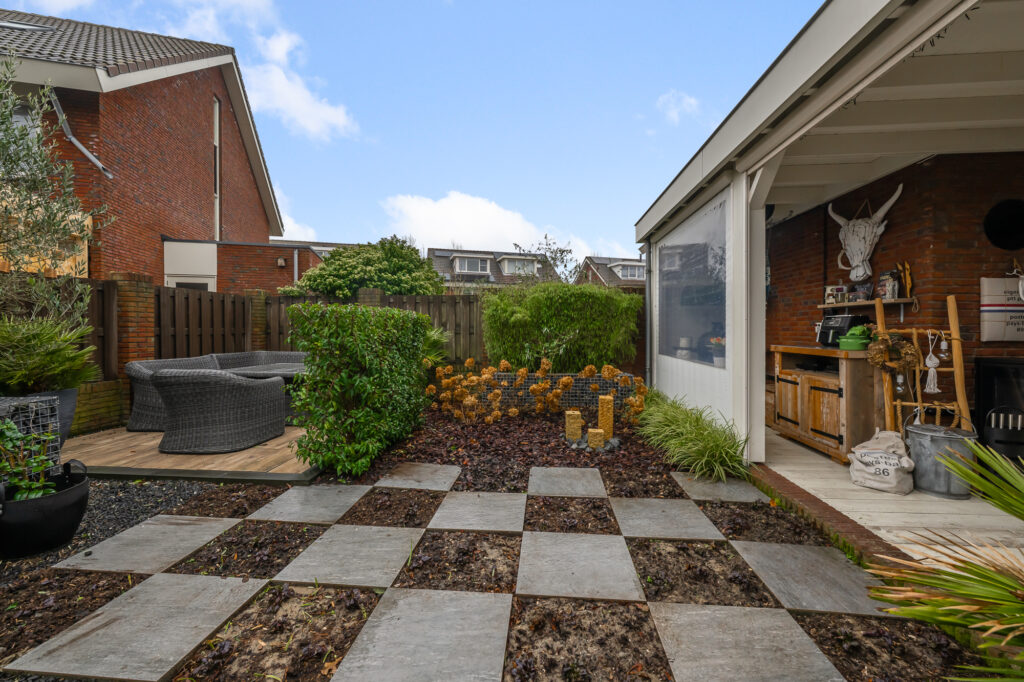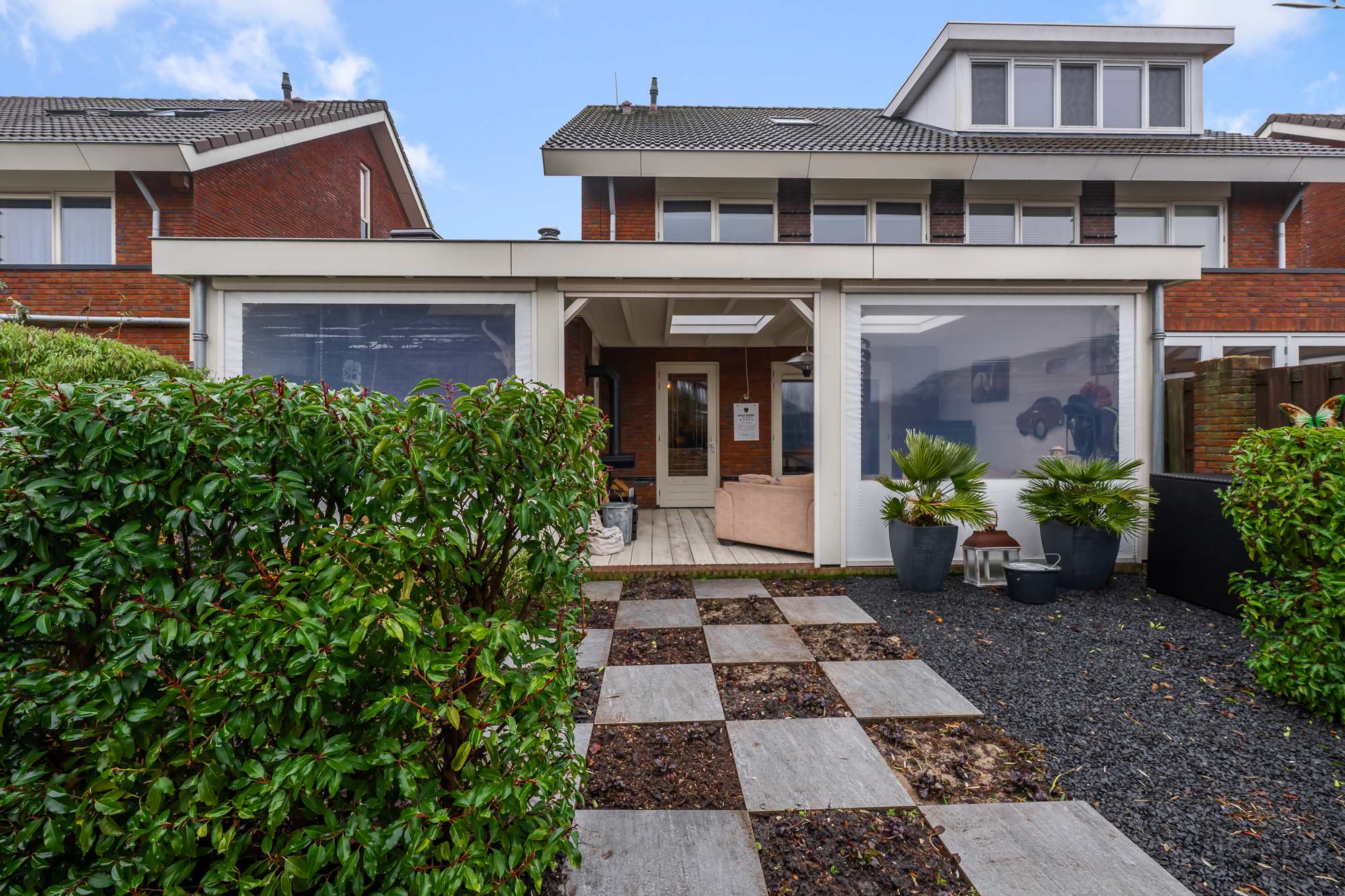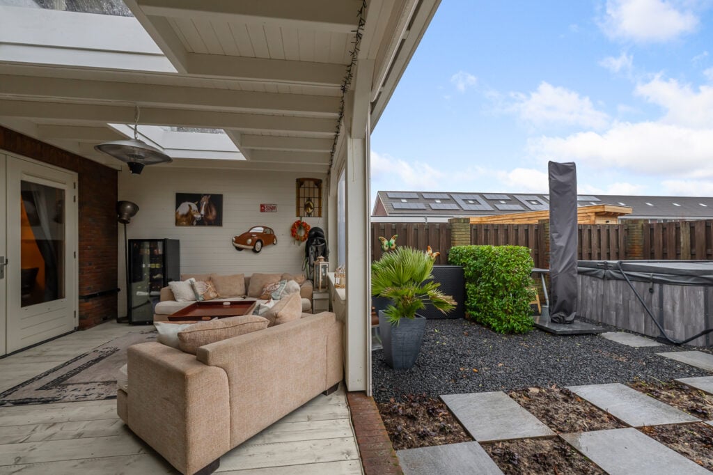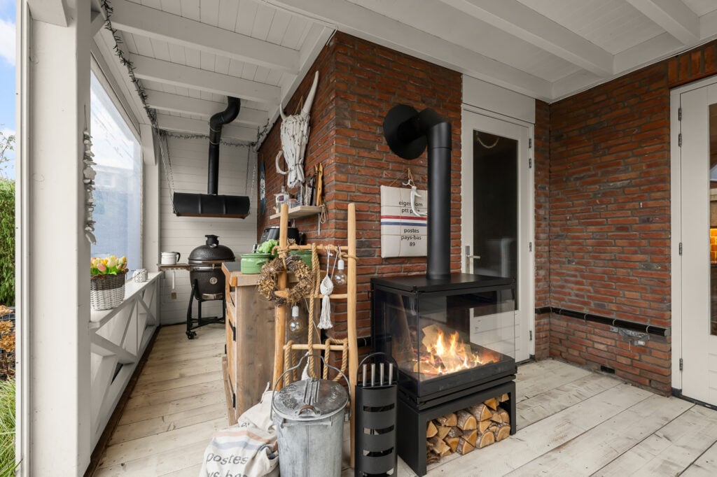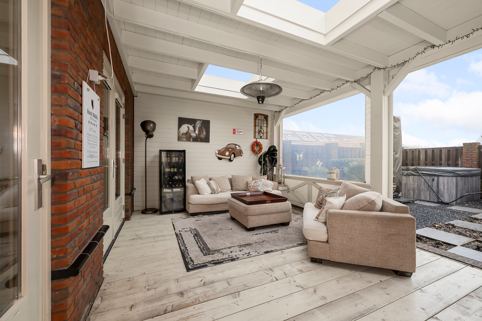 Aan de achterzijde is de woning in 2015 uitgebreid met een prachtige veranda. Deze overdekte buitenruimte voelt als een verlengstuk van de woonkamer en is voorzien van een houtkachel, waardoor je hier in alle seizoenen comfortabel kunt zitten. Dankzij de grote raampartijen en schuifdeuren is er een mooie verbinding met de tuin. De achtertuin is verzorgd aangelegd en biedt veel privacy. Er zijn meerdere zitplekken gecreëerd, waardoor je op elk moment van de dag een fijne plek kunt kiezen.