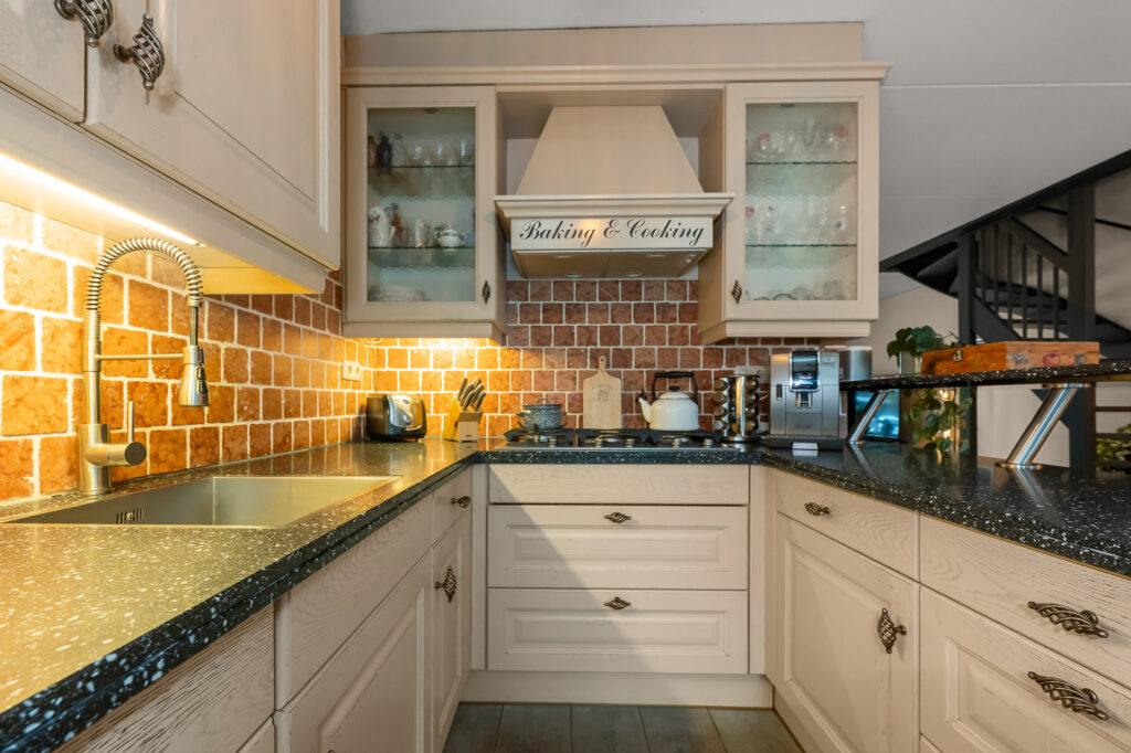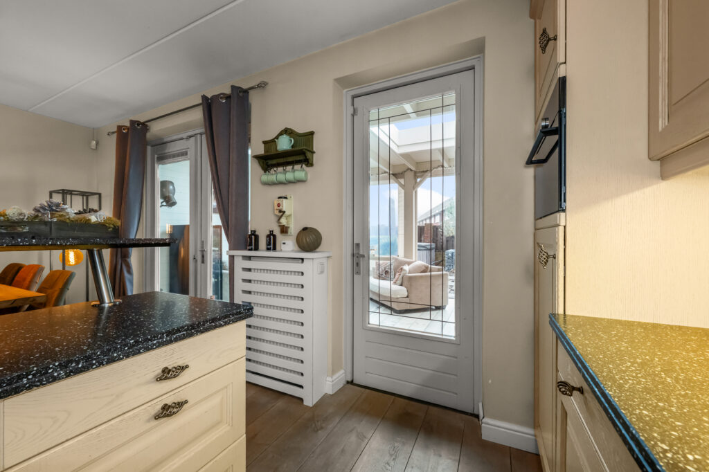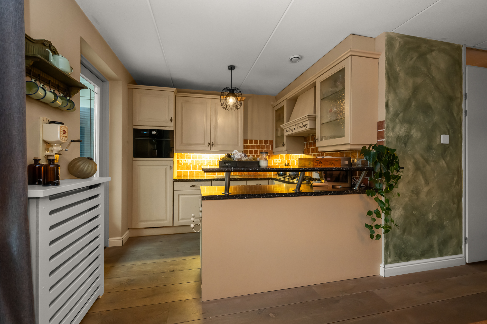 De open keuken vormt het centrale punt van de begane grond en is uitgevoerd in een landelijke stijl met veel kastruimte, een robuuste werkblad en diverse inbouwapparatuur.