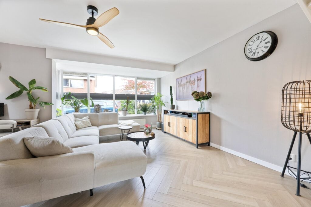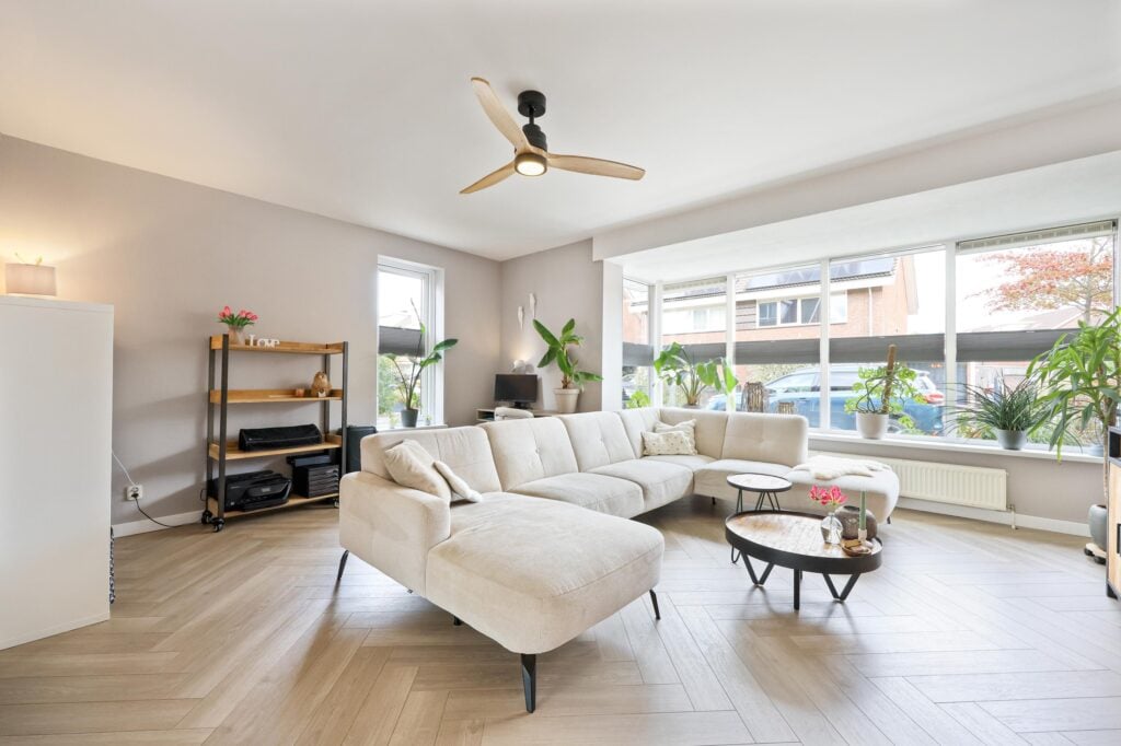 De royale woonkamer met visgraat vloer en grote raampartijen straalt warmte en licht uit. De strakke afwerking, rustige kleuren en moderne verlichting zorgen voor een uitnodigende sfeer. Aan de tuinzijde bevindt zich een prachtige, volledig afsluitbare serre met een zonnescherm. Dit is een heerlijke plek waar binnen en buiten moeiteloos in elkaar overlopen. Hier kun je het hele jaar door ontspannen, dineren of genieten van het uitzicht op de groene tuin en het water.