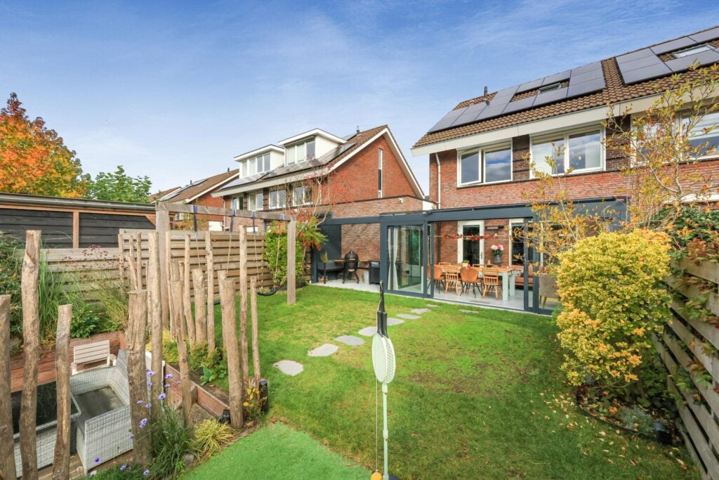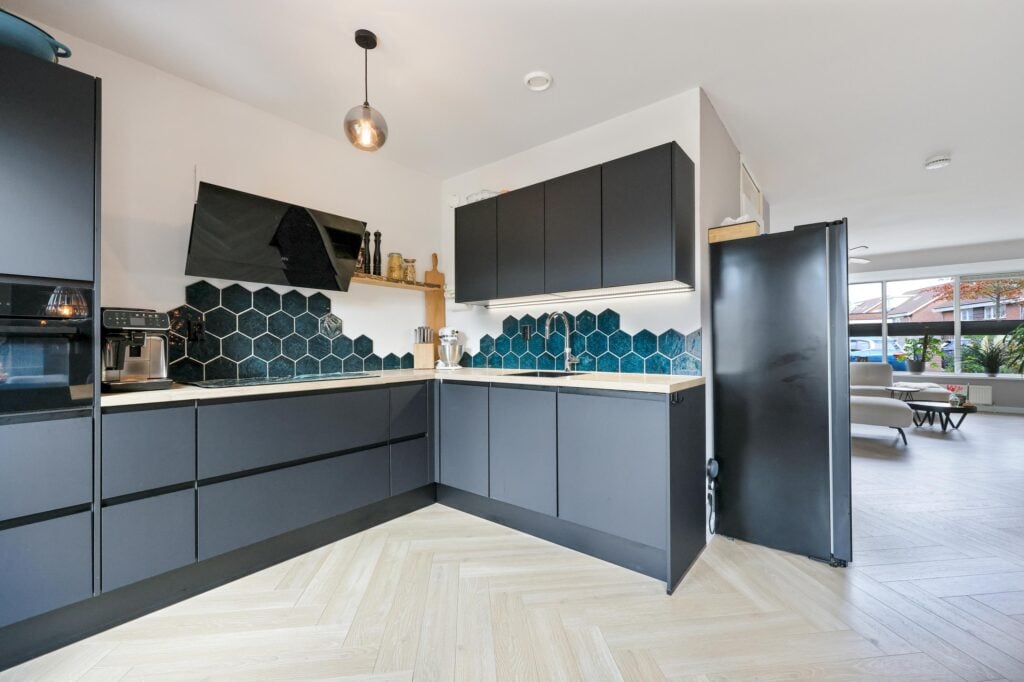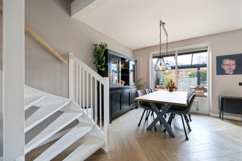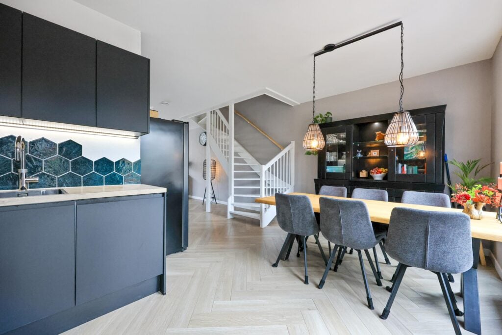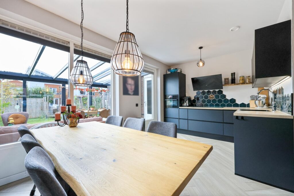 De luxe keuken (2020) vormt een echte eyecatcher. De stijlvolle donkere kasten, het houten werkblad en de moderne wandtegels geven de ruimte karakter. Uiteraard is de keuken voorzien van moderne inbouwapparatuur, waaronder een inductiekookplaat, combi-oven en vaatwasser. Vanuit de keuken is er direct zicht op de serre en de tuin, waardoor koken en samenzijn hier perfect samengaan.